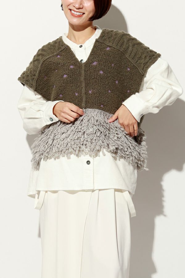 異素材の表情で魅せる、大人の立体ニットベスト。 ニットならではの異なる立体感や風合いを持つ編み地を多彩に組み合わせ、冬のスタイリングを華やかに装うベストをご用意しました。 一見シンプルなシルエットながら、肩にかけて自然に落ちるドロップラインが、ネックまわりに抜け感を与え、肩まわりに程よいゆとりを生み出すことで華奢な印象を演出します。胸元からハイウエスト位置にかけては、程よくハリ感ある編地が身体のラインから離れてきれいなドレープが出来ます。 ヘムラインにはループ編みを施し、気になるウエストラインをカバーしつつ、視覚的にウエスト位置を高く見せるデザインに。サイドスリットが動きとレイヤードのしやすさを引き立て、どこから見てもバランスの取れた美しいシルエットを叶えます。 お手持ちのシャツやTシャツに重ねるだけで、絶妙な厚みでフィット&ドレープシルエットを纏え、女性の美しい洗練スタイルを演出。一枚加えるだけで、圧倒的な存在感と魅力を引き出す、主役級のコーディネートが完成します。