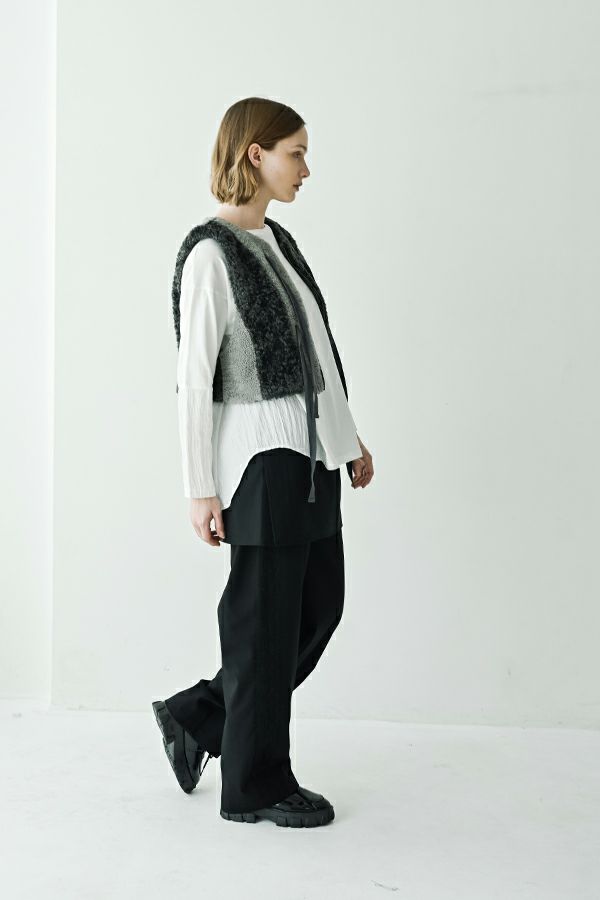 異素材ミックスが映える、洗練ショートボアベスト。 纏うだけで洒落感高まる、秋冬の主役ベスト。異素材のコントラストが引き立つデザインで、いつものコーディネートにさっと羽織るだけで季節感とスタイルに奥行きをプラスします。 ゆったりと大きめのアームホールは、ボリュームスリーブや袖広のインナーとも相性抜群。レイヤードに悩まず、自在な着こなしが叶います。フロントにはラフに結べるリボンテープをあしらい、抜け感のあるアクセントを添えました。 ワンピースに合わせて柔らかさを演出したり、デニムでカジュアルに振ったスタイリングにも好相性。ジャケットやライトアウターとの合わせも今年らしくてオススメです。