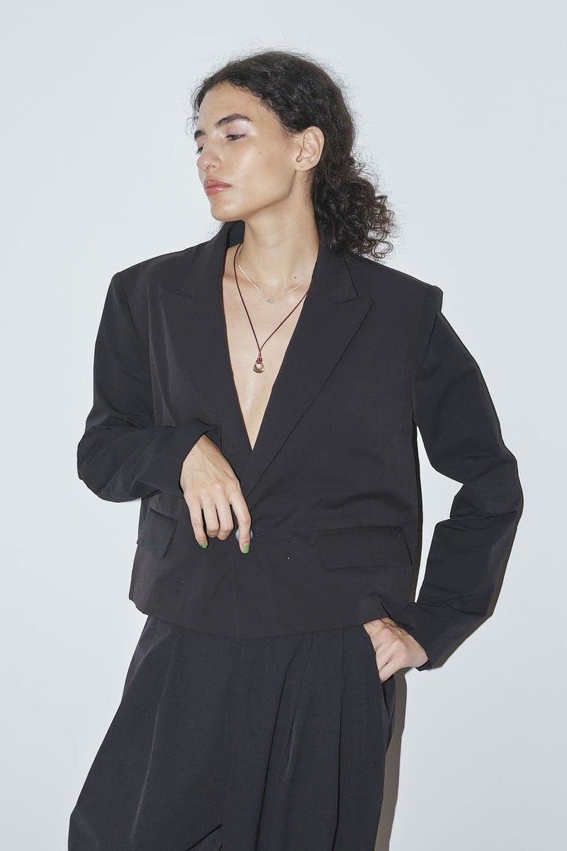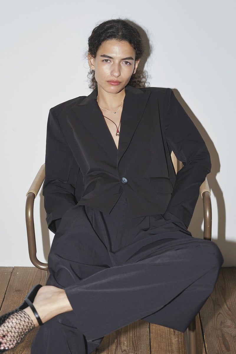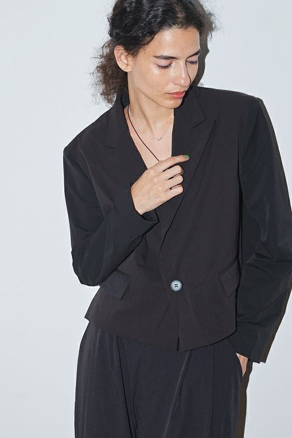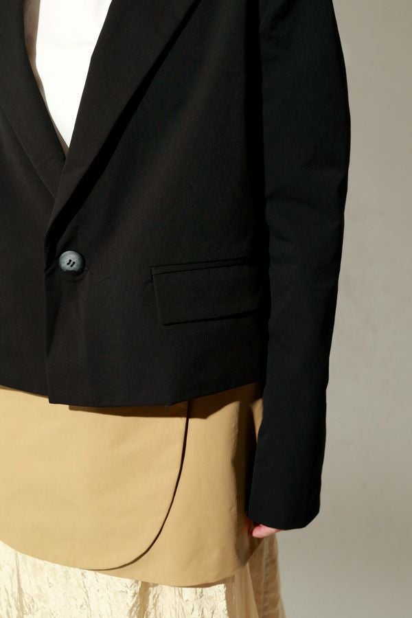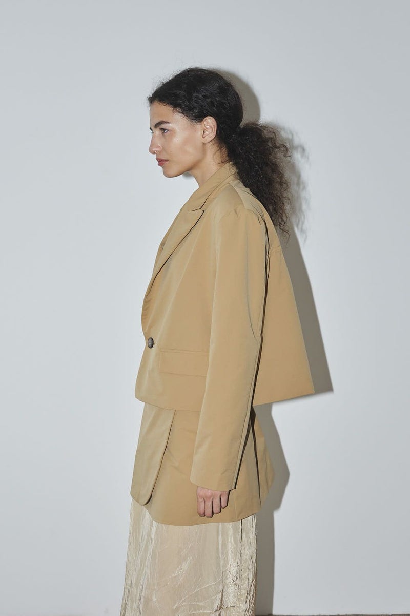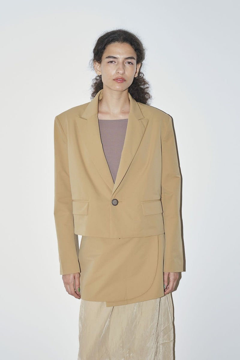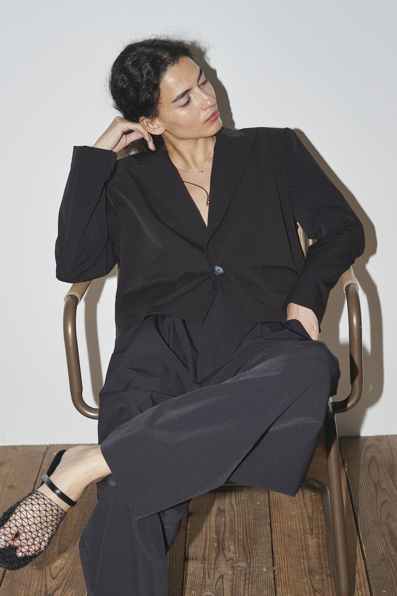 軽やかに纏う、立体美と機能を備えたジャケット。 バックギャザーで立体感を演出したコンパクトジャケット。 肩パットが自然な華やぎと品格のあるシルエットを生み出し、ストレッチ素材で動きやすさも叶えました。 さらにUVカット機能とシワになりにくい素材を採用し、春夏の外出や旅行、オフィスシーンまで幅広く活躍。 軽やかで上品、そして機能的な一着として長く愛用できる万能ジャケットです。 Tシャツやリネンパンツ、スニーカーに合わせれば、肩パットがコーディネートを自然に引き締める春夏カジュアルスタイルに。 シアーシャツやハイウエストパンツと組み合わせれば、美しいシルエットを保ちながら軽やかできちんと感のあるオフィススタイルが完成します。