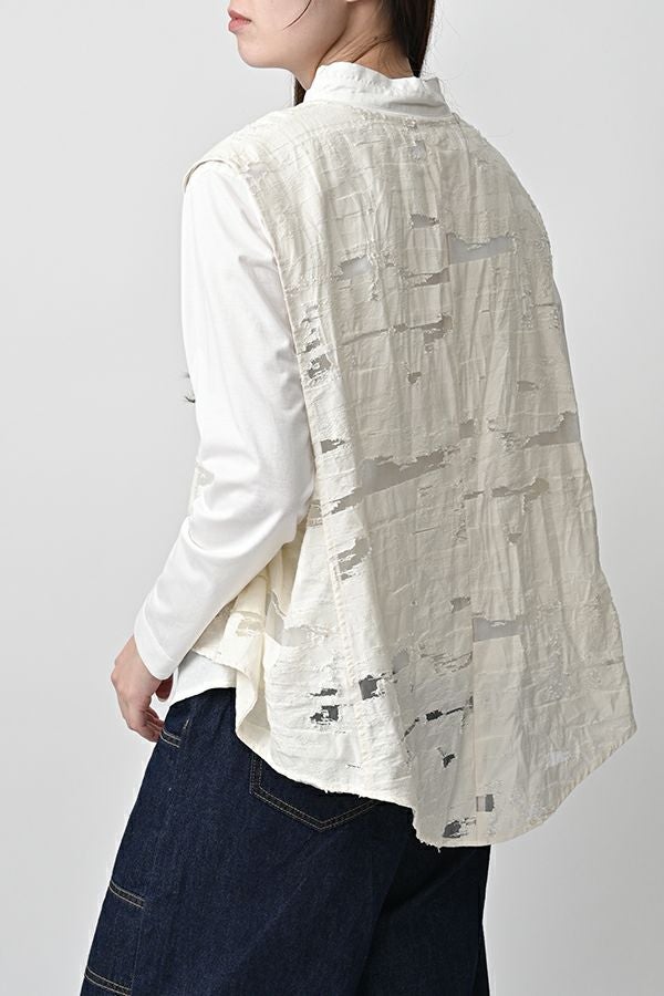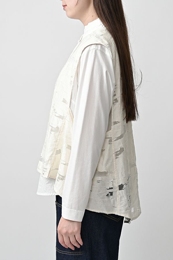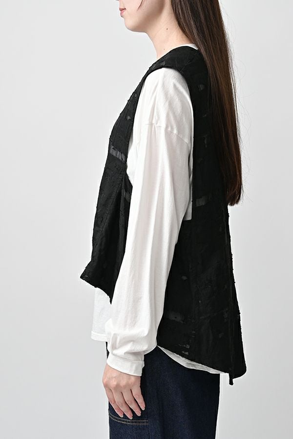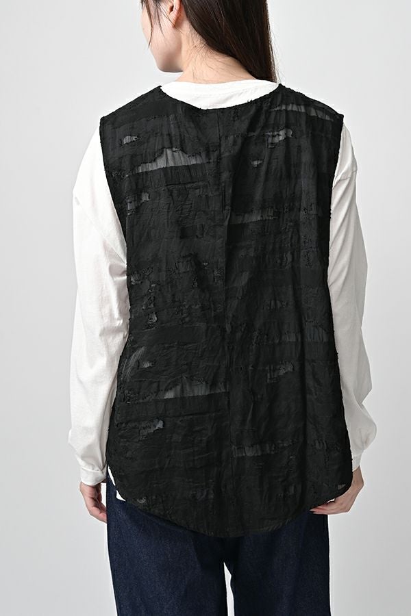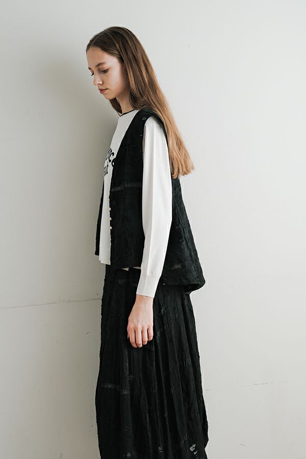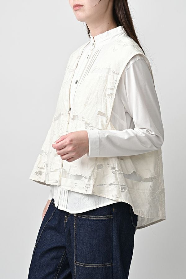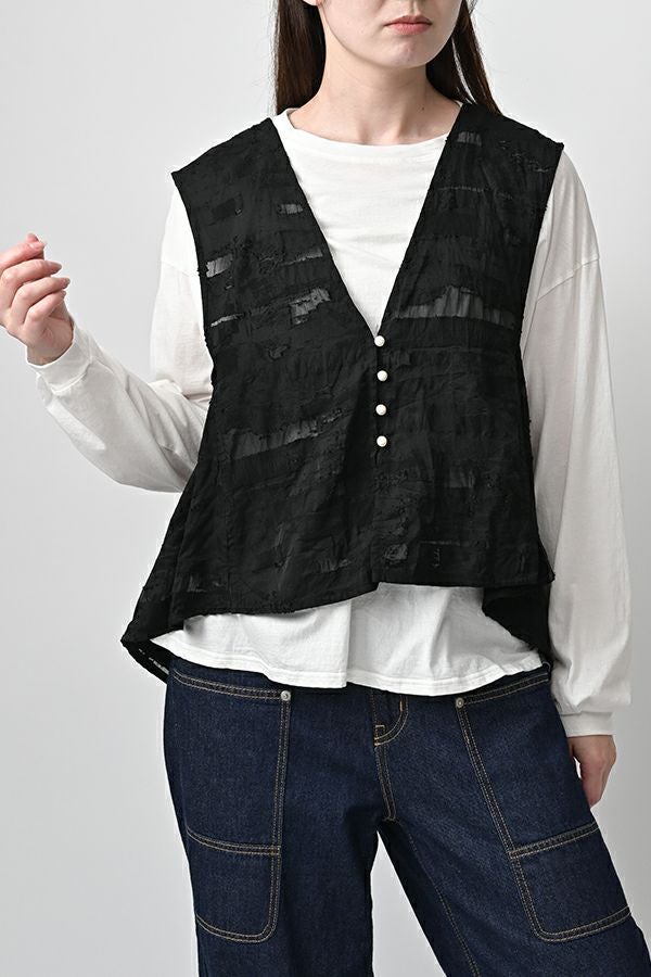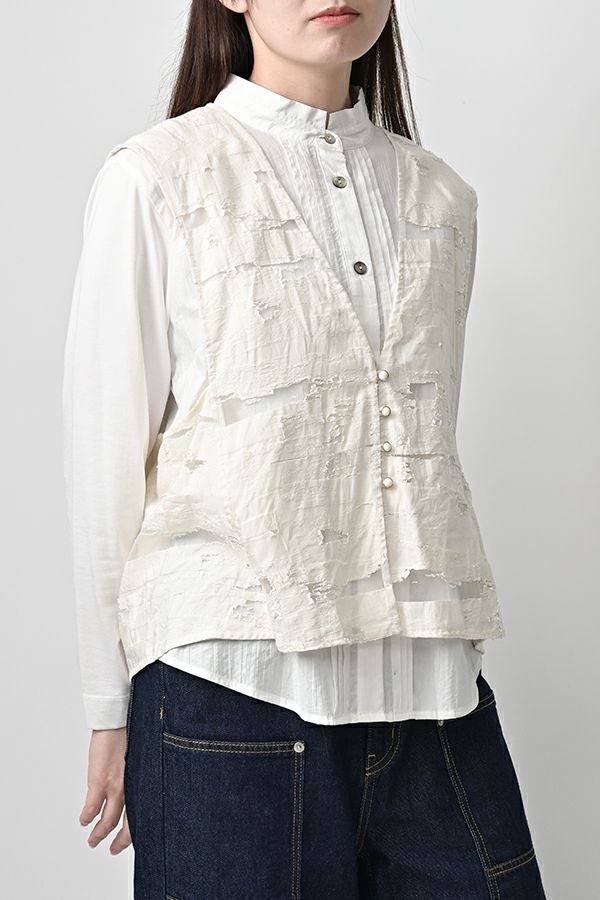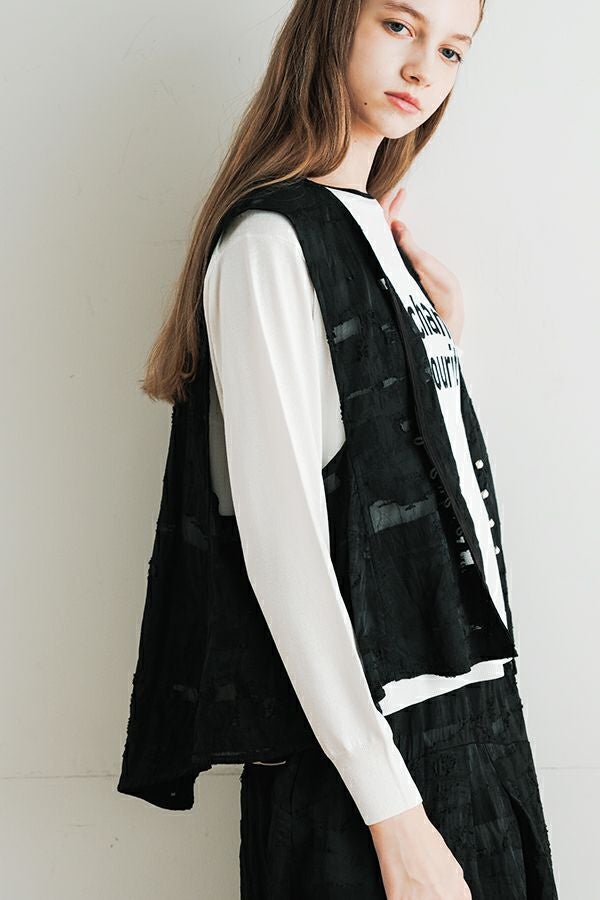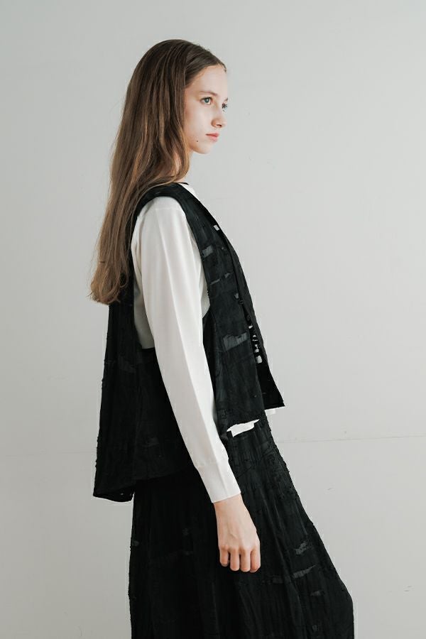 透け感と立体感が織りなす、ラグジュアリージャガードベスト。 ランダムに織り上げたジャガード素材は、経糸と横糸の一部を飛ばして織り、その浮いた糸をカットすることで、透け感のあるシアーな柄とふくらみのあるベースの二重構造を実現。凹凸感と奥行きのある立体的な表情が、高級感を醸し出します。 洗い加工を施しても風合いを損なわず、ラグジュアリーカジュアルとしてデニムや洗いざらしのTシャツとのコーディネートも楽しめる一枚。アクセントのパール風ボタンやスクエアアームホールのディテールが、シンプルながら洗練された印象を与えます。 春先はもちろん、シーズンレスで着回し可能な万能ベスト。上質な素材感とデザインで、日常に華やぎをプラスするアイテムです。 ●シアージャガードスカート(26158-8769M-R)とセットアップ可