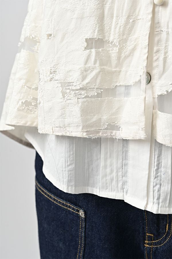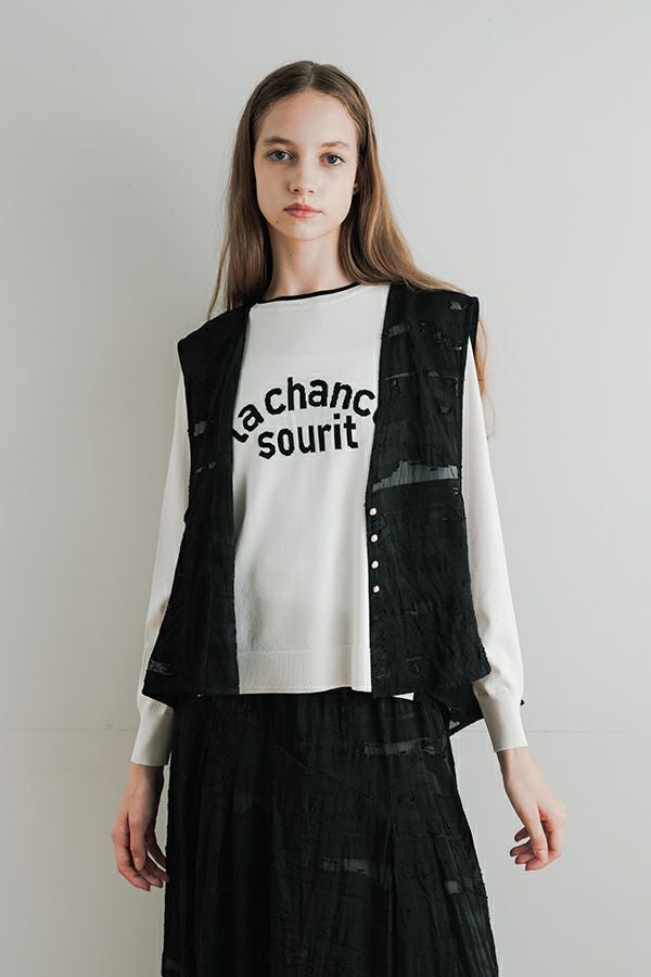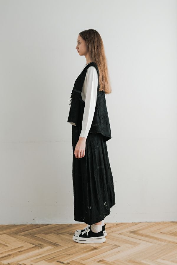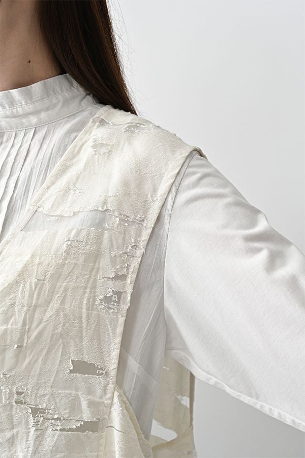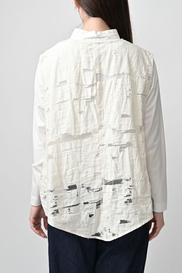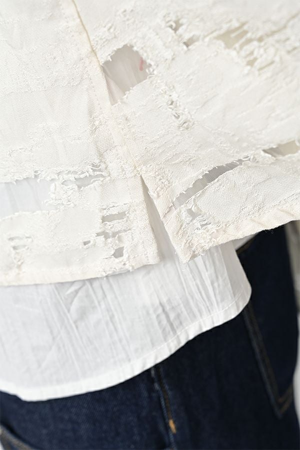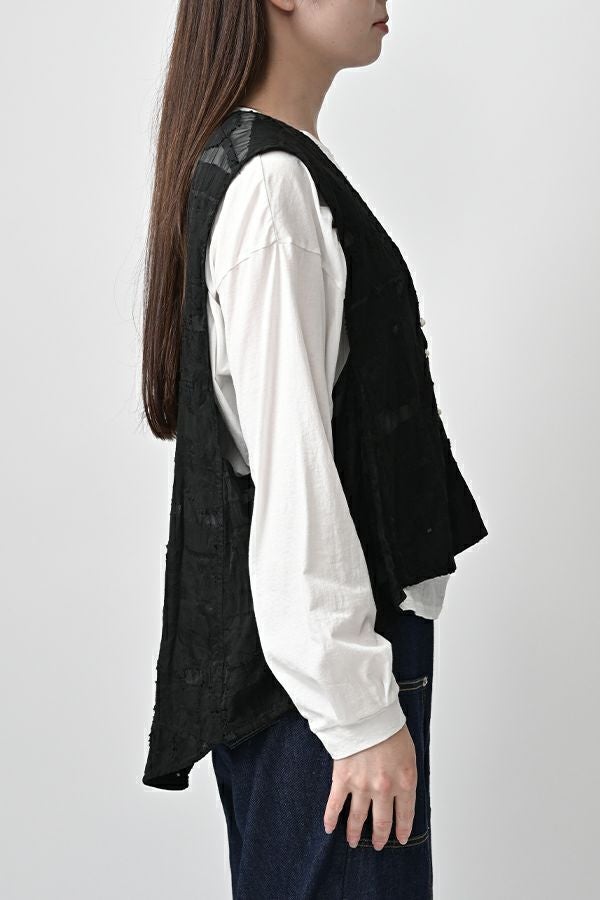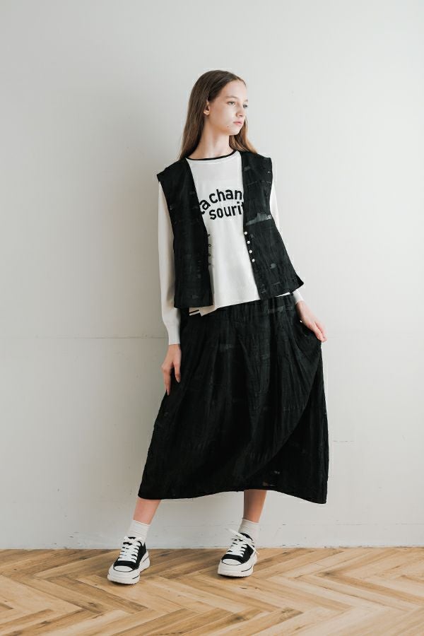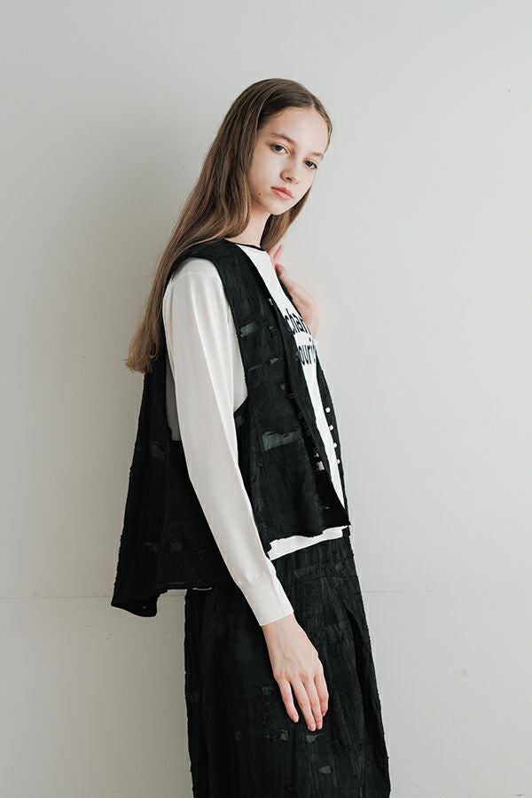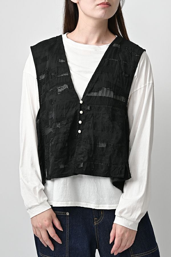 透け感と立体感が織りなす、ラグジュアリージャガードベスト。 ランダムに織り上げたジャガード素材は、経糸と横糸の一部を飛ばして織り、その浮いた糸をカットすることで、透け感のあるシアーな柄とふくらみのあるベースの二重構造を実現。凹凸感と奥行きのある立体的な表情が、高級感を醸し出します。 洗い加工を施しても風合いを損なわず、ラグジュアリーカジュアルとしてデニムや洗いざらしのTシャツとのコーディネートも楽しめる一枚。アクセントのパール風ボタンやスクエアアームホールのディテールが、シンプルながら洗練された印象を与えます。 春先はもちろん、シーズンレスで着回し可能な万能ベスト。上質な素材感とデザインで、日常に華やぎをプラスするアイテムです。 ●シアージャガードスカート(26158-8769M-R)とセットアップ可