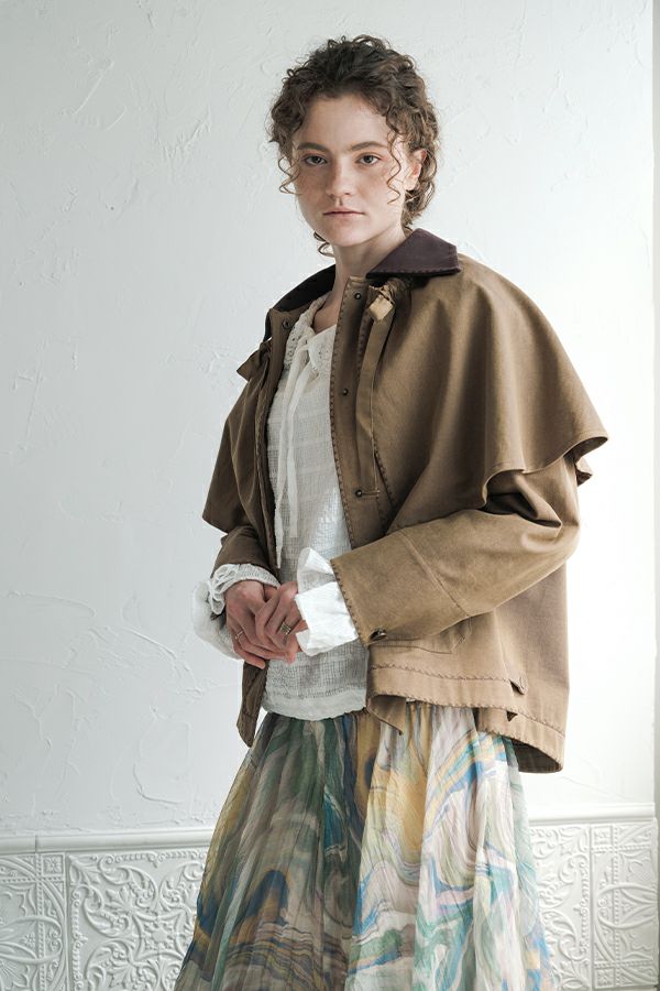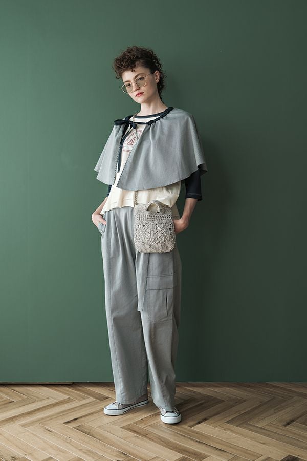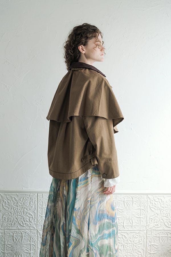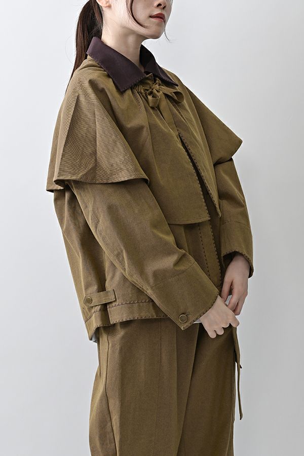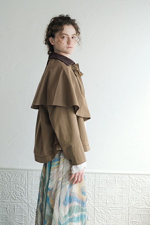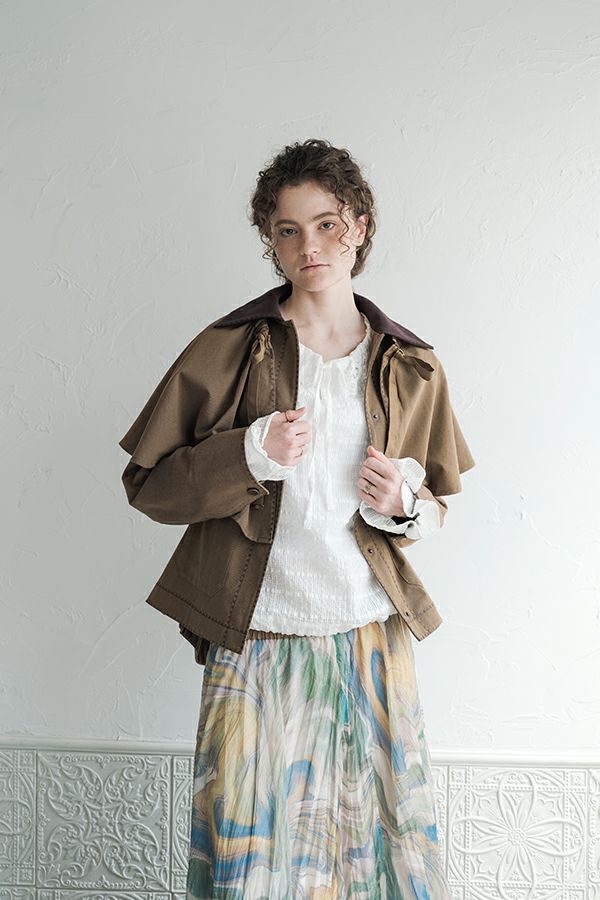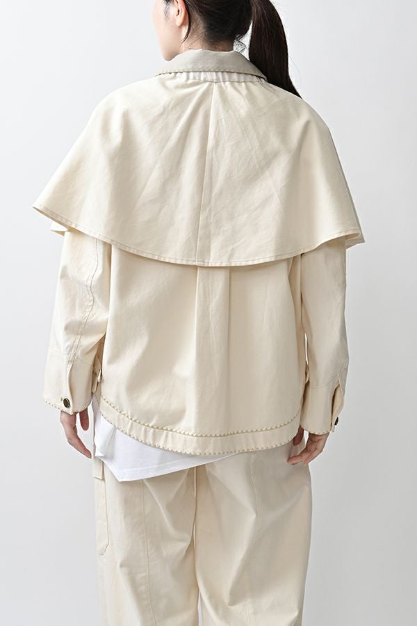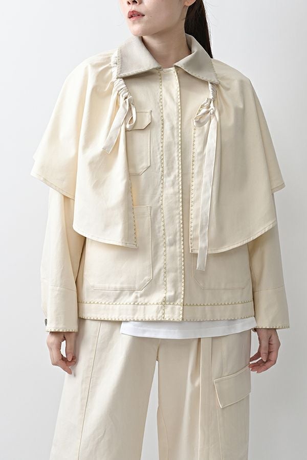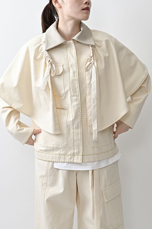 カジュアルに華を添える、大人フェミニンカバーオールジャケット。 しっかりとしたコットンツイル素材で仕立てた、程よいハリ感のあるアイテム。大きめポケットやルーズなサイズ感がカジュアルな印象を与えつつ、女性らしい柔らかなシルエットで着られるデザインです。襟と前中心に施した繊細な刺繍が、さりげなくアクセントを添えます。 取り外し可能なケープは腰に巻いたり、別のアイテムと合わせたりと自由にアレンジ可能で、遊び心のある一枚に。カジュアルに合わせるのはもちろん、甘めのレーススカートと合わせてフェミニンMIXスタイルにするのもおすすめ。幅広いテイストに取り入れられ、着こなしに新鮮さをプラスしてくれる大人のジャケットです。 ●セパレート使用可 ●カーゴパンツ(26158-9787D-G)とセットアップ可