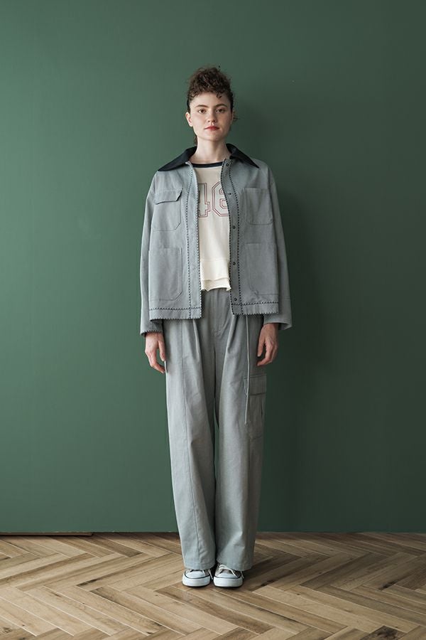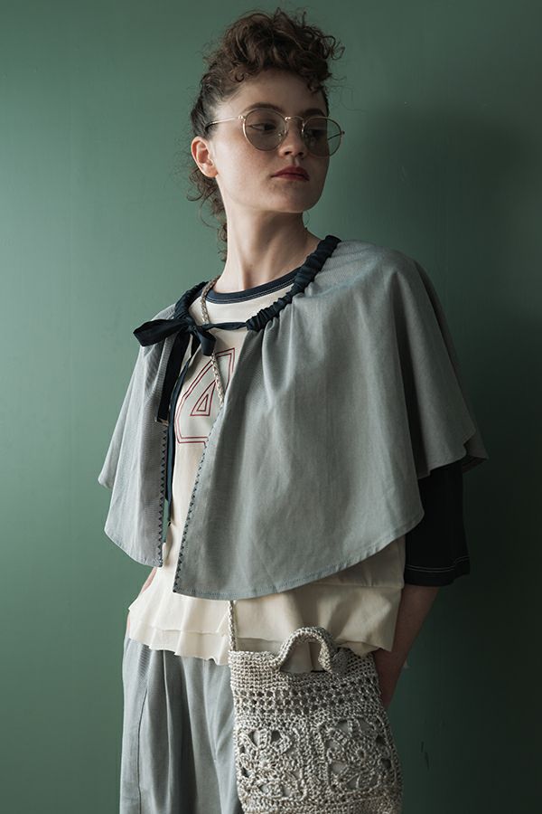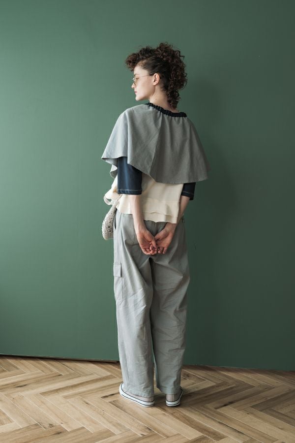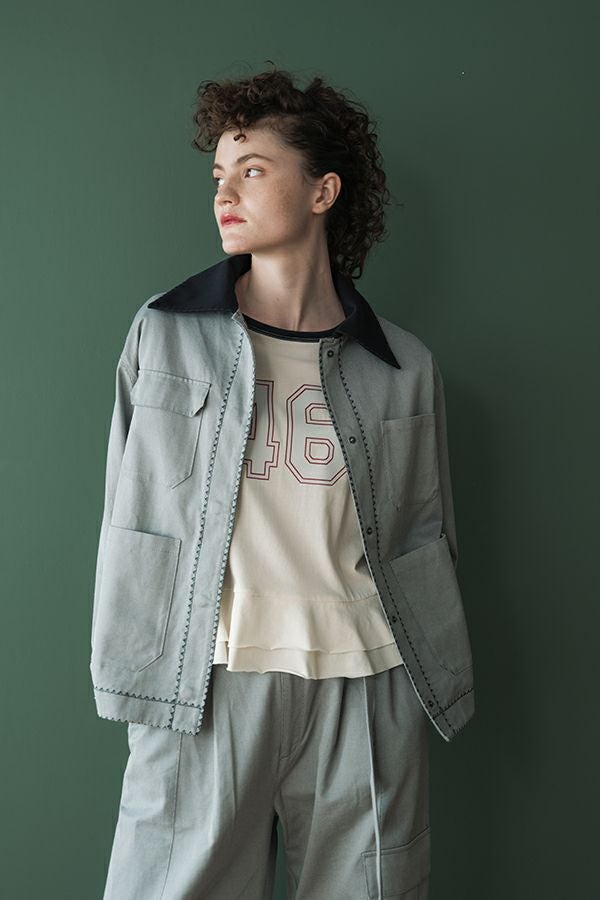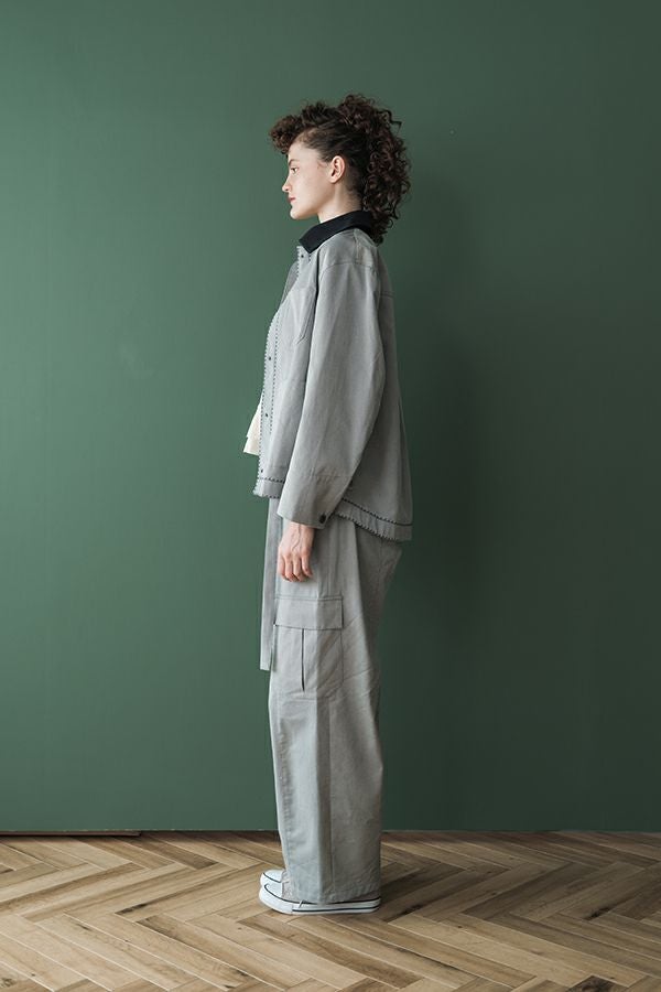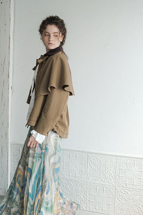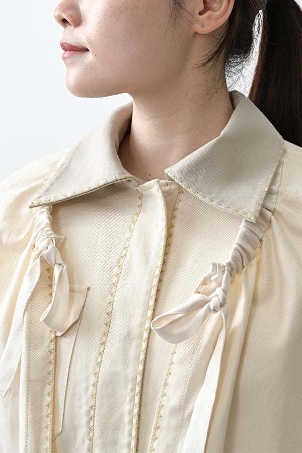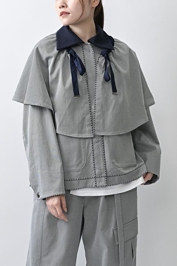 カジュアルに華を添える、大人フェミニンカバーオールジャケット。 しっかりとしたコットンツイル素材で仕立てた、程よいハリ感のあるアイテム。大きめポケットやルーズなサイズ感がカジュアルな印象を与えつつ、女性らしい柔らかなシルエットで着られるデザインです。襟と前中心に施した繊細な刺繍が、さりげなくアクセントを添えます。 取り外し可能なケープは腰に巻いたり、別のアイテムと合わせたりと自由にアレンジ可能で、遊び心のある一枚に。カジュアルに合わせるのはもちろん、甘めのレーススカートと合わせてフェミニンMIXスタイルにするのもおすすめ。幅広いテイストに取り入れられ、着こなしに新鮮さをプラスしてくれる大人のジャケットです。 ●セパレート使用可 ●カーゴパンツ(26158-9787D-G)とセットアップ可