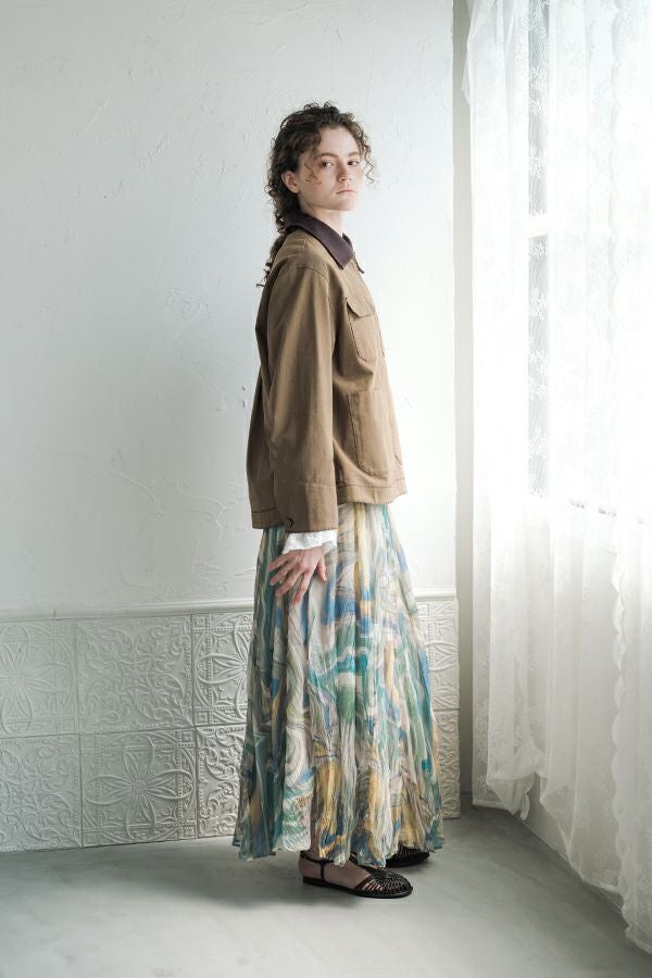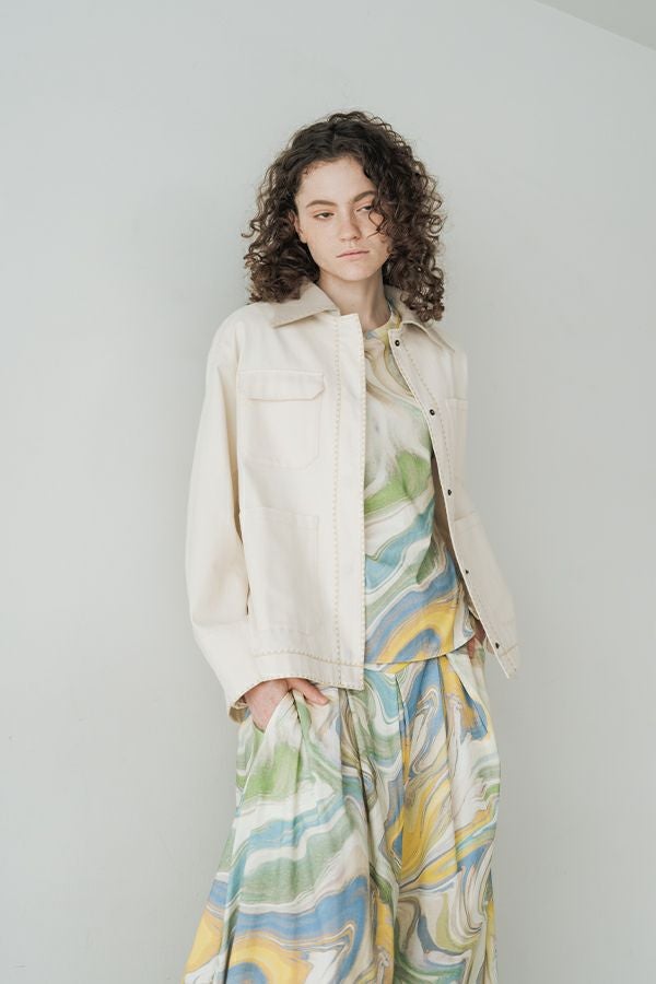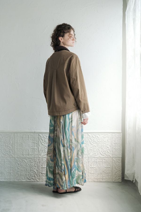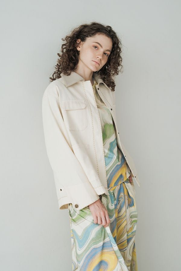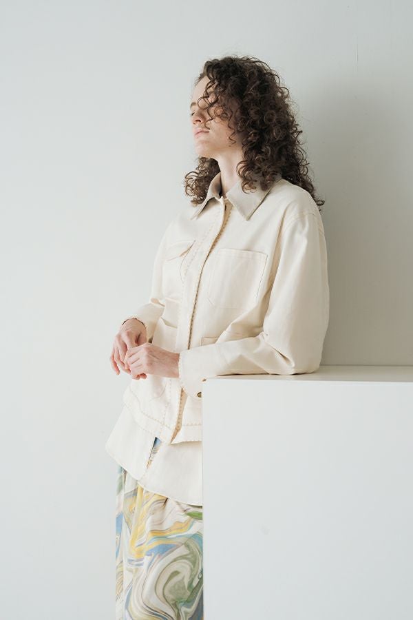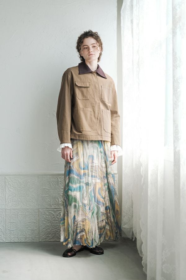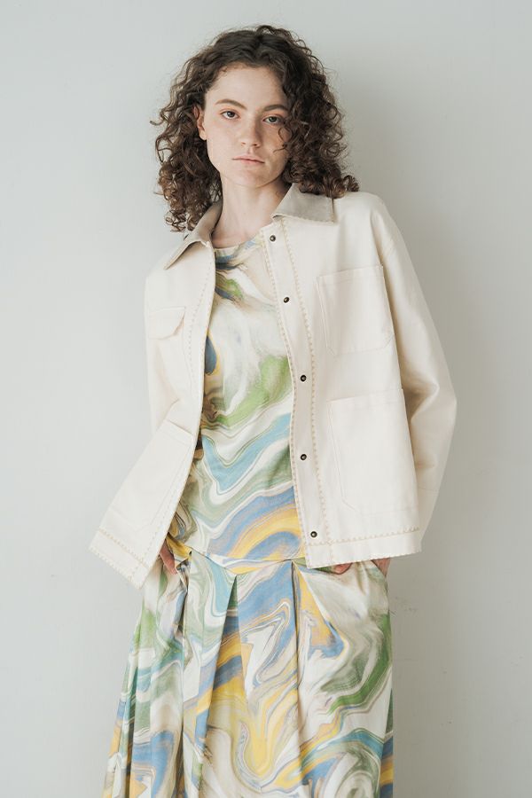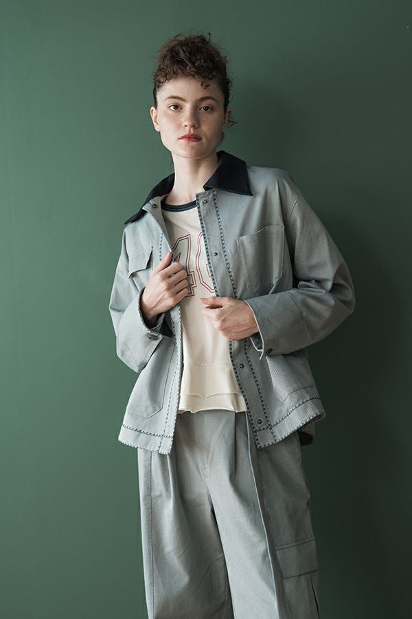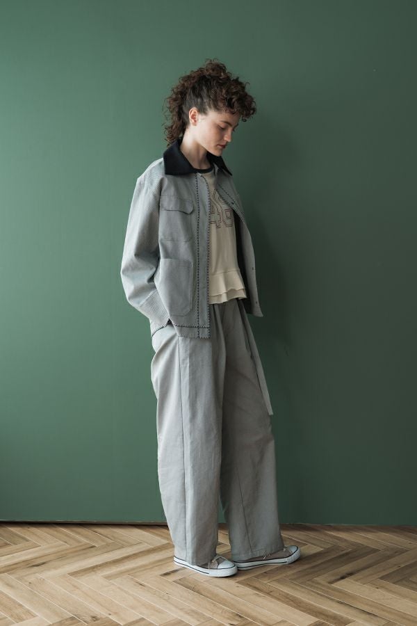 カジュアルに華を添える、大人フェミニンカバーオールジャケット。 しっかりとしたコットンツイル素材で仕立てた、程よいハリ感のあるアイテム。大きめポケットやルーズなサイズ感がカジュアルな印象を与えつつ、女性らしい柔らかなシルエットで着られるデザインです。襟と前中心に施した繊細な刺繍が、さりげなくアクセントを添えます。 取り外し可能なケープは腰に巻いたり、別のアイテムと合わせたりと自由にアレンジ可能で、遊び心のある一枚に。カジュアルに合わせるのはもちろん、甘めのレーススカートと合わせてフェミニンMIXスタイルにするのもおすすめ。幅広いテイストに取り入れられ、着こなしに新鮮さをプラスしてくれる大人のジャケットです。 ●セパレート使用可 ●カーゴパンツ(26158-9787D-G)とセットアップ可