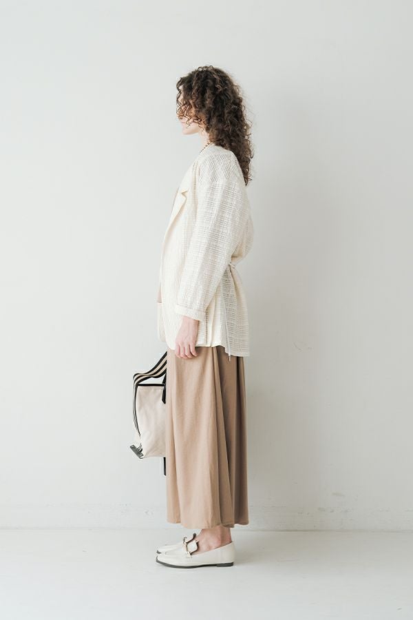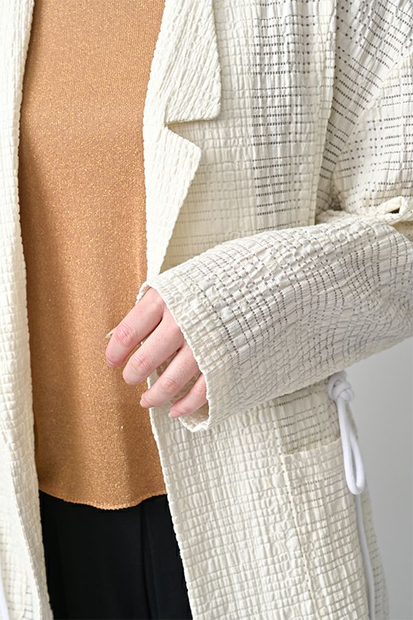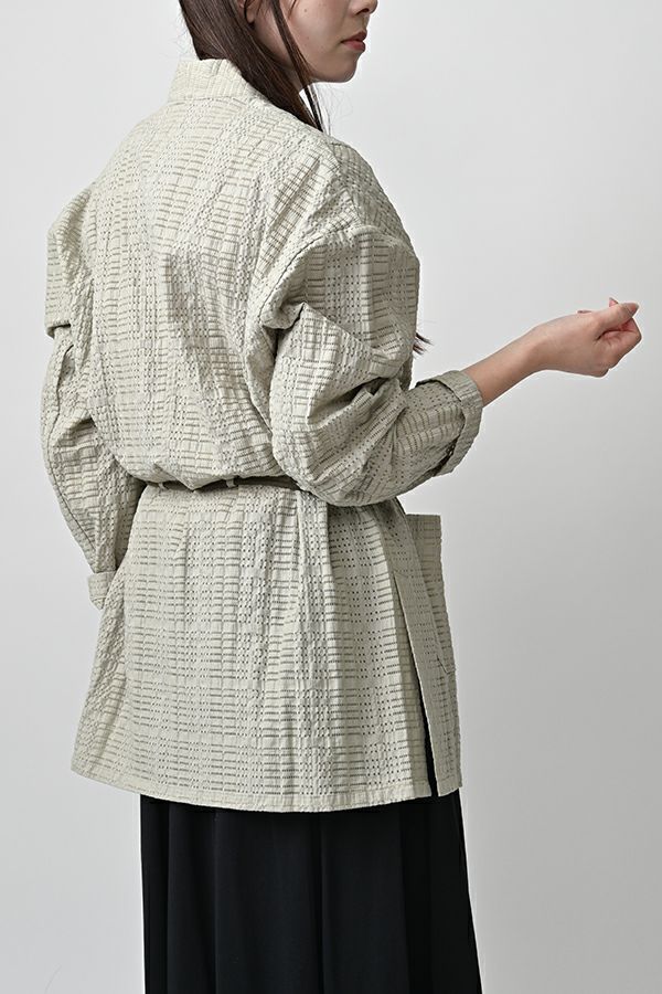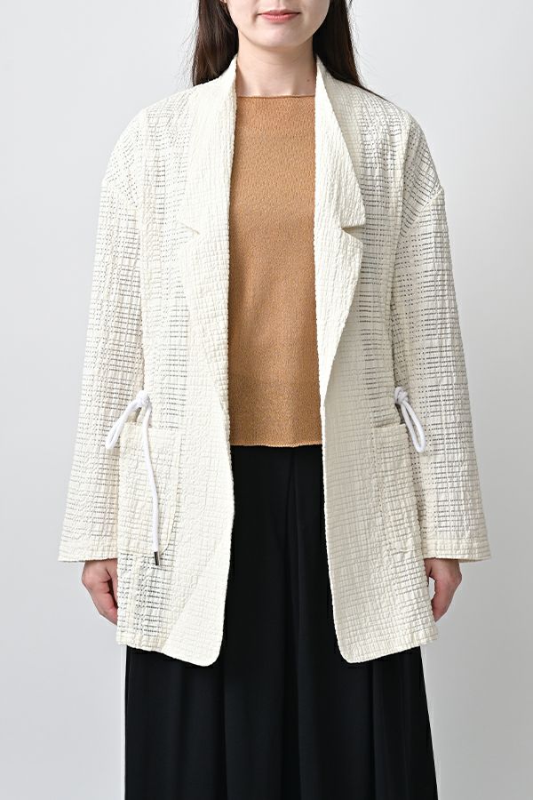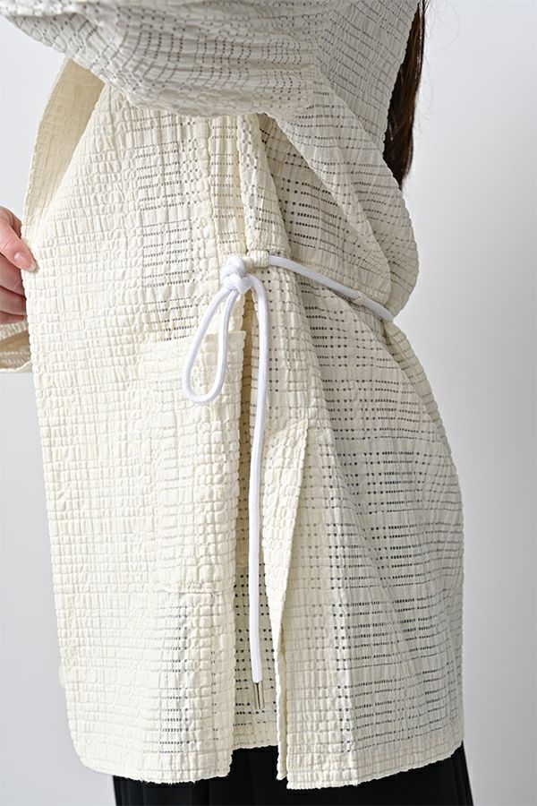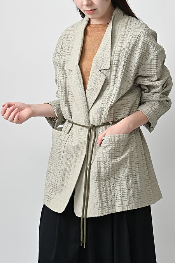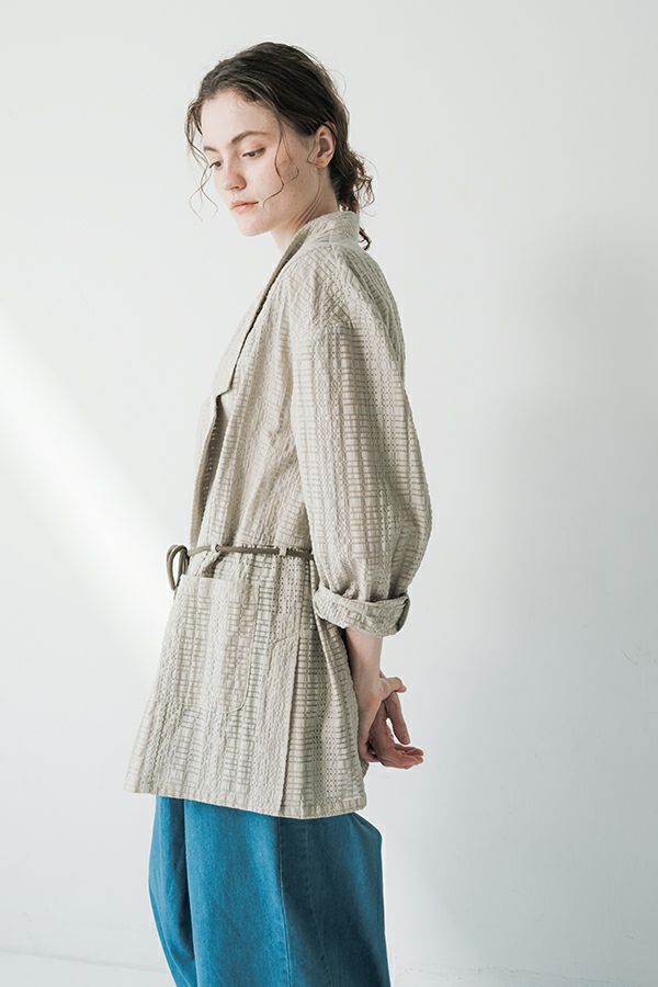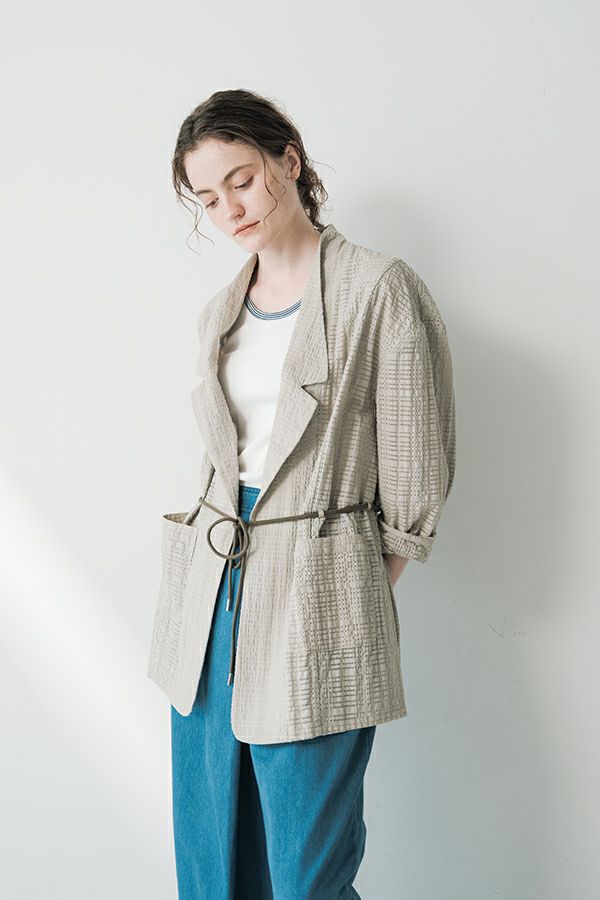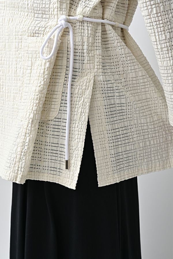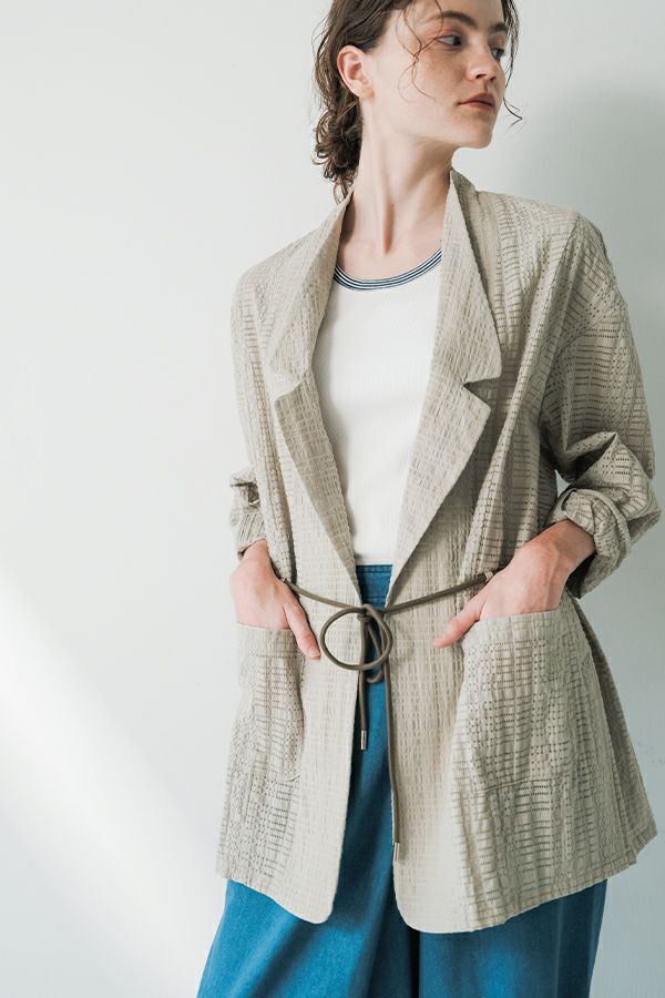 ナチュラルなリラックス感で叶える、大人マニッシュメッシュジャケット。 編んだようなメッシュ生地を使用した、オーバーサイズのリラックスアイテム。へちまカラーのようなリラックス感漂うノーカラーで、ゆったりとした身頃とヒップが隠れる着丈が、自然な抜け感を演出しつつ使い勝手の良さも両立。 ウエストには取り外し可能なテープを装備し、絞ることでシルエットの変化も楽しめるデザイン。テープを通すデザインループも拘りのポイントです。 ワンピースやノースリーブの上からさらりと羽織れば、マニッシュな印象に。夏はノースリーブインナーと重ねてシャツ感覚で着こなすなど、シーズンを問わず活躍する一枚です。