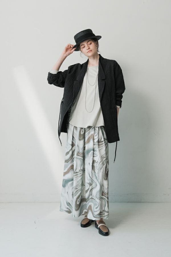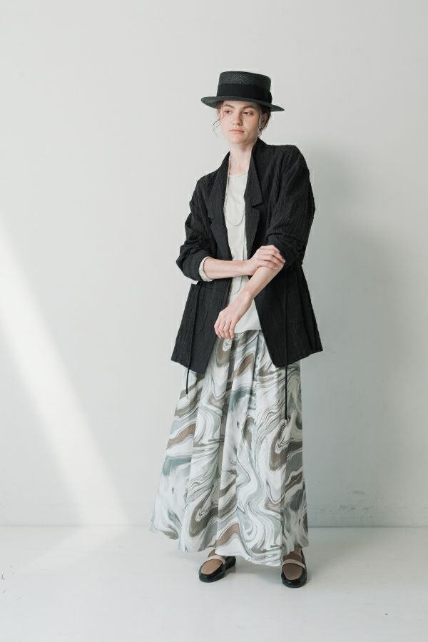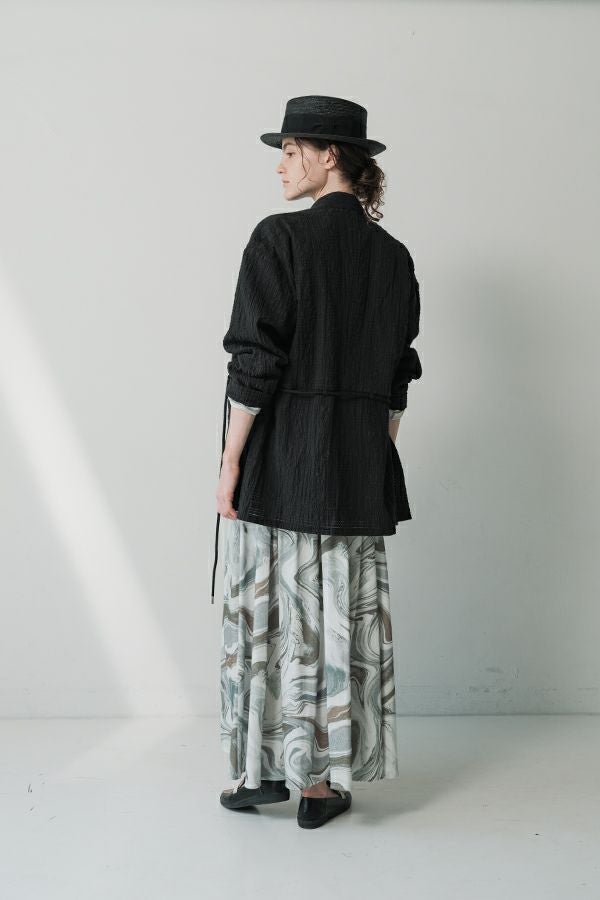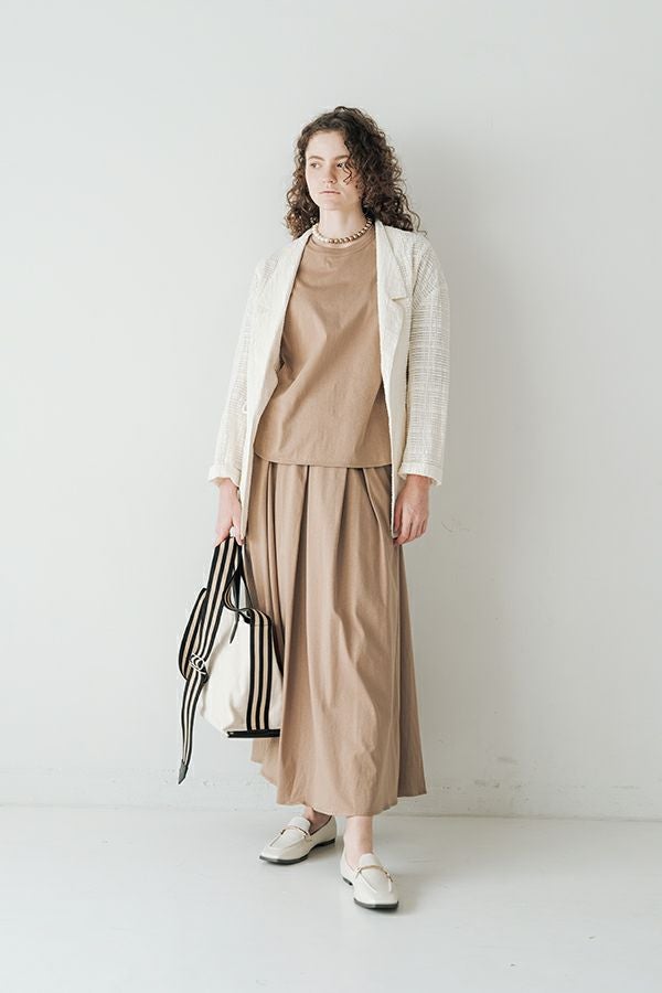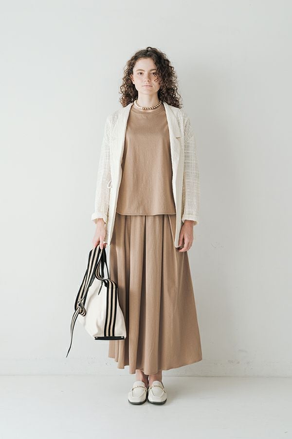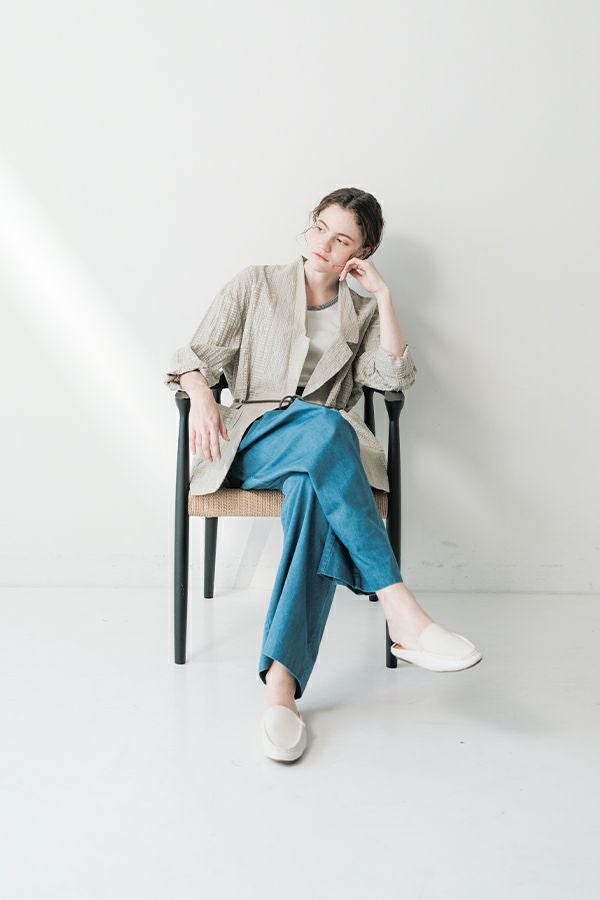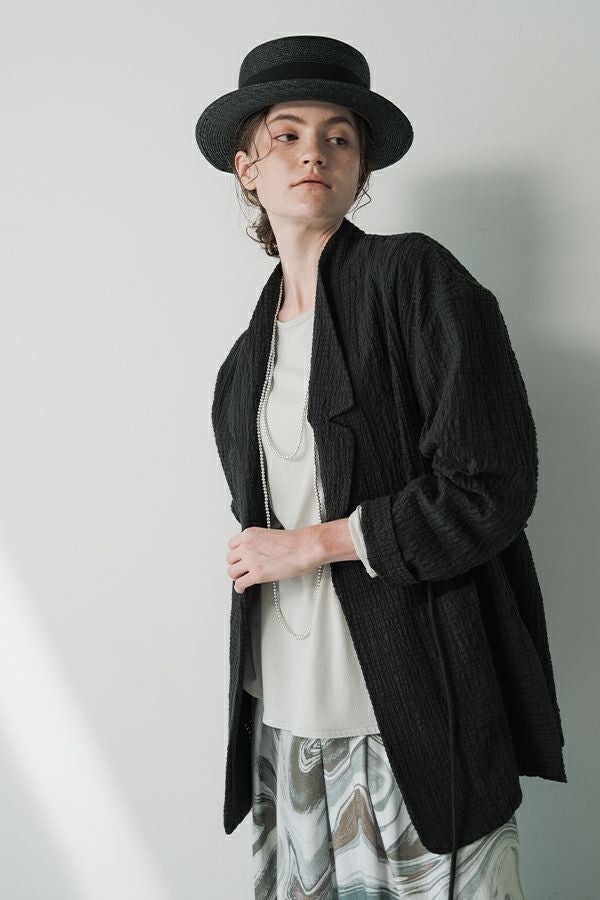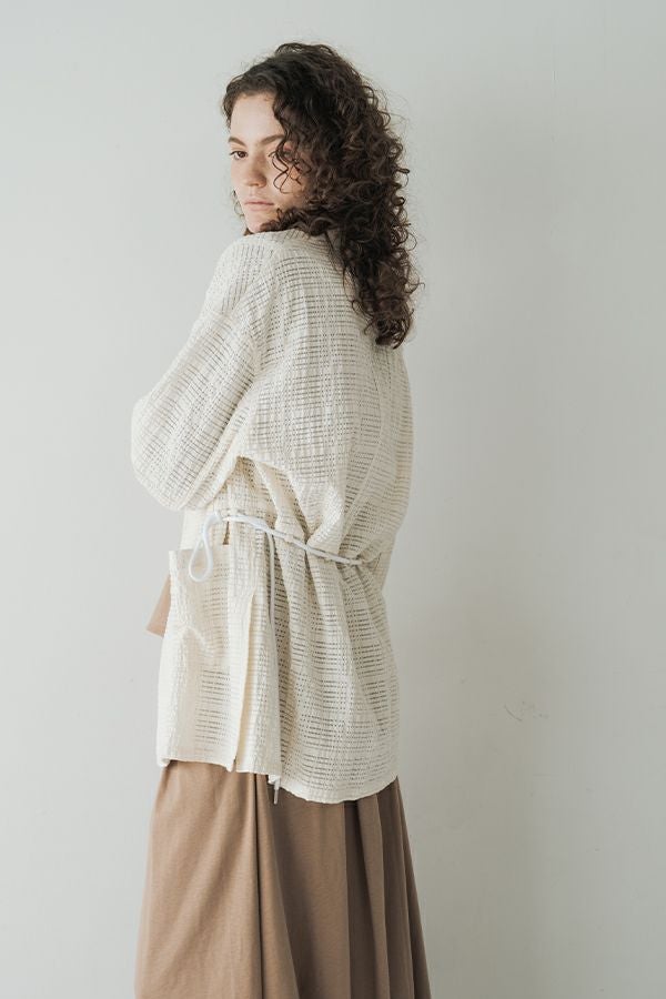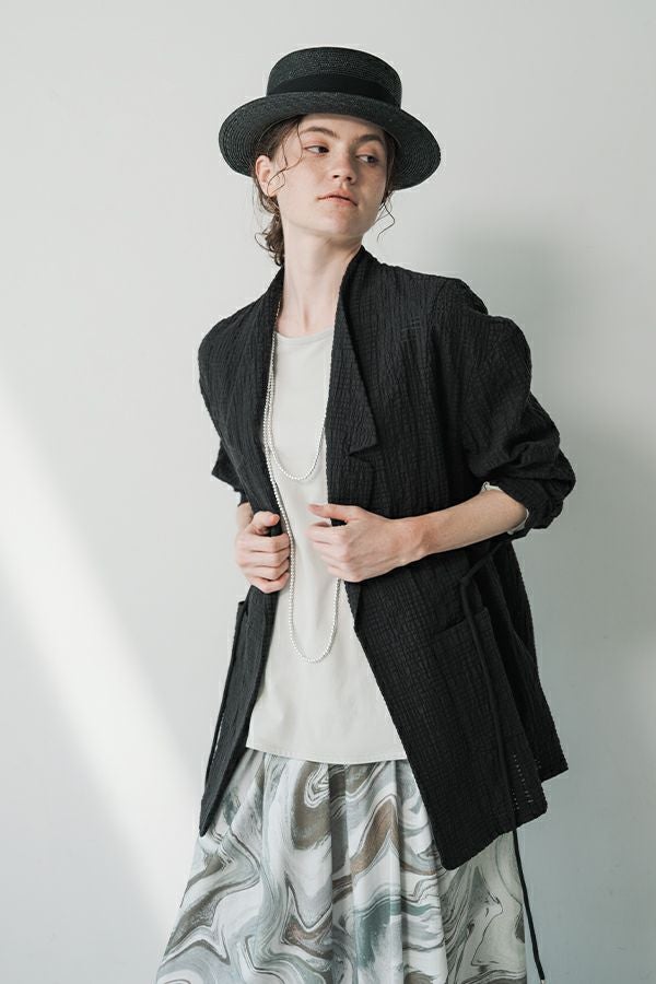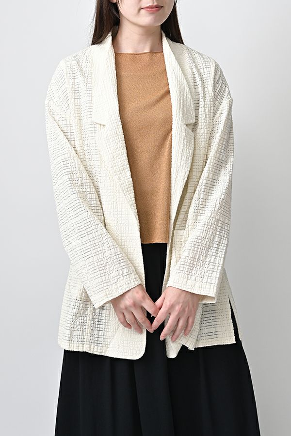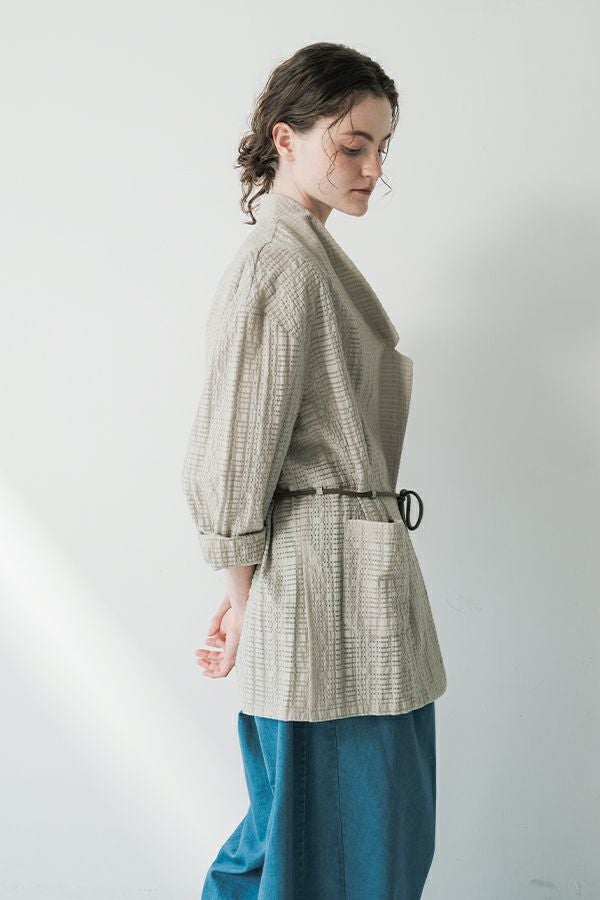ナチュラルなリラックス感で叶える、大人マニッシュメッシュジャケット。 編んだようなメッシュ生地を使用した、オーバーサイズのリラックスアイテム。へちまカラーのようなリラックス感漂うノーカラーで、ゆったりとした身頃とヒップが隠れる着丈が、自然な抜け感を演出しつつ使い勝手の良さも両立。 ウエストには取り外し可能なテープを装備し、絞ることでシルエットの変化も楽しめるデザイン。テープを通すデザインループも拘りのポイントです。 ワンピースやノースリーブの上からさらりと羽織れば、マニッシュな印象に。夏はノースリーブインナーと重ねてシャツ感覚で着こなすなど、シーズンを問わず活躍する一枚です。