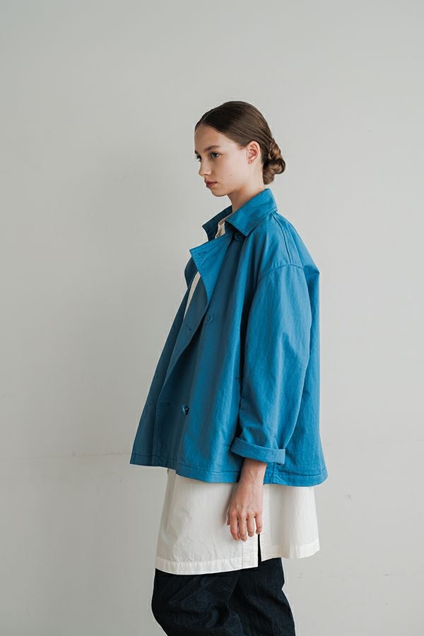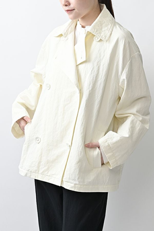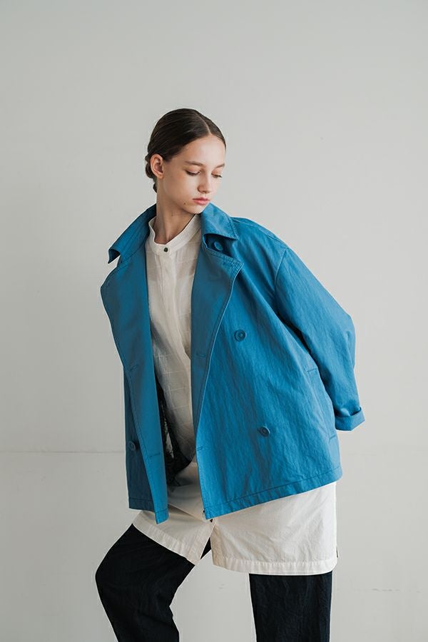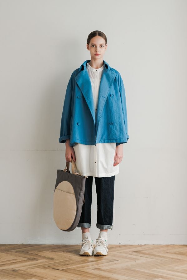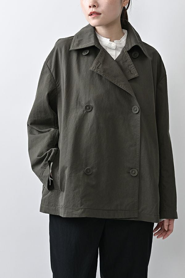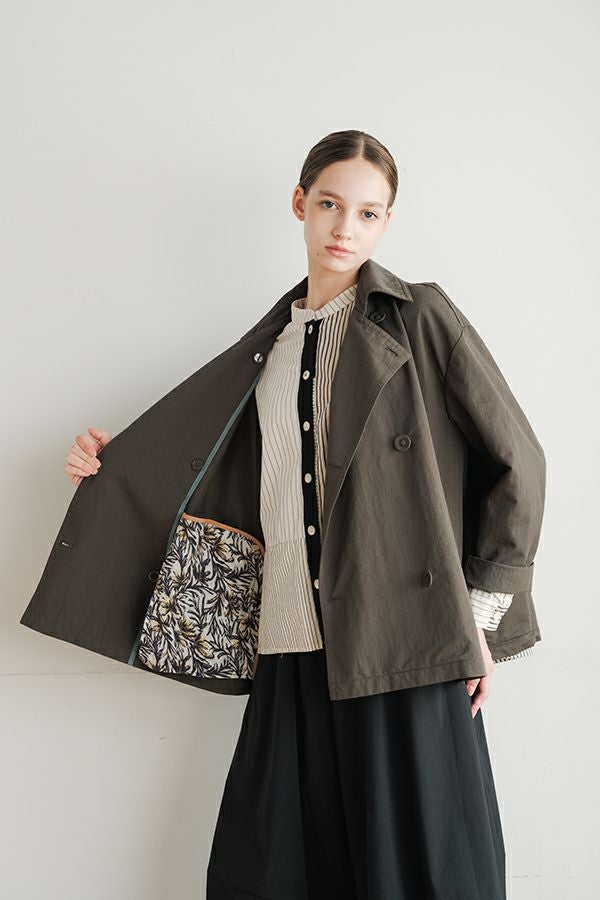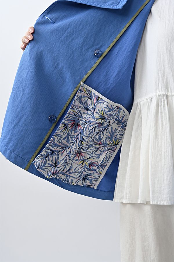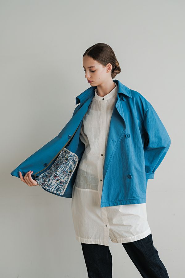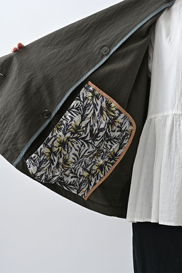 軽やかに纏う、カジュアルモードなツイルピーコート。 コットンのナチュラルな風合いに、ナイロン特有の程よいハリ感を掛け合わせたツイル(綾織り)素材。ダブル打ち合いのゆったりとしたシルエットながら、裏地のない一枚仕立てで軽やかに着こなせるピーコートです。製品洗いを施すことで生まれた細やかなパッカリング(縫い縮み)が、表情豊かなカジュアル感を演出。 内側のポケット袋布とパイピングに、2種類のプリント生地と2色の無地パイピングを組み合わせ、さりげない遊び心をプラスしました。開いた瞬間に覗くカラフルな内側が、着るたびに気分を上げてくれます。バックにはボックスプリーツを施し、デザイン性と動きやすさを両立。スカートにもパンツにも合わせやすい絶妙な丈感で、シーズンを問わず活躍する一着です。