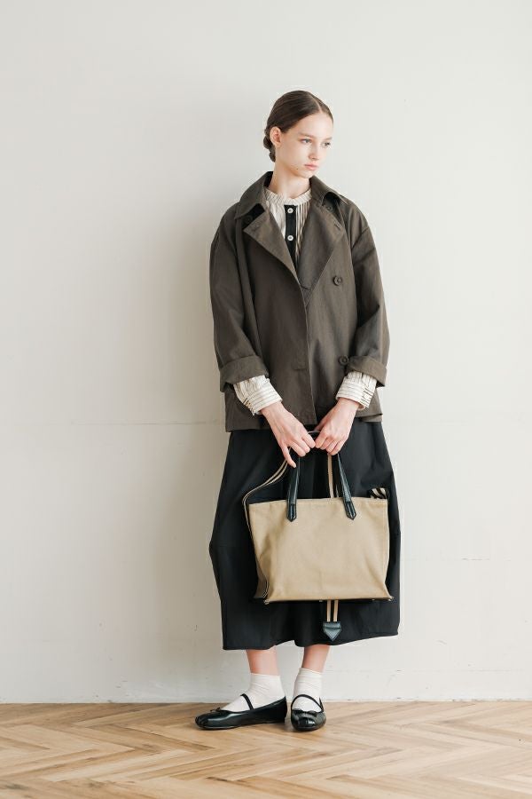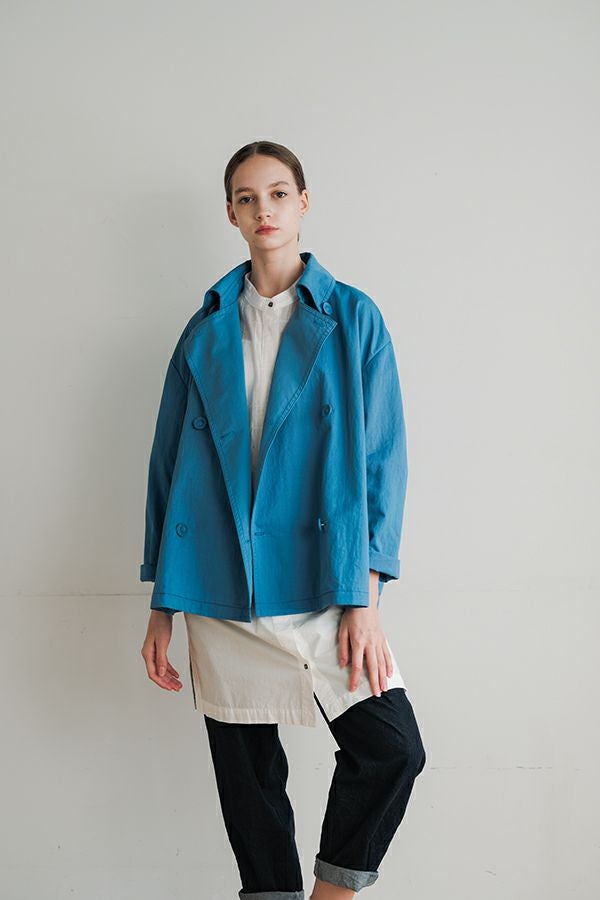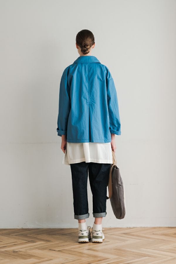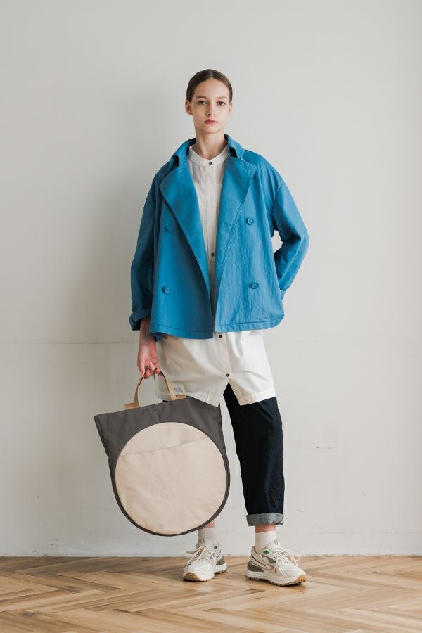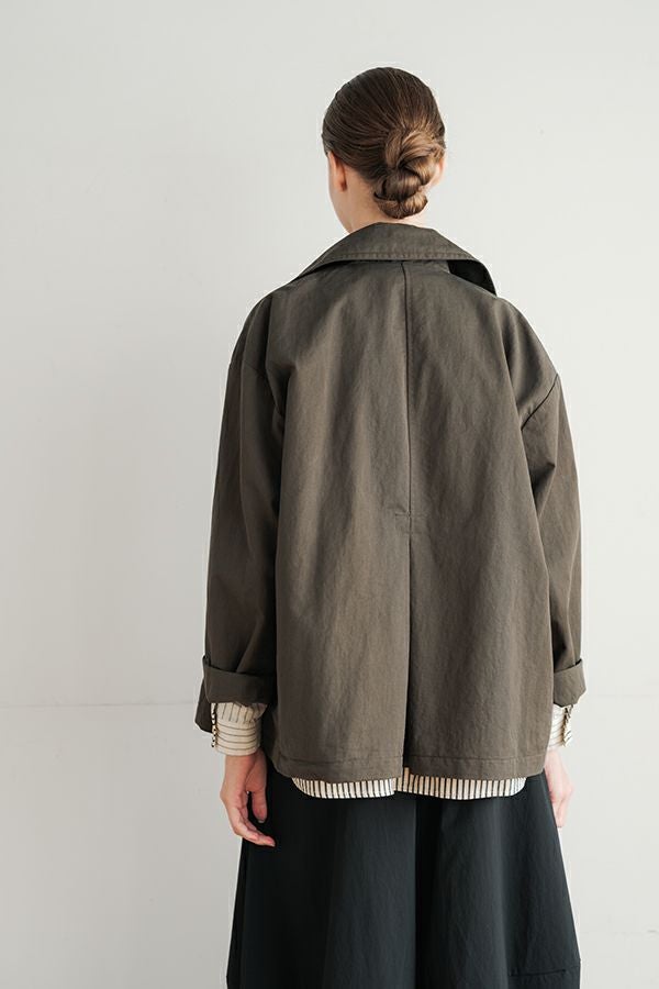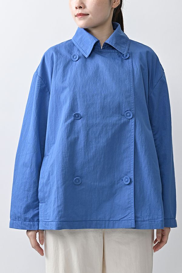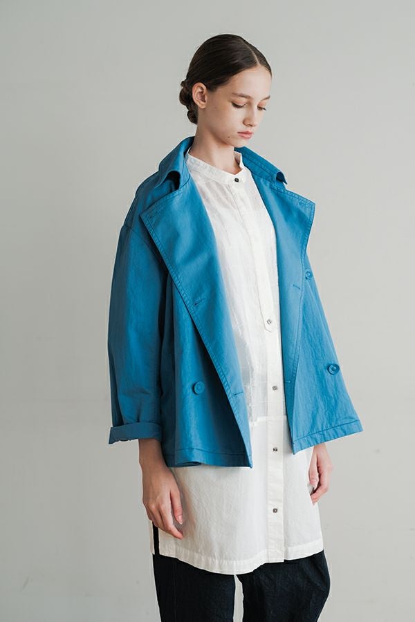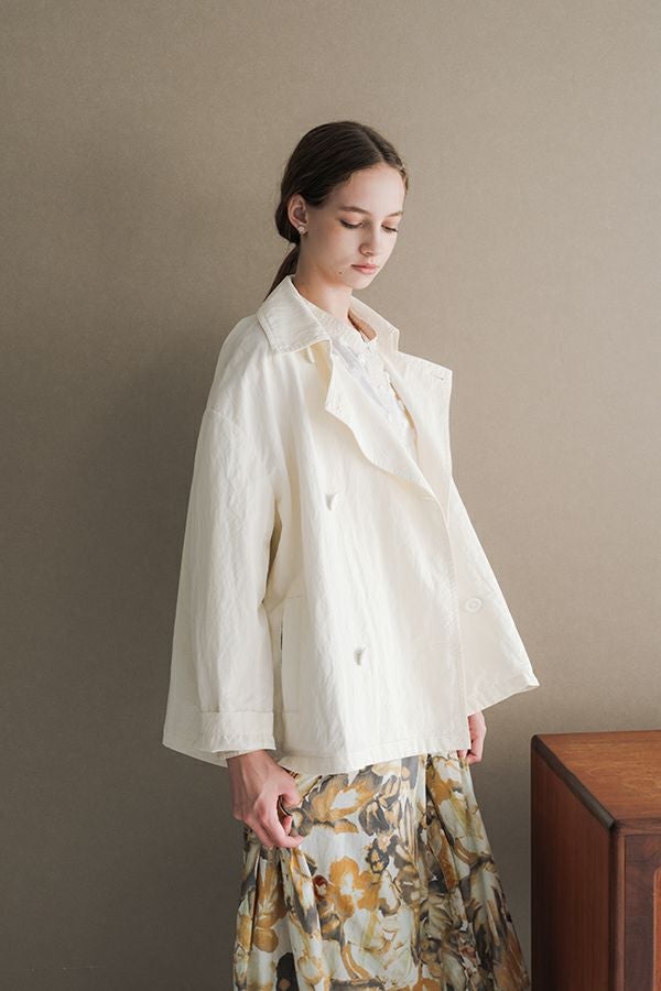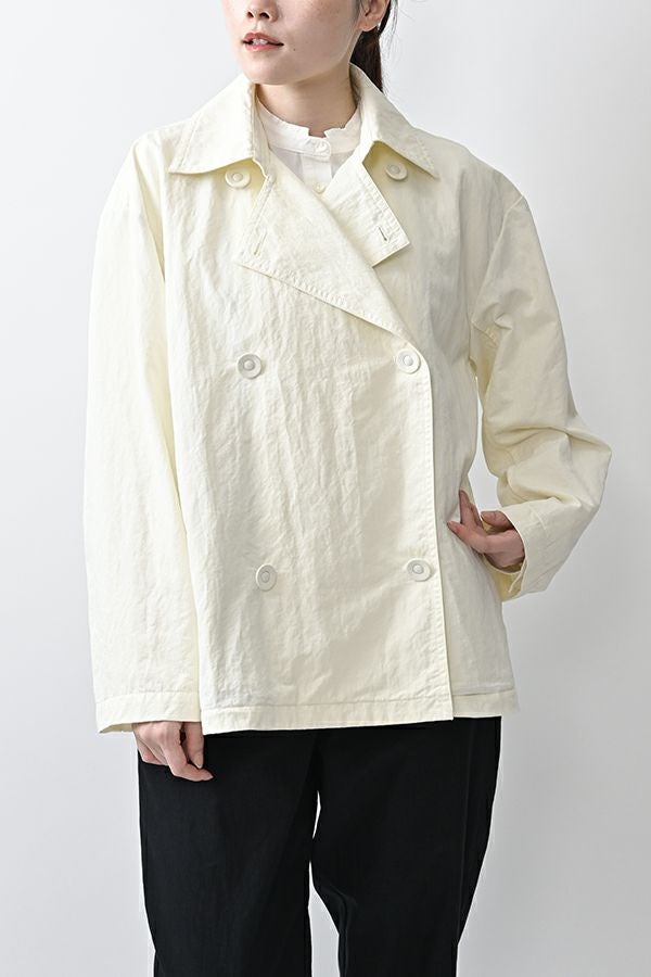 軽やかに纏う、カジュアルモードなツイルピーコート。 コットンのナチュラルな風合いに、ナイロン特有の程よいハリ感を掛け合わせたツイル(綾織り)素材。ダブル打ち合いのゆったりとしたシルエットながら、裏地のない一枚仕立てで軽やかに着こなせるピーコートです。製品洗いを施すことで生まれた細やかなパッカリング(縫い縮み)が、表情豊かなカジュアル感を演出。 内側のポケット袋布とパイピングに、2種類のプリント生地と2色の無地パイピングを組み合わせ、さりげない遊び心をプラスしました。開いた瞬間に覗くカラフルな内側が、着るたびに気分を上げてくれます。バックにはボックスプリーツを施し、デザイン性と動きやすさを両立。スカートにもパンツにも合わせやすい絶妙な丈感で、シーズンを問わず活躍する一着です。
