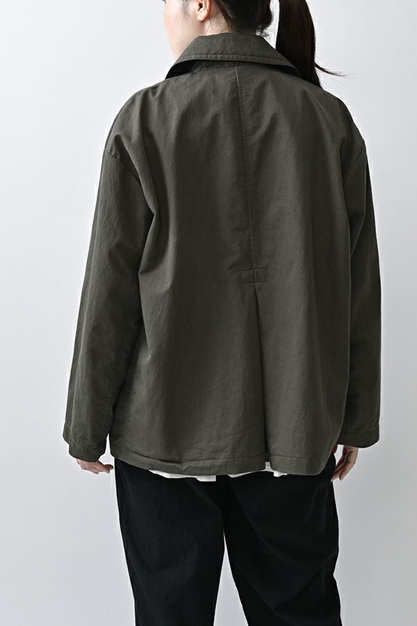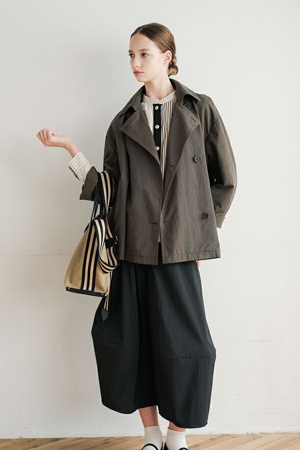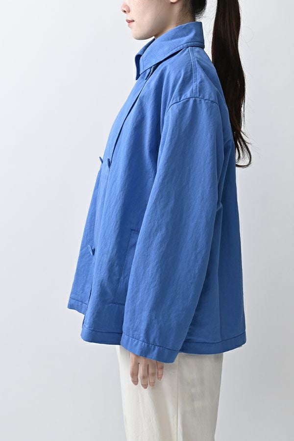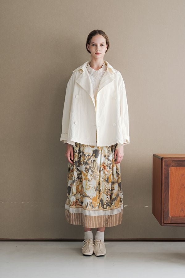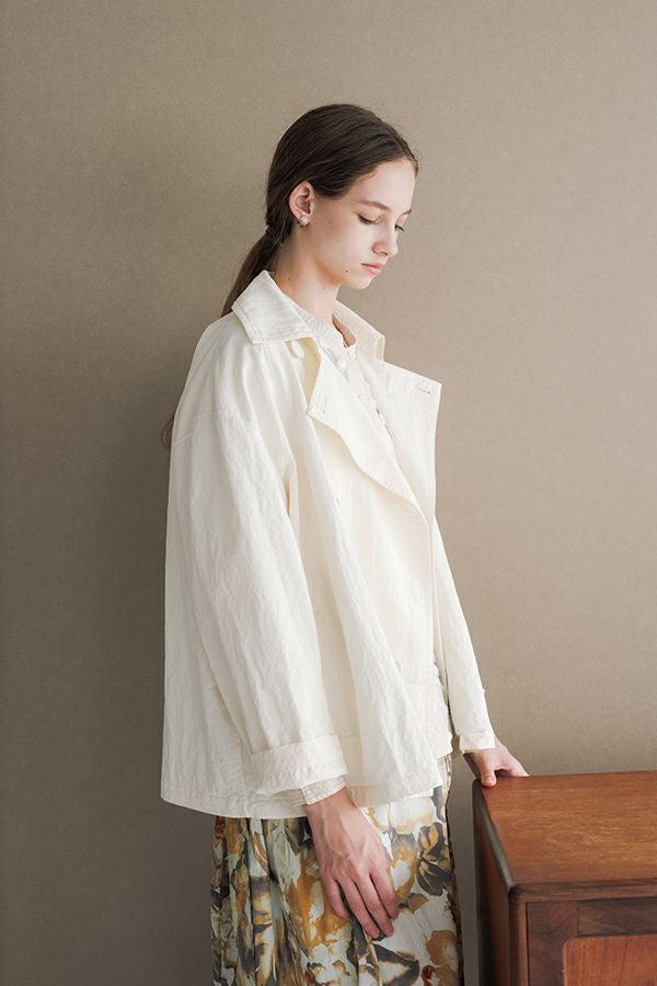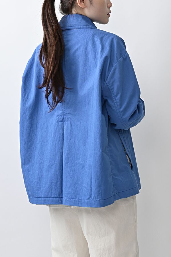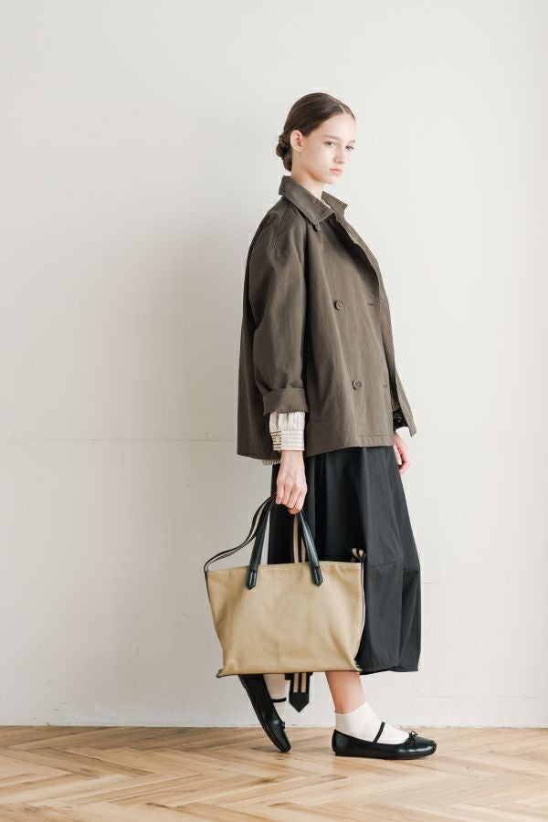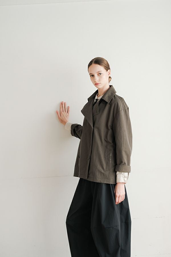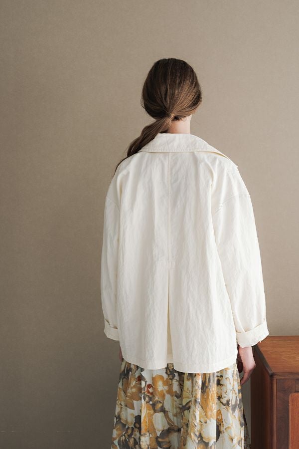 軽やかに纏う、カジュアルモードなツイルピーコート。 コットンのナチュラルな風合いに、ナイロン特有の程よいハリ感を掛け合わせたツイル(綾織り)素材。ダブル打ち合いのゆったりとしたシルエットながら、裏地のない一枚仕立てで軽やかに着こなせるピーコートです。製品洗いを施すことで生まれた細やかなパッカリング(縫い縮み)が、表情豊かなカジュアル感を演出。 内側のポケット袋布とパイピングに、2種類のプリント生地と2色の無地パイピングを組み合わせ、さりげない遊び心をプラスしました。開いた瞬間に覗くカラフルな内側が、着るたびに気分を上げてくれます。バックにはボックスプリーツを施し、デザイン性と動きやすさを両立。スカートにもパンツにも合わせやすい絶妙な丈感で、シーズンを問わず活躍する一着です。
