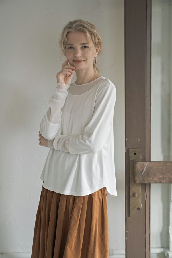 追加が決定!程よい肌見せと透け感が魅力的で、女性らしさ漂うプルオーバー。 光沢感と抗ピリング加工を施したデラヴィスポンチはストレッチ性もあり透けないカットソー素材を使用。裾のカーブがお腹周りをカバーし、程よい分量感とヒップにかぶる丈感で1枚着でもインナーでも着れるのがポイント。 袖の長いチュールをクシュクシュっと たくし上げてトップスの下からレイヤードを楽しんで・・・横長の襟ぐりなのでシャツやニットのインナーに合わせやすくなっています。 ●日本製