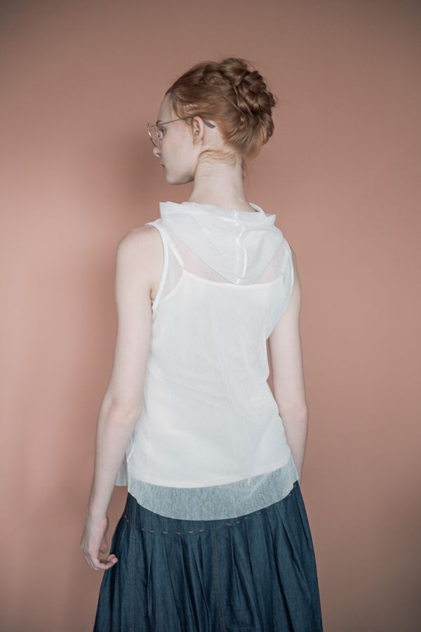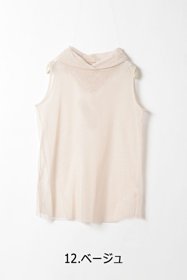 大人気!akane名品メッシュインナー サラリとした綿/ポリエステルのメッシュ素材のノースリーブインナーです。 襟ぐりからフードを出して重ね着するアイテムで軽くて顔周りも華やかにします。 襟元が開くと気になる方も、日焼け防止にもなり一石二鳥の便利な定番インナーです。