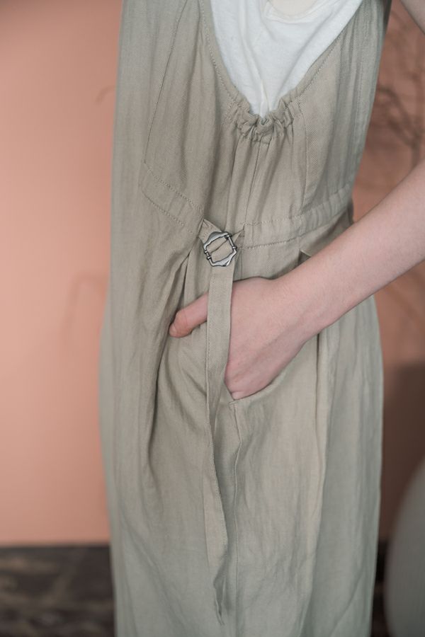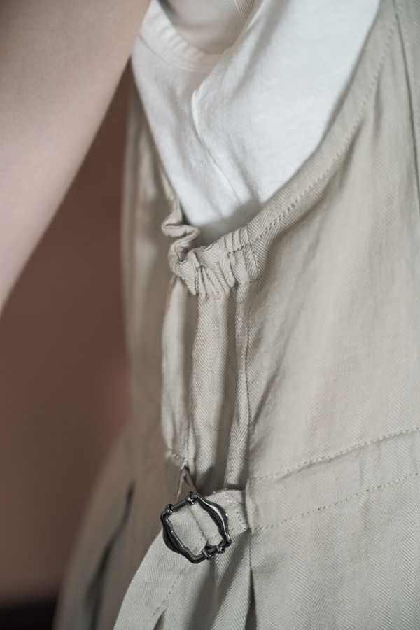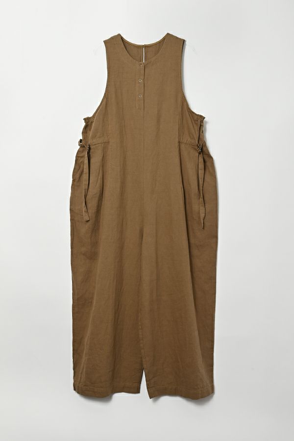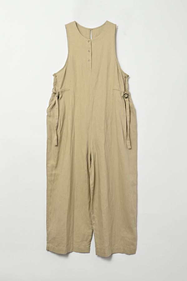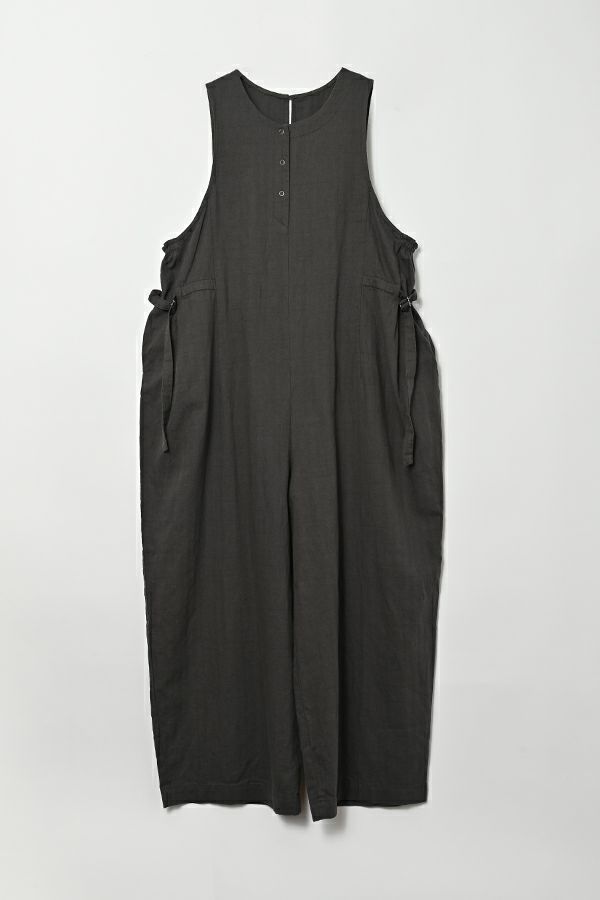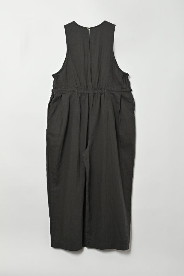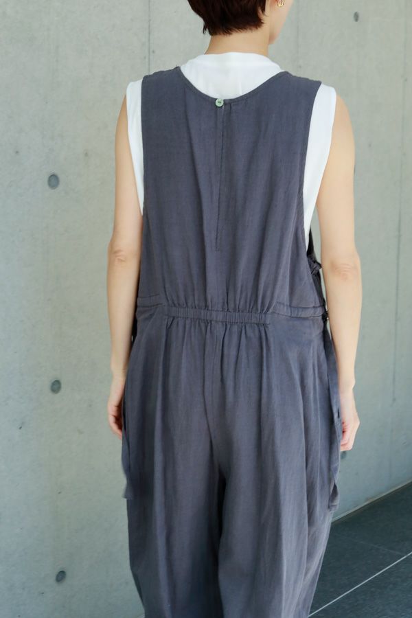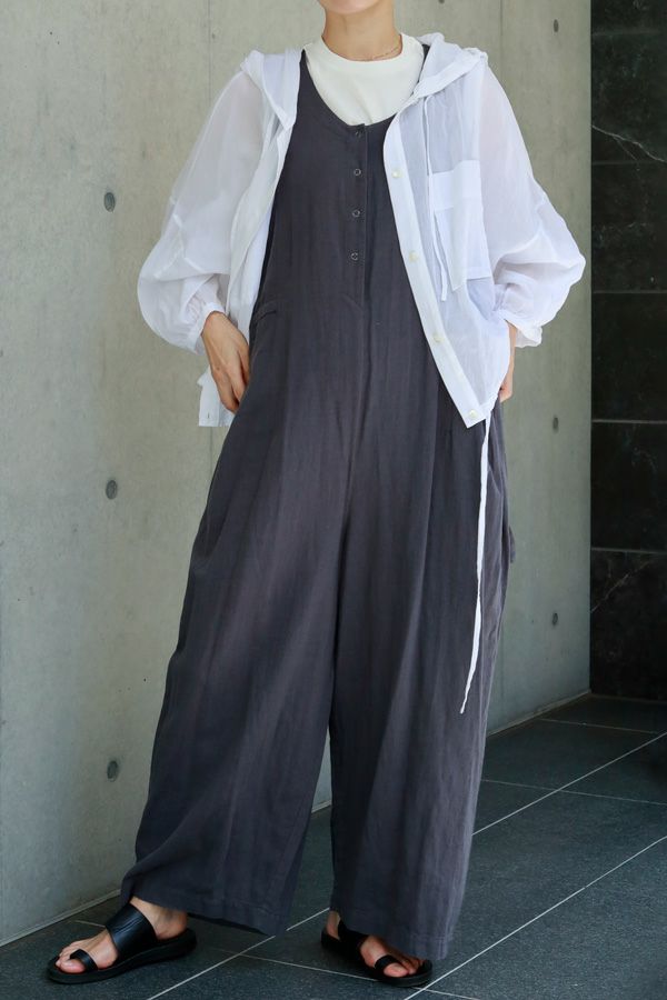 リラクシーカジュアルにピッタリな、抜け感大人コンビネゾン。 ヘリンボン地の綿/麻にレーヨン系素材の入った滑らかな質感。柔らかな肌触りが合わさり着心地良く、カジュアルだけどakaneらしさのある大人っぽいアイテムです。 ゆとりのある身幅に大きなカーブをつけた袖ぐりが特徴で、下に着るものと羽織りものを選ばず、脇ゴムと前後のベルトバックルでサイズ対応出来ます。背中に入れた長めスリットは背中をスッキリ綺麗に見せ、後ろウエストのゴムギャザーはヒップ周りをカバーし腰高に見せ、大人が着映える仕掛けに。 インナーに合わせたタンクトップと透け感のある羽織りでライトなカジュアルスタイルを提案。