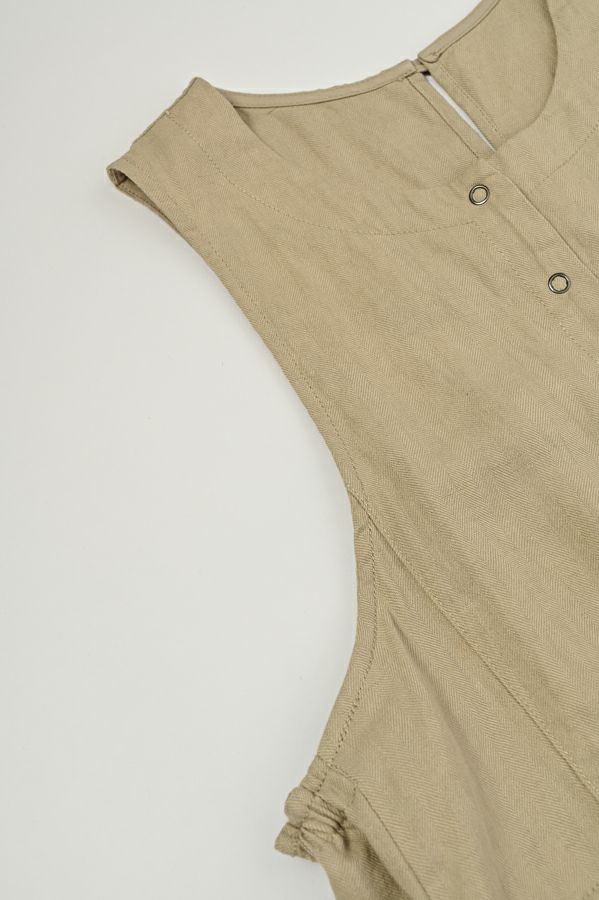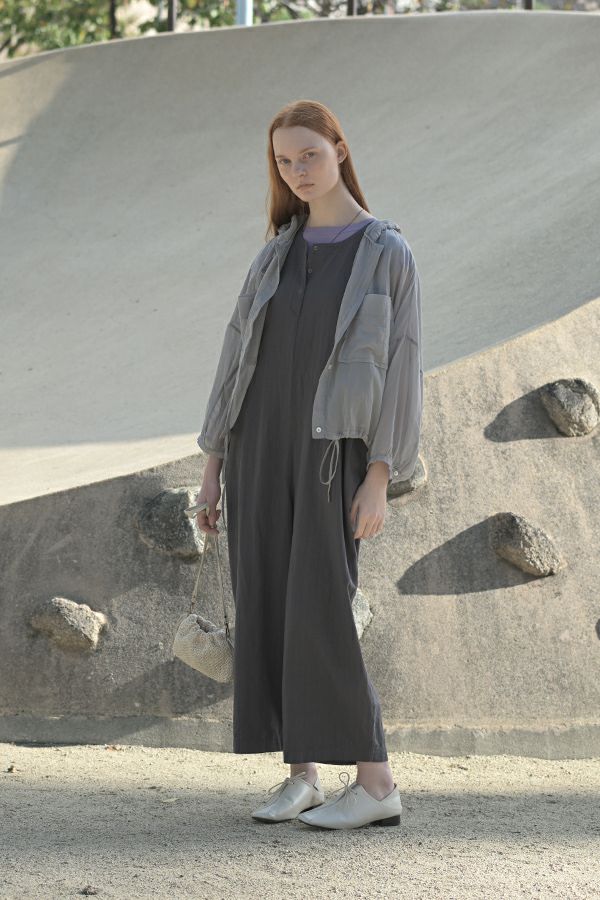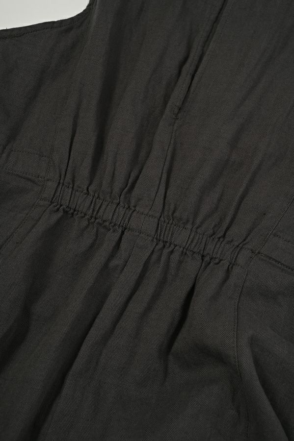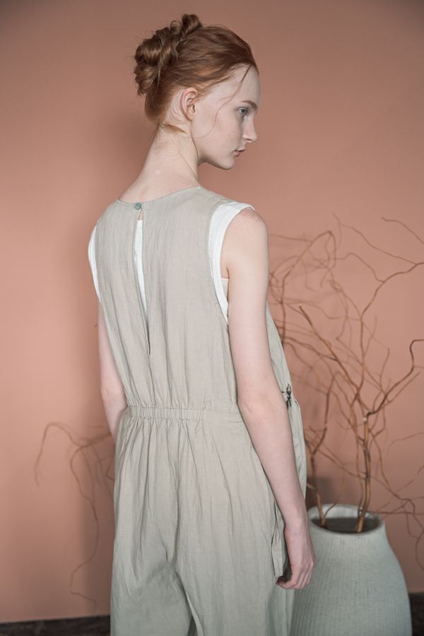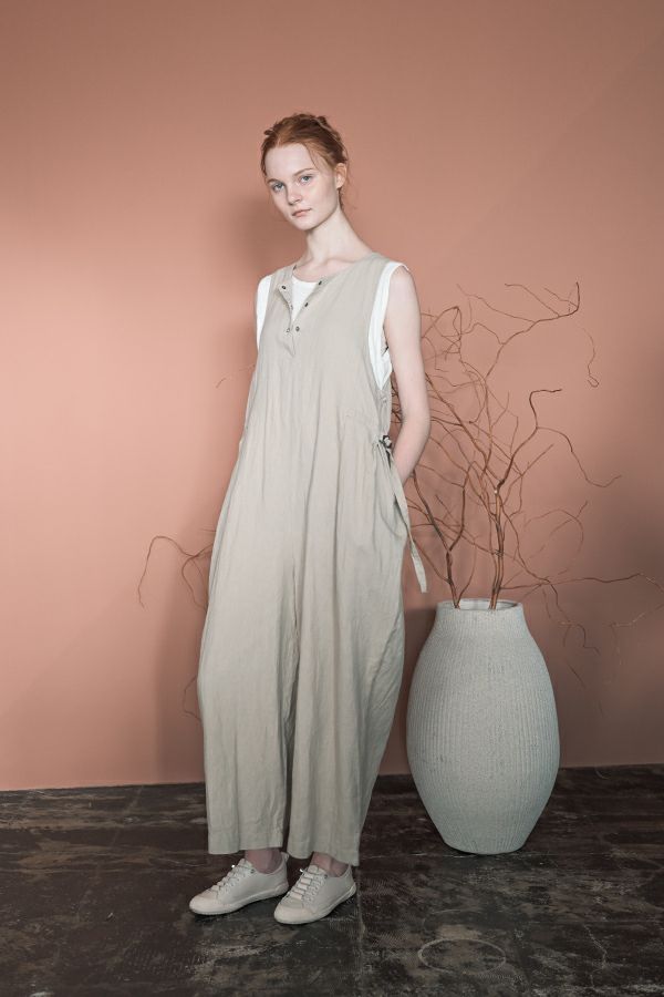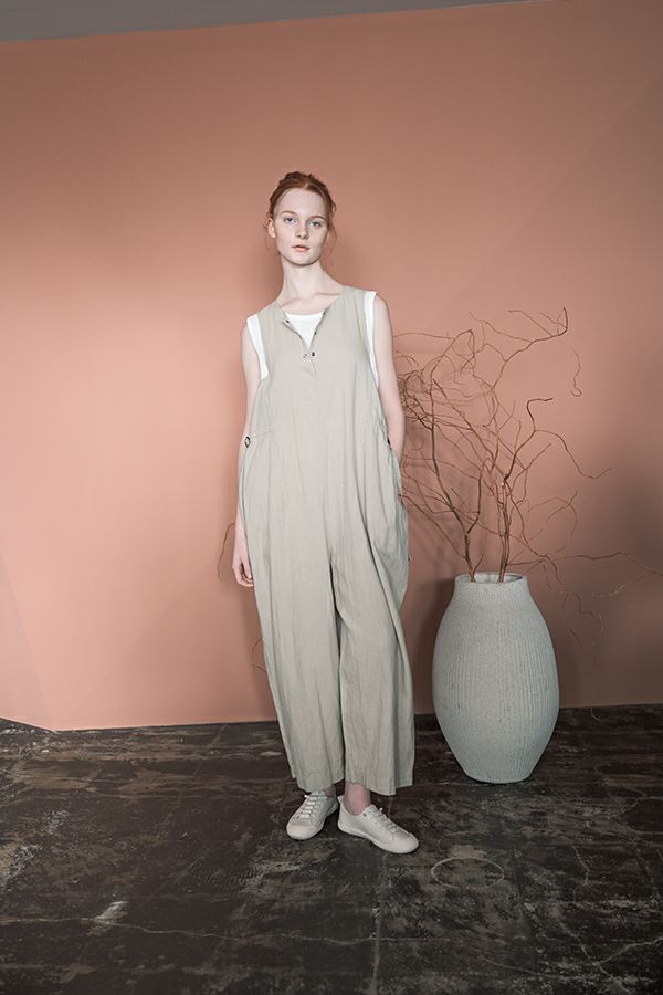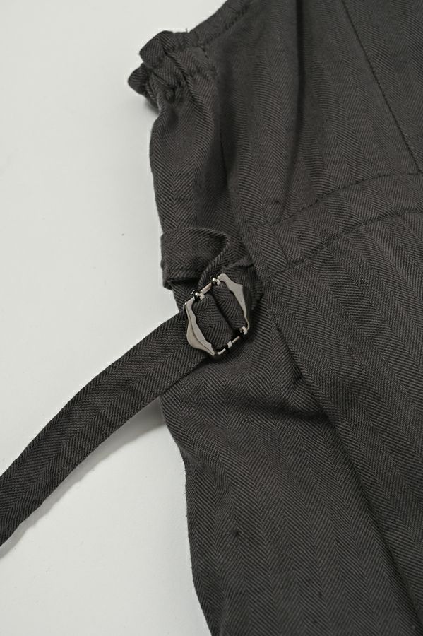 リラクシーカジュアルにピッタリな、抜け感大人コンビネゾン。 ヘリンボン地の綿/麻にレーヨン系素材の入った滑らかな質感。柔らかな肌触りが合わさり着心地良く、カジュアルだけどakaneらしさのある大人っぽいアイテムです。 ゆとりのある身幅に大きなカーブをつけた袖ぐりが特徴で、下に着るものと羽織りものを選ばず、脇ゴムと前後のベルトバックルでサイズ対応出来ます。背中に入れた長めスリットは背中をスッキリ綺麗に見せ、後ろウエストのゴムギャザーはヒップ周りをカバーし腰高に見せ、大人が着映える仕掛けに。 インナーに合わせたタンクトップと透け感のある羽織りでライトなカジュアルスタイルを提案。