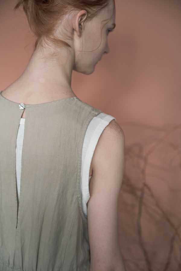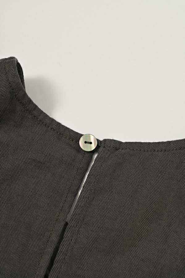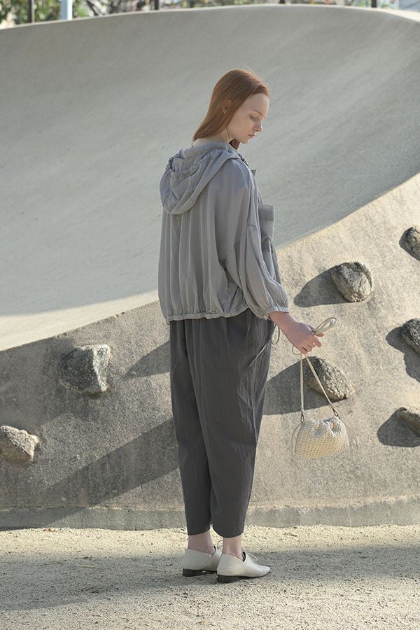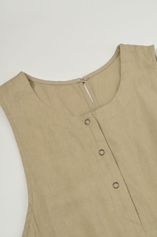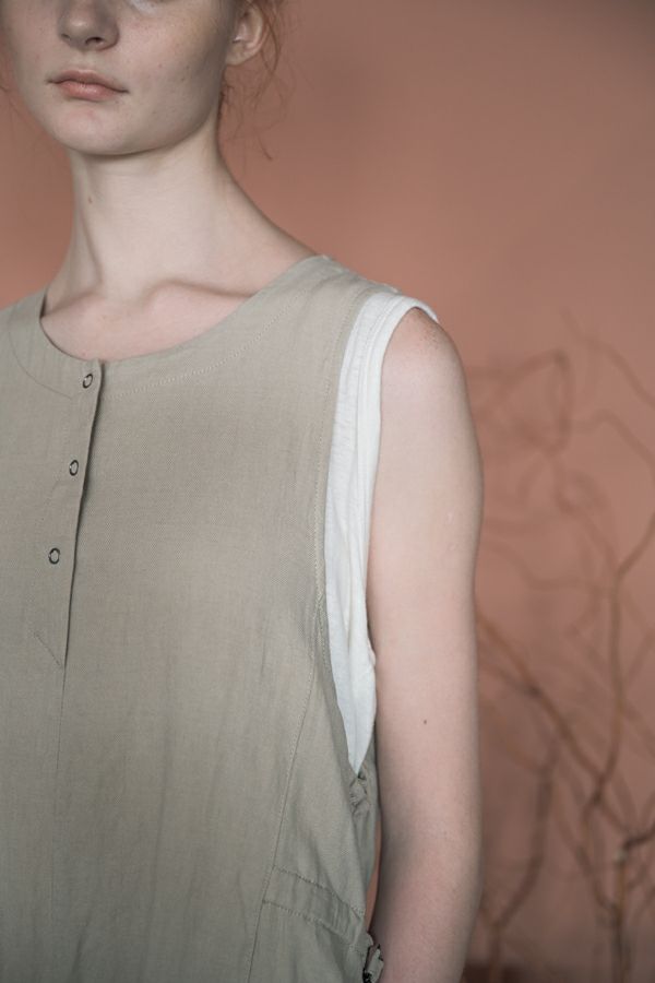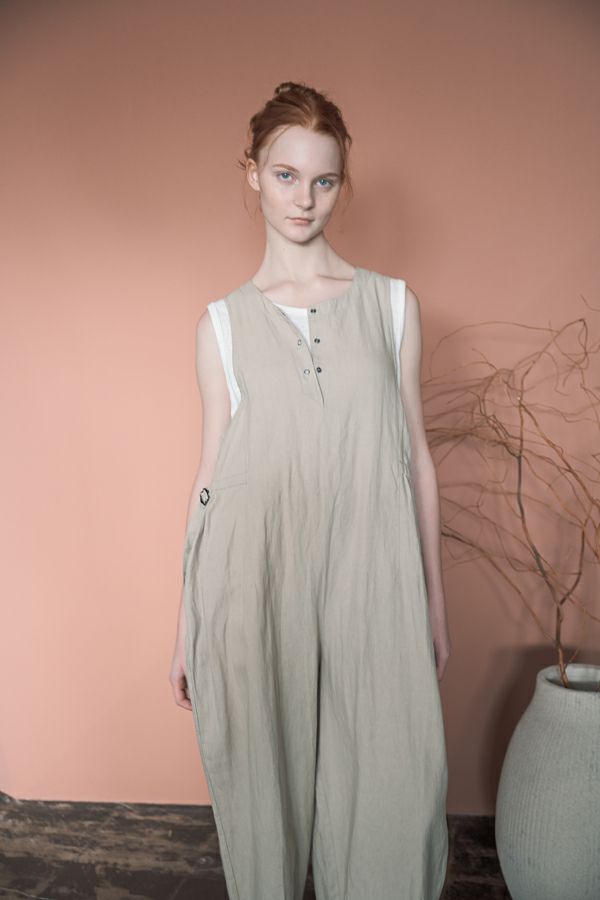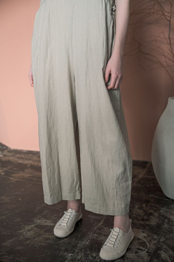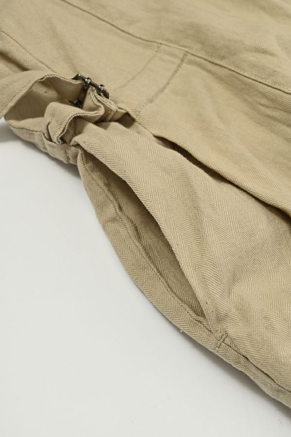 リラクシーカジュアルにピッタリな、抜け感大人コンビネゾン。 ヘリンボン地の綿/麻にレーヨン系素材の入った滑らかな質感。柔らかな肌触りが合わさり着心地良く、カジュアルだけどakaneらしさのある大人っぽいアイテムです。 ゆとりのある身幅に大きなカーブをつけた袖ぐりが特徴で、下に着るものと羽織りものを選ばず、脇ゴムと前後のベルトバックルでサイズ対応出来ます。背中に入れた長めスリットは背中をスッキリ綺麗に見せ、後ろウエストのゴムギャザーはヒップ周りをカバーし腰高に見せ、大人が着映える仕掛けに。 インナーに合わせたタンクトップと透け感のある羽織りでライトなカジュアルスタイルを提案。