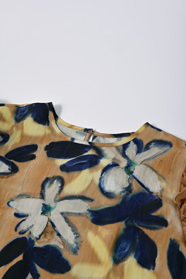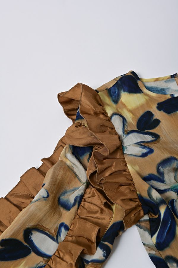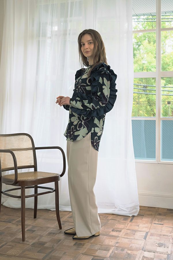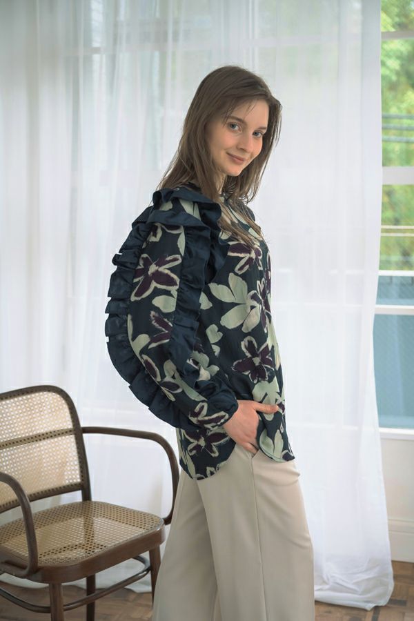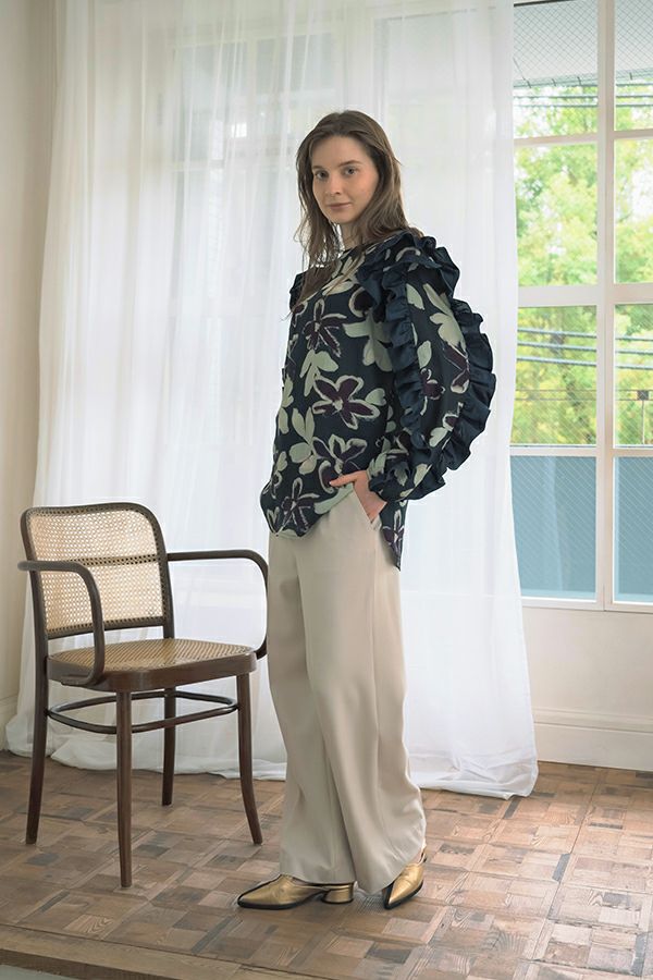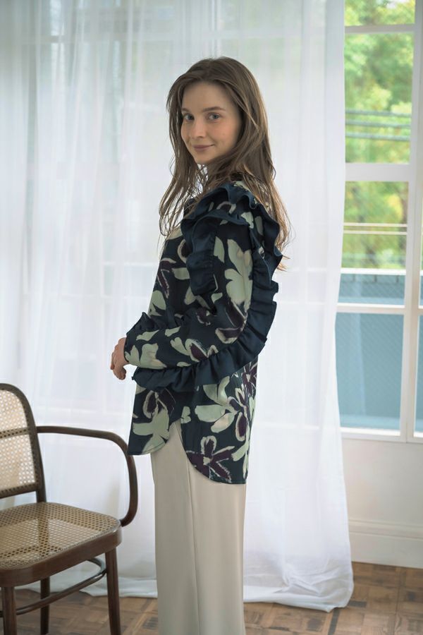 存在感抜群!アート柄オリジナルプリントのノーカラーフリルブラウス。 肩と袖山に入った配色無地のギャザーフリルでボリュームを出し、エレガントで主役級なデザイン!ヒップまで隠れる長め丈で、裾ラインはラウンドし、ベルトインにもアウトにも対応できます。 ボリュームのシルエットなので、スッキリボトムとの相性抜群です。あえてカジュアルなデニムやカーゴパンツで合わせ、抜け感を出したスタイリングもお洒落です。