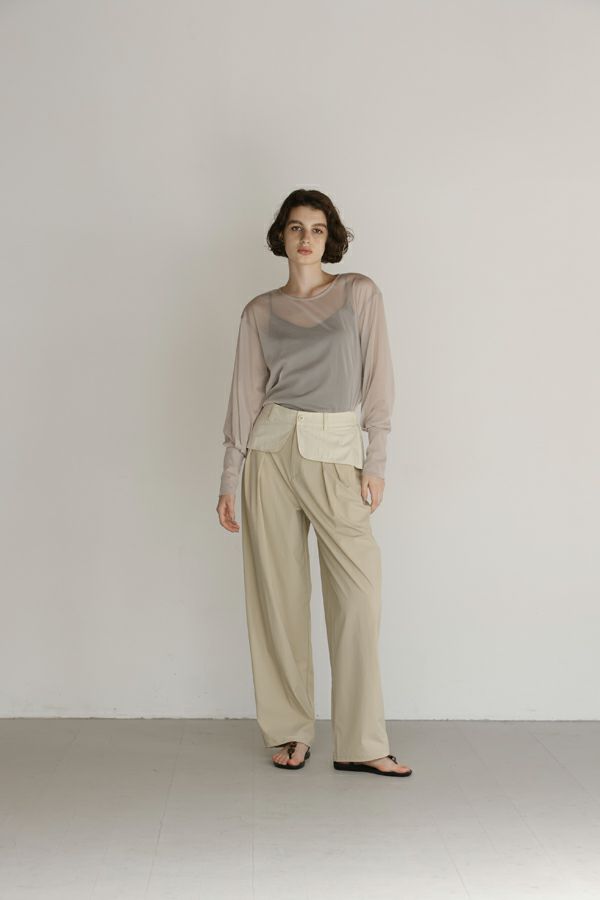 袖口にデザインを入れたNEWタイプのシアーロンTEE。 透け感のあるトリコットシフォンにビンテージの風合いを付与しております。清涼感のあるシャリ味と、ジャージ素材のため 織物のシフォンと比べて落ち感とストレッチ性があり、また光沢もあり繊細で上品な生地となっています。 トリコットは形状安定性がありますので、洗濯による型崩れもしにくいです。 リブを長めにし、タックを施していますが、肩はドロップさせてフェミニンになり過ぎないような仕上がりに。 袖口のタックは、たくし上げた時にエアリーなシルエットを演出してくれるので、プレーンになりがちな春夏コーデのワンポイントになります。 袖のデザインを活かしたベスト合わせや、ボトムスにはボリュームを抑えた大人シルエットがおすすめです。