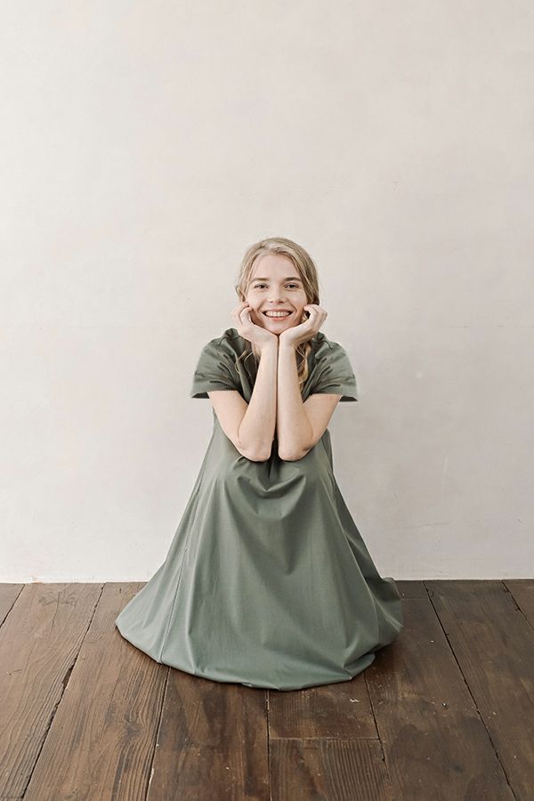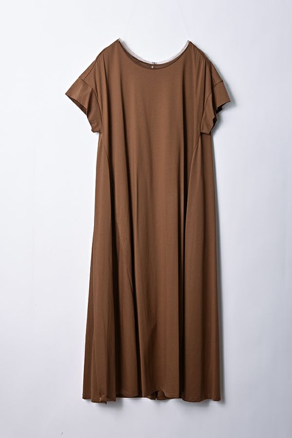 お待たせしました!発売からご好評いただいている半袖ワンピース!待望の再入荷です。新色グリーンが加わり、全4色に! 薄手のシルケット加工のカットソー素材は光沢感あり発色性も良く落ち感もあるので分量感たっぷりでも軽くて楽チン。 体を締め付けず着心地満点のきれいめワンピース。 ドロップショルダーと広めの袖で肩回りをカバーし、前のタテ切替えが全体をスッキリ見せ 脇線が無いのでフレアーラインがきれいにでるシルエットです。 襟元は薄いオーガンジーを使い華奢な印象で顔周りを華やかに見せます。レギンスやソックス+スニーカーやニットボレロと相性GOOD! 追加ブラウン/新色グリーン 4月下旬入荷予定