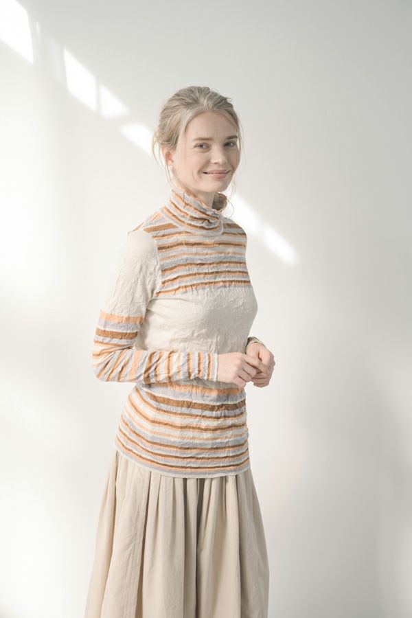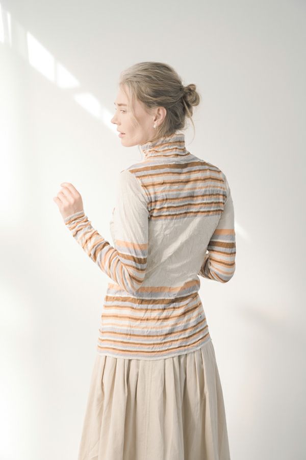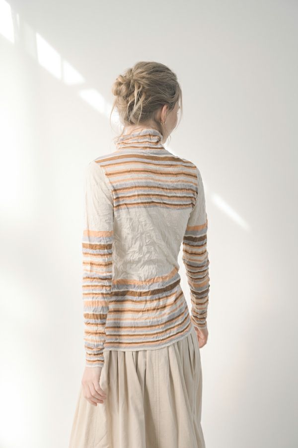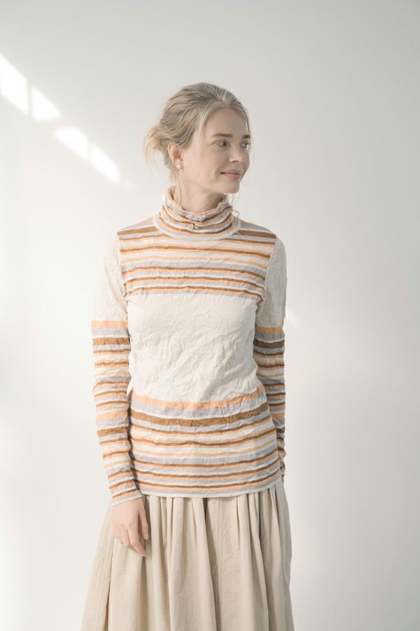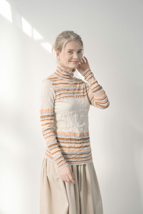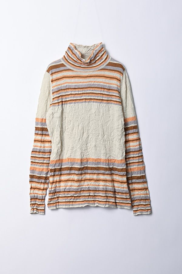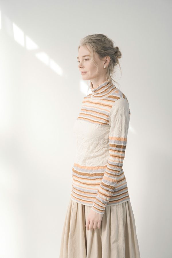 肌触りの良い綿ポリエステルの素材で、真夏以外年中着用可能な素材です。チクチクするの素材はイヤ!とおっしゃるお客様には、喜んで頂ける定番ロングランヒットの一着です。お色違いで買い揃えても後悔しません。 ①洗える! ②薄手でソフト、肌触りが良い ③元々シワが入っている為、洗いざらしのまま着用可能 ④小さくなるのでバックに入り旅行に最適 ⑤ボーダー柄でポイント作れます これが長年愛され続ける理由です。上に何でも重ねられ、衿の高さやフィット感が着こなしをオシャレに仕上げてくれます。職人の絶妙な加減で作られているシワ加工製品は一枚一枚のシワの出方が違う希少価値の高い製品です。 ランダムに入るシワによって体型が出にくい外観にもなっています。伸びも良く何度も着たい優しい肌触りです。 衿の高さは、高すぎず低すぎない実用かつ、オシャレに着こなせる衿元を実現。色々なアイテムの着合わせに最適です。綿とポリエステルの混紡素材で、ソフトな肌触り。 シワ加工に必ず必要なポリエステルは、ポリステルの特徴である熱に強く一度熱で変形させると元に戻らない性質を利用。 ポリステルの混率が高いほどシワ加工のセット性も高くなります。今回ポリエステルの特性を生かして肌に優しい天然繊維の綿素材との混紡素材で市場では少ないシワ加工のセーターを作りました。