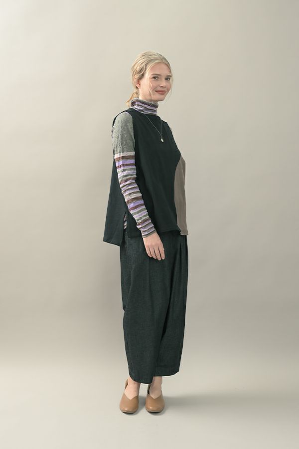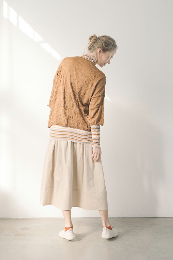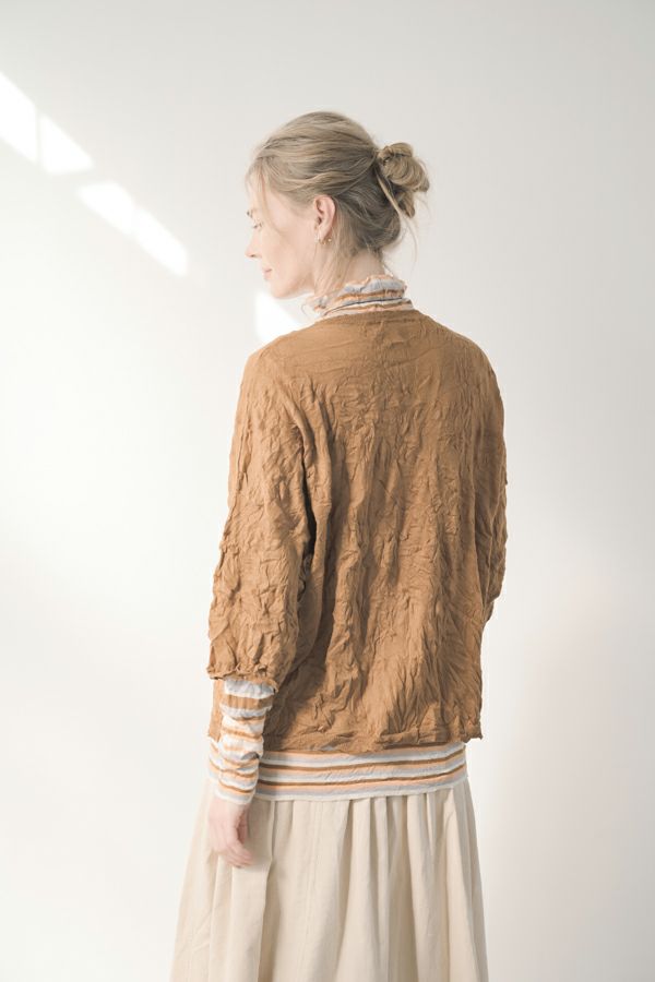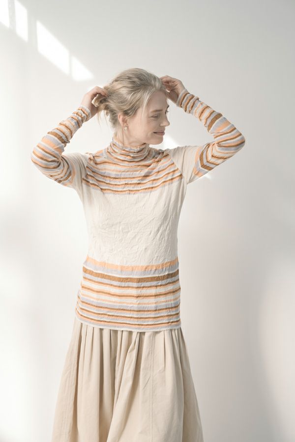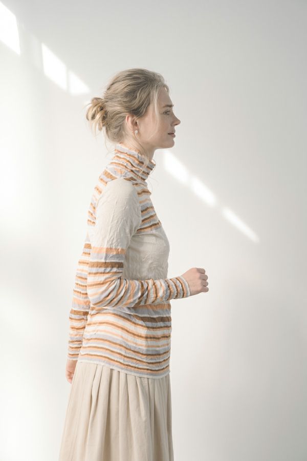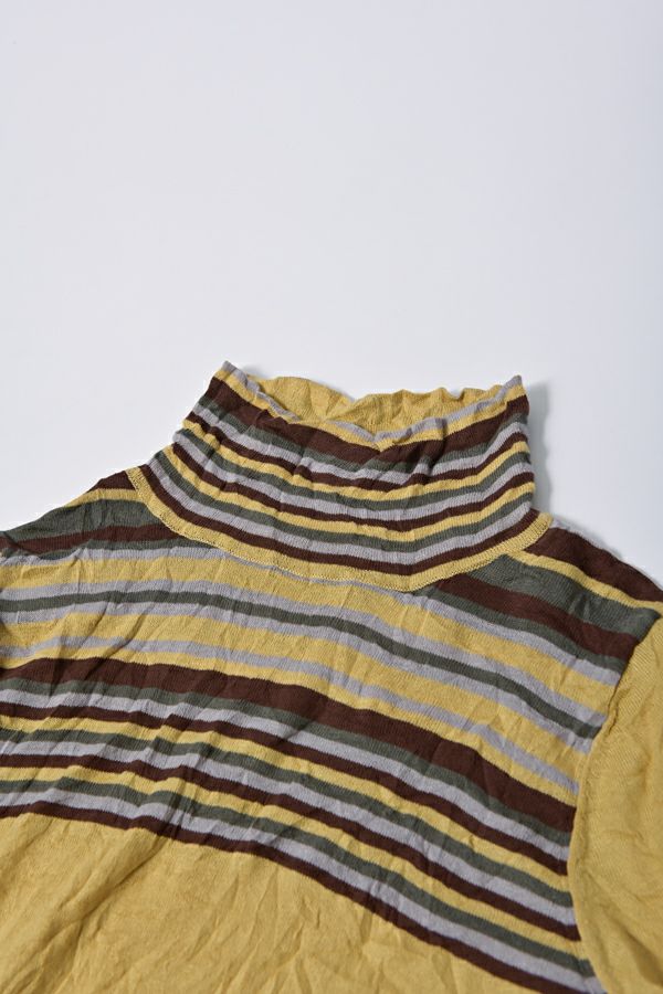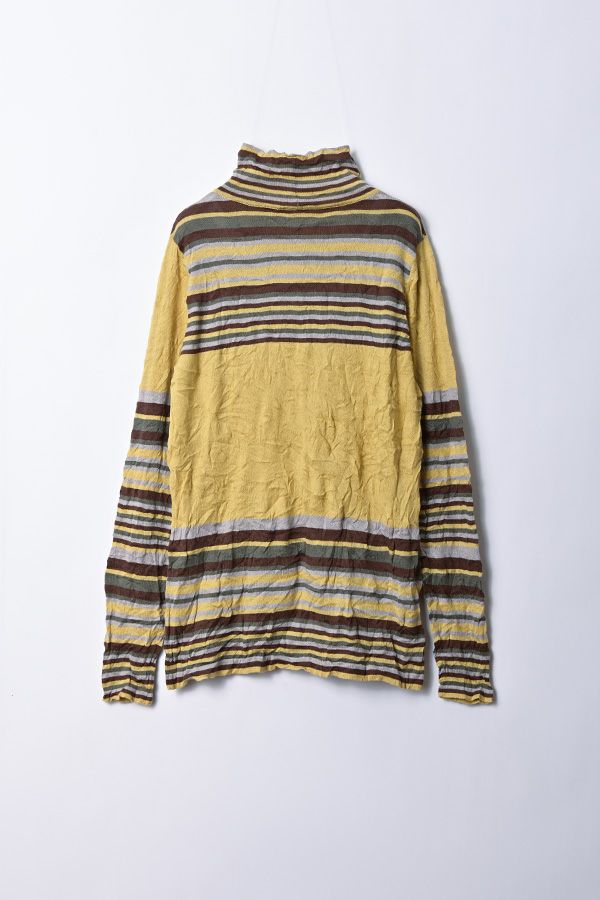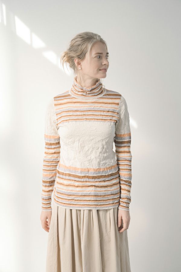 肌触りの良い綿ポリエステルの素材で、真夏以外年中着用可能な素材です。チクチクするの素材はイヤ!とおっしゃるお客様には、喜んで頂ける定番ロングランヒットの一着です。お色違いで買い揃えても後悔しません。 ①洗える! ②薄手でソフト、肌触りが良い ③元々シワが入っている為、洗いざらしのまま着用可能 ④小さくなるのでバックに入り旅行に最適 ⑤ボーダー柄でポイント作れます これが長年愛され続ける理由です。上に何でも重ねられ、衿の高さやフィット感が着こなしをオシャレに仕上げてくれます。職人の絶妙な加減で作られているシワ加工製品は一枚一枚のシワの出方が違う希少価値の高い製品です。 ランダムに入るシワによって体型が出にくい外観にもなっています。伸びも良く何度も着たい優しい肌触りです。 衿の高さは、高すぎず低すぎない実用かつ、オシャレに着こなせる衿元を実現。色々なアイテムの着合わせに最適です。綿とポリエステルの混紡素材で、ソフトな肌触り。 シワ加工に必ず必要なポリエステルは、ポリステルの特徴である熱に強く一度熱で変形させると元に戻らない性質を利用。 ポリステルの混率が高いほどシワ加工のセット性も高くなります。今回ポリエステルの特性を生かして肌に優しい天然繊維の綿素材との混紡素材で市場では少ないシワ加工のセーターを作りました。