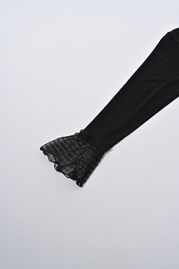 袖口からのぞくチュールのフリルカフスがアクセントになったリブカットプルオーバー。 伸縮性のある着心地の良いリブカットソーで、裾はラウンドし程よいフィット感が特徴。デコルテ周りが綺麗に見える、絶妙なクルーネックも洗練された印象に。 シンプルながらもこなれた雰囲気に仕上がります。 1枚での着用はもちろん、ジャンパ―スカートやサロペットのインナーにもおすすめです。またシャツやワンピースの下にレイヤードで合わせても大活躍間違い無しです。