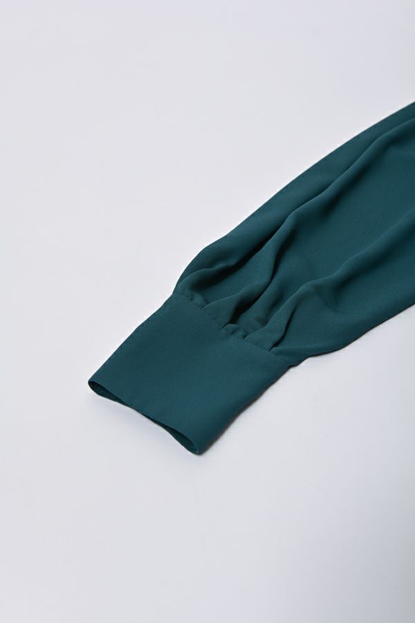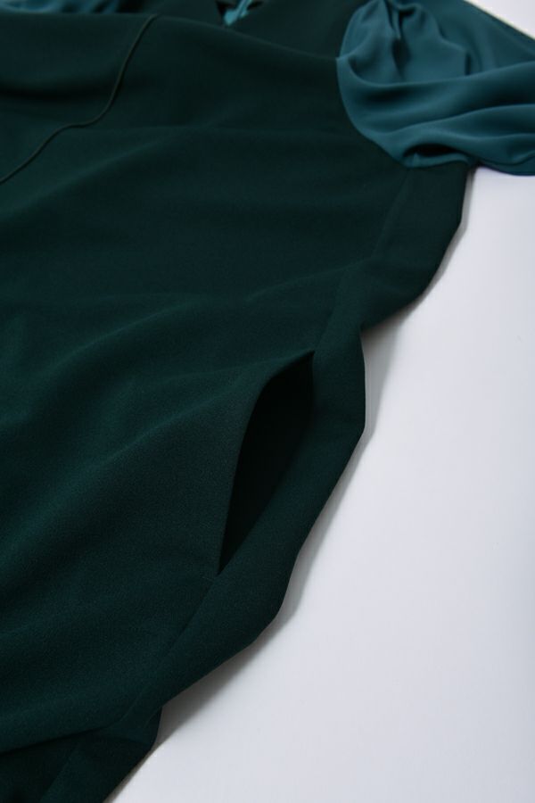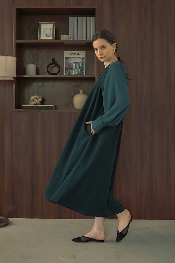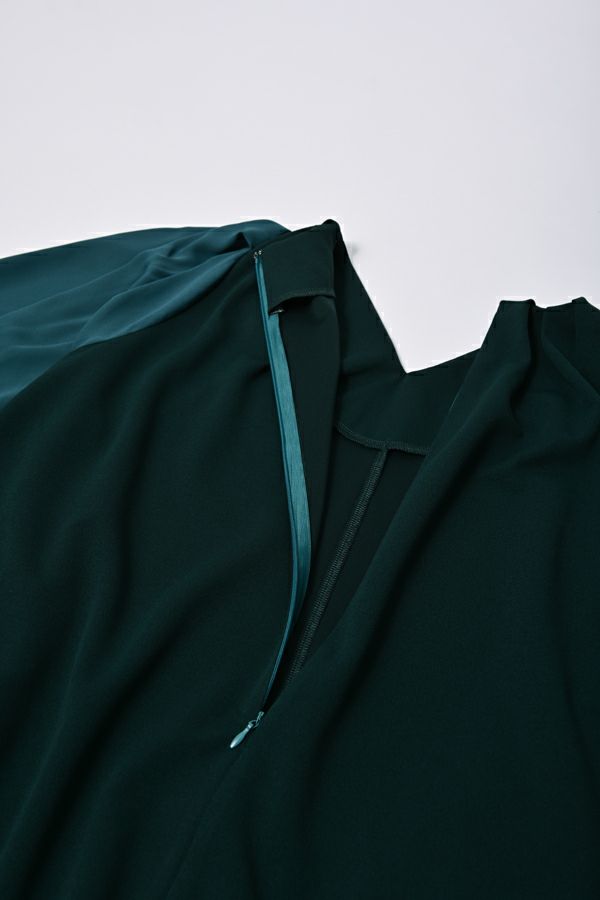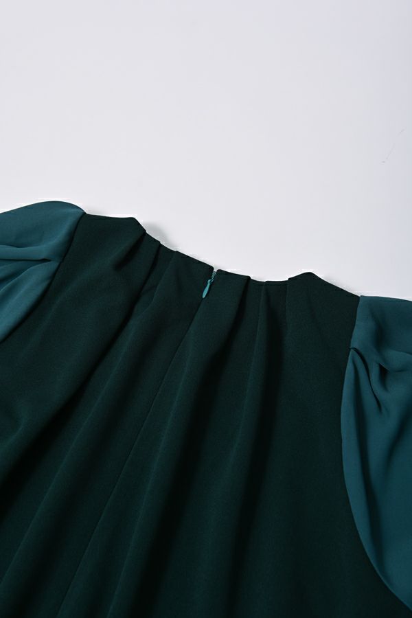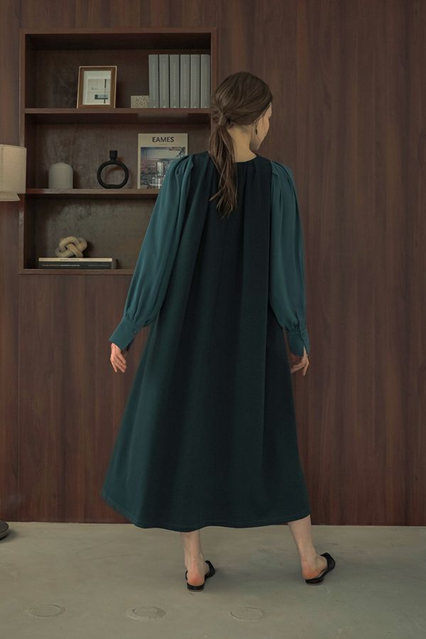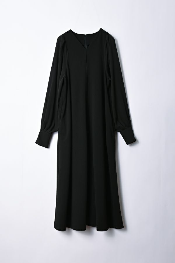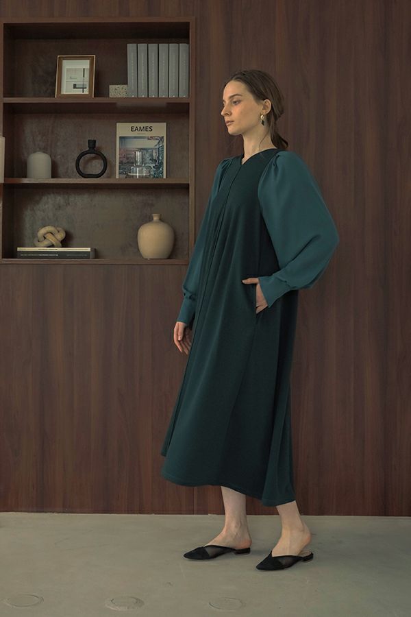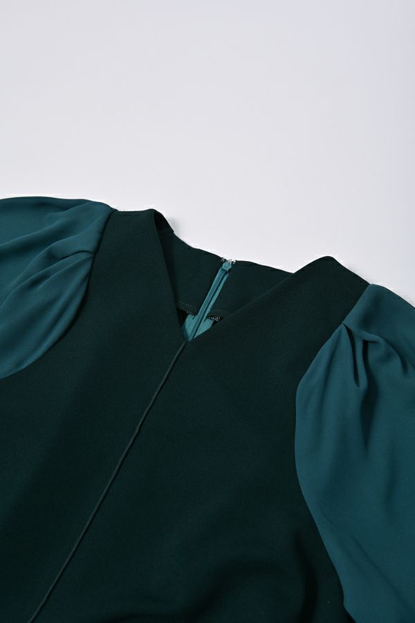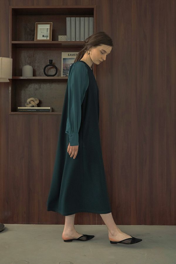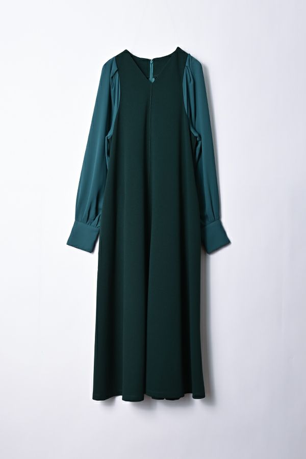 微光沢と落ち感のあるカットソー生地のワンピース。 適度な華やかさもあってオケージョンにもおススメです。袖は透け感のある布帛生地で異素材使いを取り入れ、細い肩巾からアームホールにかけての切替ラインと高い位置でのVネックデザインでスッキリとしたフィット&フレアに仕上げました。 サラッと一枚で着用しアクセサリーやシューズで遊んで楽しんだり、ショート丈のベストやジレと合わせて、今風の着こなしもおススメです。