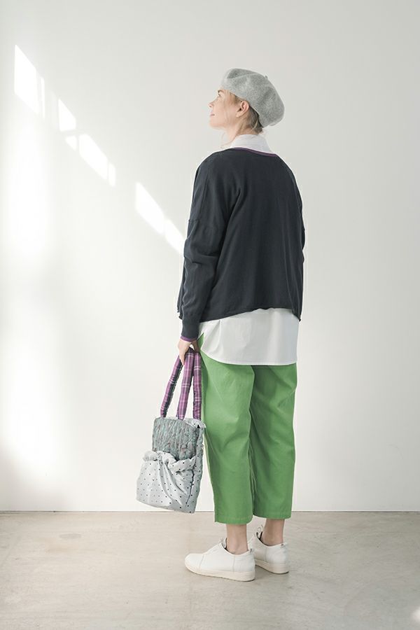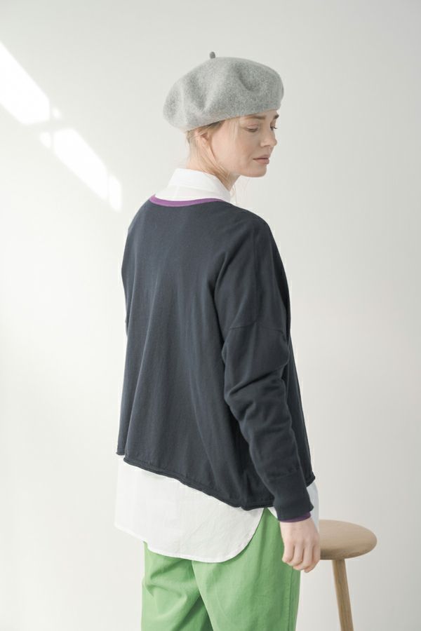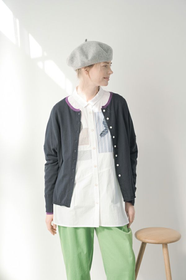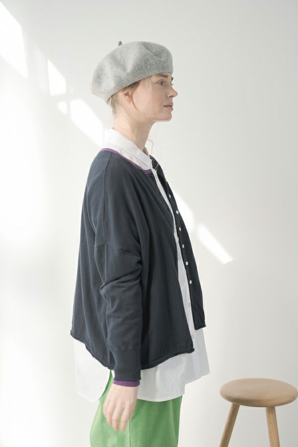 シルク混の滑らかな肌触りが着心地よい前後着用可能なカーディガン。 大きすぎず、小さすぎない絶妙なバランスの衿ぐりが女性らしい衿元をつくってくれます。袖口リブは二枚重ね。上側リブを折り返すと袖口変化が楽しめます。 カーディガンとしてはもちろん、釦を留めるとプルオーバーとしても着用でき、そして後身を前にして浅丸首プルオーバーとしても着用可能の着回しが万能カーディガンです。 シンプルなスタイリングにも、ぱっと羽織るだけで着映えする1着は、カジュアルから綺麗めまで幅広くコーディネートをお楽しみいただけます。 ●ご自宅で手洗い可能