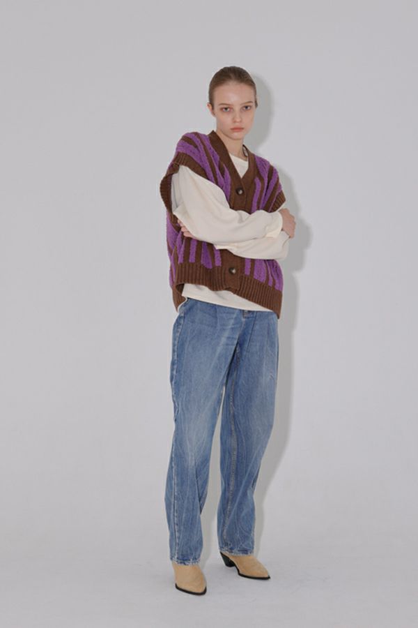 ファンシー糸を立体的に編み込んだ華やかなカラーリングが光るニットベスト。 モール糸(糸全体に直立した毛羽のある意匠糸のことです)を立体的に編み上げ、こなれ感がプラスされつつ、着ぶくれ見えしないようにストライプ柄にすることで縦見えの視覚効果を取り入れたアイテムです。 体のラインを拾いにくい、程よい厚みが着回し抜群のベスト。肌触りも柔らかく着心地が良いのも嬉しいです。デニムなどのカジュアルなアイテムにさらっと合わせるだけで遊び心あるカジュアルコーデに大活躍。 ストレート・テーパードシルエットのパンツを合わせたり、タイトスカートなどでも大人カジュアルをお楽しみいただけます。