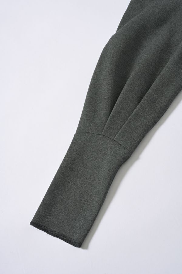 モードなVネック長袖カットプルオーバー。 肩先を落としたドロップショルダーと前後のネックラインがしなやかでリラクシーな雰囲気がポイントです。 カットソー素材でカジュアルになり過ぎないように、袖口にかけて絞ったような長めの切替とタックを入れてフィット&ボリュームな袖シルエットにも拘りました。 ラグウォームモイストポンチ生地使用でモチッと感のある風合いが快適な着心地。 タイトスカートやデニムに前裾をウエストインして、後ろに抜いて着るのもおススメです。 インナーにブラウスやカットソーを重ねて、裾を出すレイヤードスタイルも◎ ラグウォームモイストポンチとは →湿気や汗を熱に変える吸湿発熱性がある為、暖かさを実感できます。 加工工程に拘ることによって生み出されたソフトな風合いと滑らかな肌触り に加えストレッチ性にも富んでいるので、心地よい着用感が楽しめます。 ピリングもしにくく、機能性・ファッション性・安定性を兼ね備えたJapan quality 素材です。