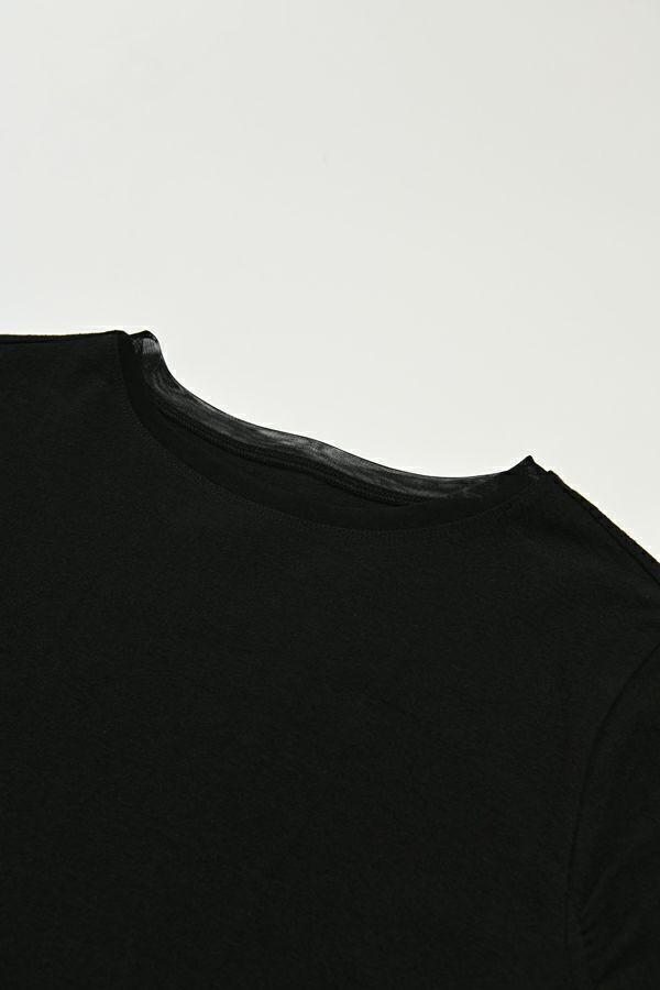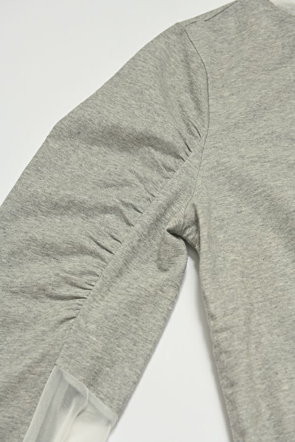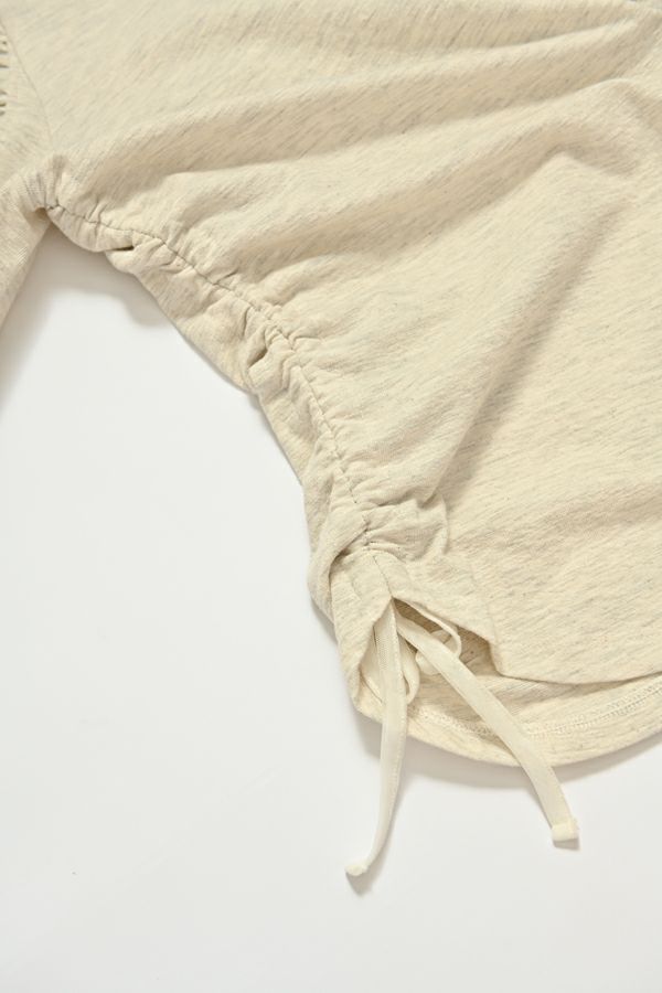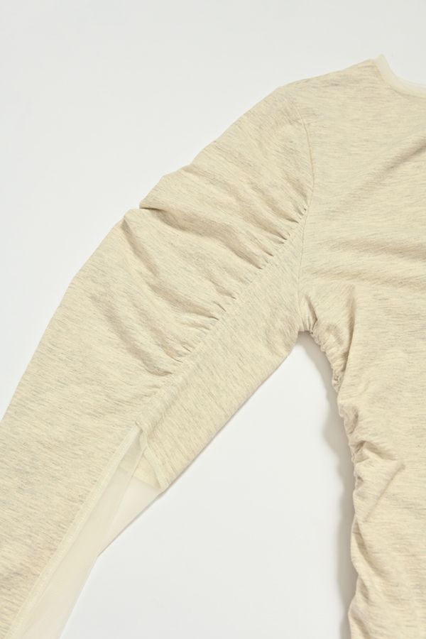 トレンドのパワーショルダーが目を惹くロンTEE。 シャリ感とドライな手触りが特徴的な生地感が新鮮。肩~袖にかけてボリューム感が加わったデザインのパワーショルダーは、存在感抜群。 身頃の両サイドをドローストリングさせ、シャーリングを作ると裾がカーブになり、全体にバランス良く立体感が出ます。 衿と袖下にメッシュ地の切替を入れ、程良いシアー感と華奢見えの要素もプラス。 後ろ姿にも拘りのアクセントを。大人っぽいレタリングで『Destiny』のロゴプリント入り。 存在感のあるデザインでワイドパンツ合わせから、タイトスカートなど幅広い着こなしと好相性です。メンズライクなボトム合わせで、大人のこなれ感あるスタイリングがおススメです。