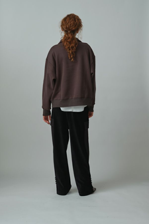 オフの感性、抜け感を操る大人スウェット。 柔らかな裏起毛とハーフジップのバランスが絶妙な、都会派スウェット。綿/ポリエステルの混紡素材は、綿100%に比べて速乾性があり、冬場のケアもスマートに。ふっくらとした肉感がありながら、軽やかで扱いやすいのも嬉しいポイントです。 胸元には、温もりのあるフロッキープリントで個性をひとさじ。 【SEARCH "5088" WHICH WAY TO FOCUS… WHAT CALLS YOU?】 というメッセージには、自分を中心に、広く世界を見渡した先で心が惹かれるものを探す…という意味が込められています。直感や衝動を大切にする、大人の感性に響く一着です。 カジュアルな印象のハーフジップも、ウールのワイドパンツやセンタープレス入りのきれいめボトムと合わせることで、洗練されたミックススタイルに昇華。ボトムにボリュームを持たせれば、力の抜けたこなれ感が自然と生まれます。フロッキーの色味に合わせた足元で、スタイリングに一貫性と奥行きを。 オンでは見せない表情を引き出してくれる、マインドフルなオフのための一枚。