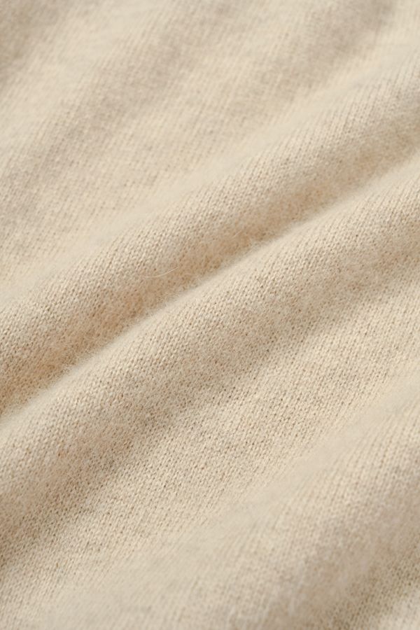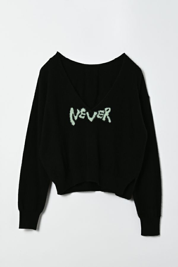 抜け感で魅せる、強さのニュアンス。視線を惹きつける上質ニット。 柔らかなウール混素材に、深めのVネックで抜け感を加えた、大人のためのロゴニットプルオーバー。胸元にあしらった「NEVER」のロゴは、フェザーヤーンで立体感を出しつつ、視線を惹きつけるアクセントに。“NEVER conform”ファッションで自分を自由に表現したい、強くしなやかに生きる女性の姿を象徴。 上品なニュアンスカラーとシャープなフォルムが絶妙に調和し、着映えする大人仕様。インナーを少しのぞかせてVネックのラインに抜けを作れば、よりこなれた印象に。 ボトムはテーパードパンツで洗練されたマニッシュに、タイトスカートで凛とした女性らしさを加えるのもおすすめです。オンもオフも、妥協しない自分のために選びたい一枚。●フェザーヤーンとは 羽毛のようにふわふわとした長い毛足が特徴の糸。