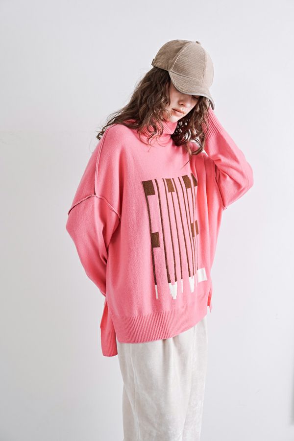 抜け感に、遊び心を。エフォートレスに着映えるロゴニットプルオーバー。 身体のラインを拾わない力の抜けたシルエットが醸し出す大人の余裕に大胆なロゴ使いが目を惹く着映えアイテム。 程よくゆとりのオフタートルはバックスリットを入れて後ろ姿も抜け感をもたせています。肩とアームホールは縫い代を出した配色ステッチが遊びを演出。 スッキリシルエットのボトム合わせでYラインシルエットコーデも良いですし、落ち感ある素材のボトムと合わせてこなれ感漂うスタイリングもお楽しみいただけます。