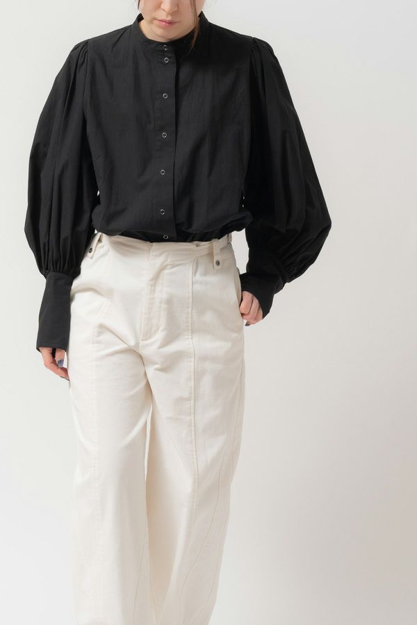 大胆なボリュームのお袖が特徴的なコットンシャツ。 張り感のある素材で構築的なシルエットに。 裾のカーブラインは脇で曲線で繋げて柔らかい印象になり、後ろヨークはウエスティンシャツのカットでワンポイントプラス。 360度どこから見ても抜かりない拘りのシャツです。