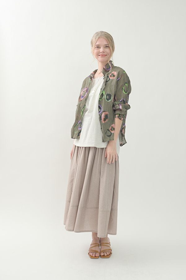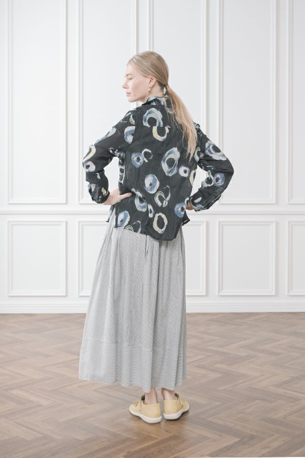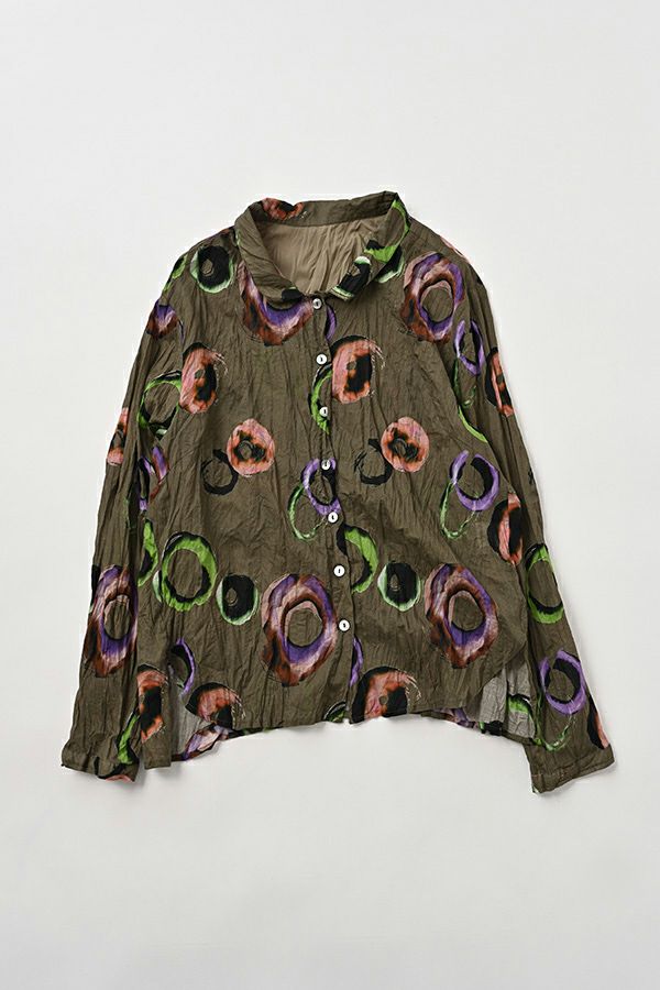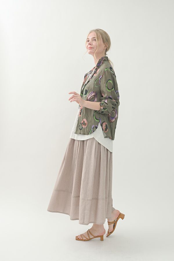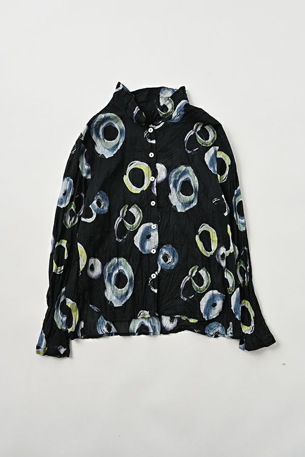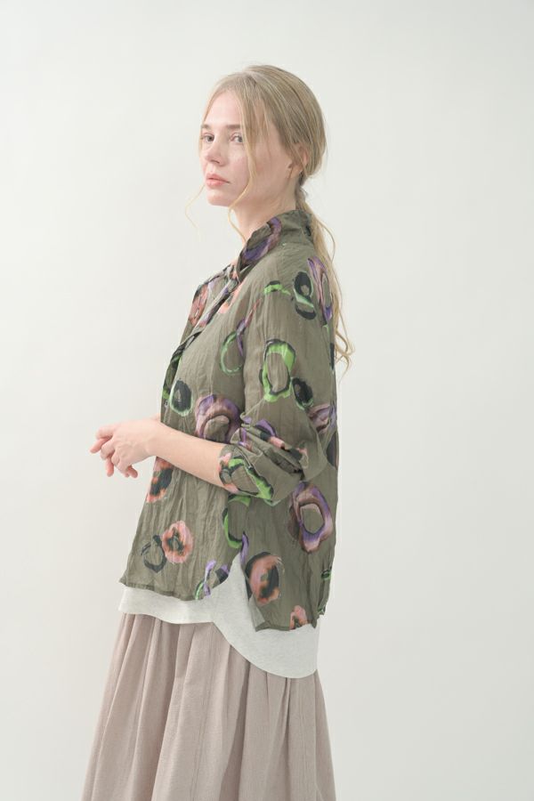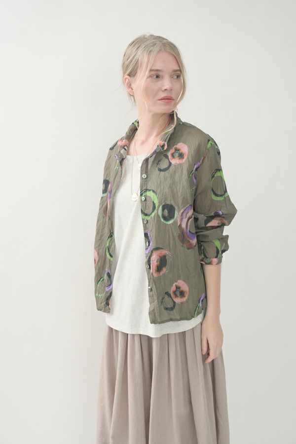akaneオリジナルのサークルドットプリントはスッキリとしたカラーで動きのある柄です。 ワッシャー加工を施しているので、洗濯や保管に気を使わず、サッと羽織れるブラウスです。並んだ釦が可愛らしく、釦を大きく開けると首を長く見せれます。 旅行や持ち歩きにも最適のアイテムです。フワッと広がるギャザースカートを合わせてるとバランス良く見えます。