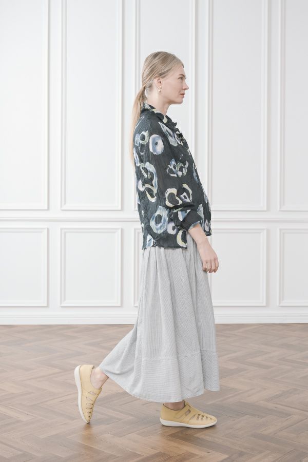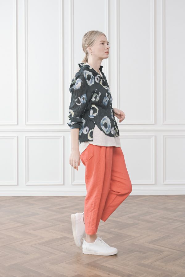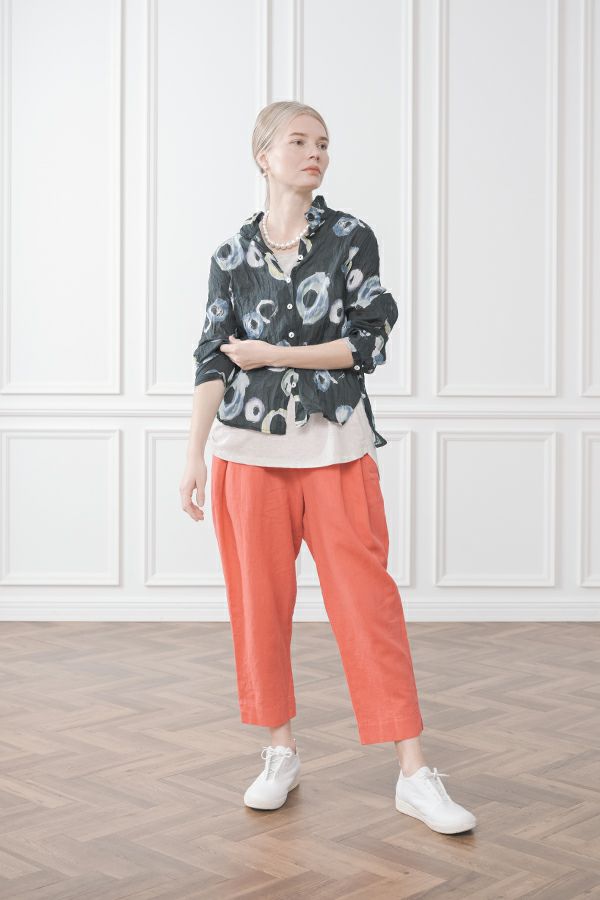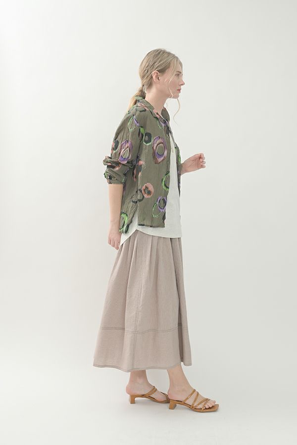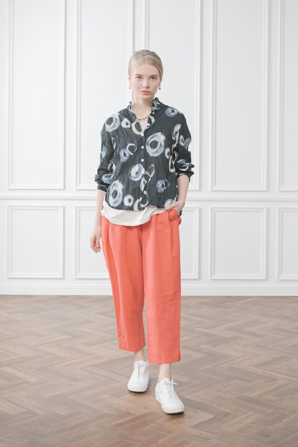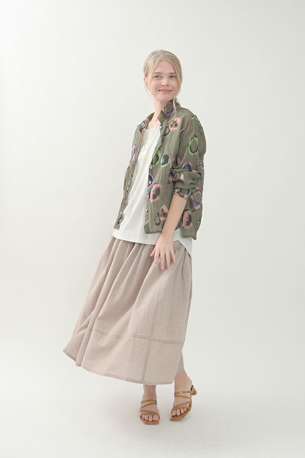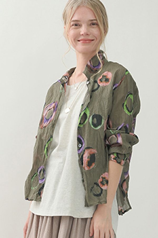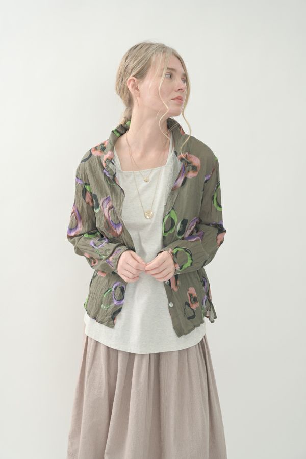 akaneオリジナルのサークルドットプリントはスッキリとしたカラーで動きのある柄です。 ワッシャー加工を施しているので、洗濯や保管に気を使わず、サッと羽織れるブラウスです。並んだ釦が可愛らしく、釦を大きく開けると首を長く見せれます。 旅行や持ち歩きにも最適のアイテムです。フワッと広がるギャザースカートを合わせてるとバランス良く見えます。
