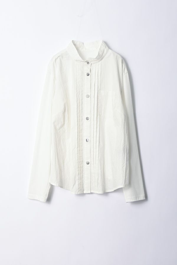 定番バックカットブラウス。前はピンタックの綿生地で後ろと袖はカットソーのインナーシャツ。 細いスタンドカラーは襟元をきちんと見せます。 前は軽くワッシャー加工入り。お腹が隠れる丈でカーブを付けてます。 後ろと袖のカットソーは伸縮性があるので着心地抜群! ①サイズ感はそのままキープ。 ②綿生地は、少しハリ感があり 目が詰まった綺麗めタイプに。 ③カットソー地は、吸湿・速乾の機能性素材を使用。 ④着用時、熱がこもりにくく より快適な着心地にバージョンアップ! ⑤シーズンレス 様々なアイテムのインナーに合わせられるお役立ちアイテムです。