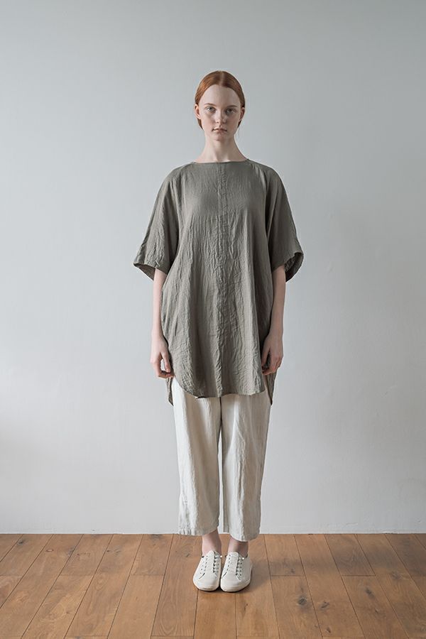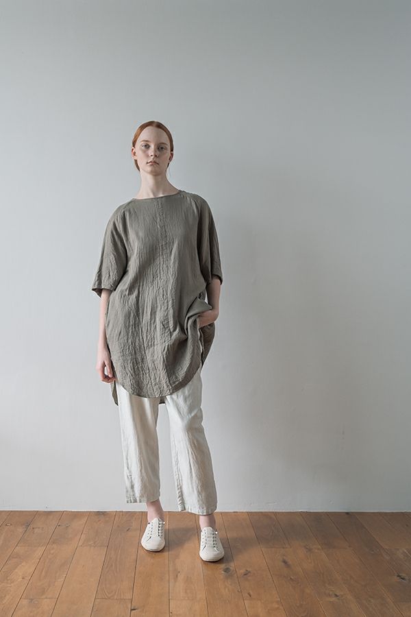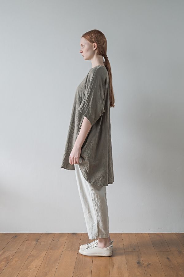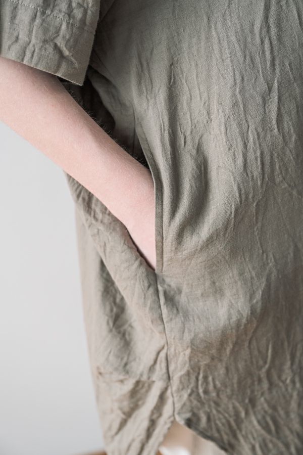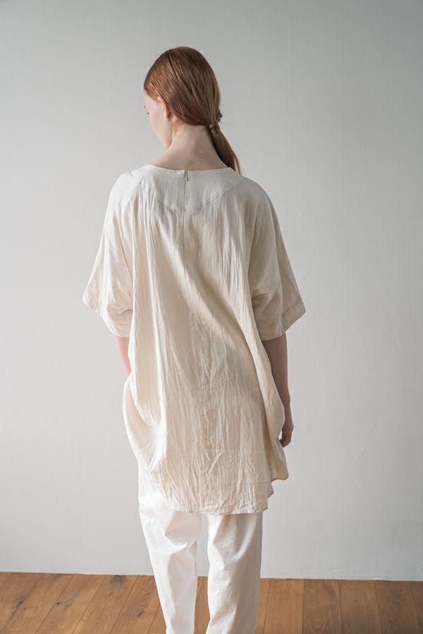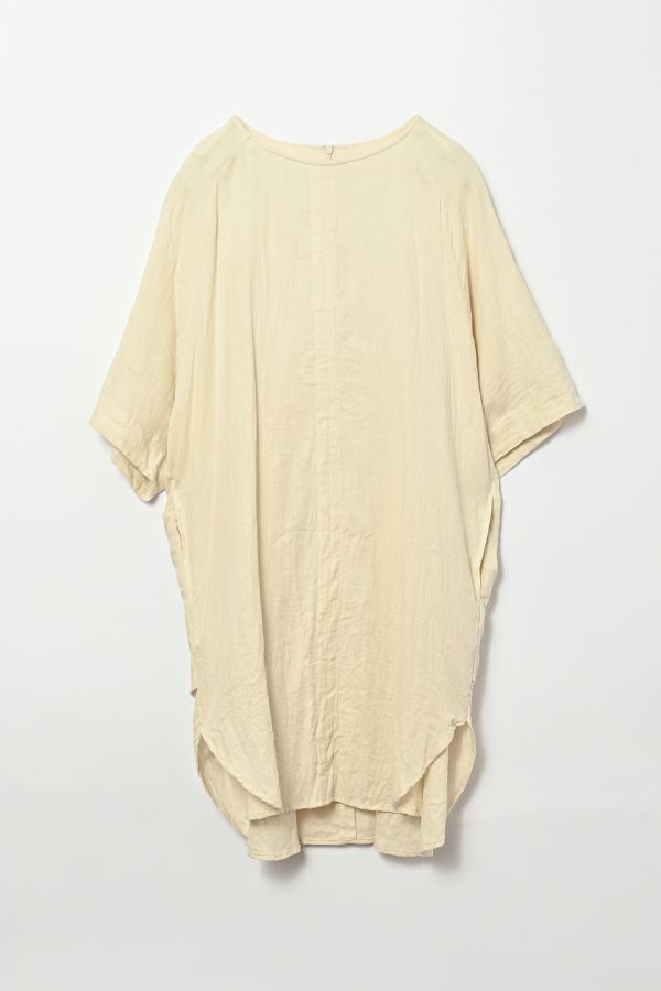 デリケートなお肌の方にも安心の着心地を提案、ナチュラルなチュニックワンピース。 今夏から新シリーズの「BINKAN-SAN」 *カサカサした乾燥肌 *ホルモンバランスや季節によってゆらぐ肌 *アレルギーの痒みや肌トラブル *静電気の刺激で痒みやチクチク ずっと敏感肌で悩んでいたデザイナー目線でデリケートなお肌の方にも安心の着心地を提案します。素材だけでなく内側の縫製にも気遣い、一番気になるチクチク感が無く、オールシーズンにわたり、つい手に取ってしまうシリーズです。 日本製のソフトで膨らみのあるダブルガーゼ素材は、イージーケアでソフト。サラッとした肌触りが良い、自然な風合いそのまま、ノーアイロンで着用可能。 体を包みこむようなゆったりした分量感とラグラン袖。気になる体形をすっぽり隠しながら1枚でサマになるコクーンシルエットアイテムです。 前中心の縦に入っただダブルステッチと、前寄りの脇線が視覚効果でスッキリ見せてくれます。大きくラウンドした脇裾と深いスリットで、足さばきも良く歩くたびにソフトな素材感に動きが出て、大人の余裕を醸し出す。 ●日本製