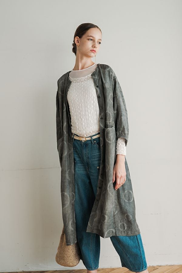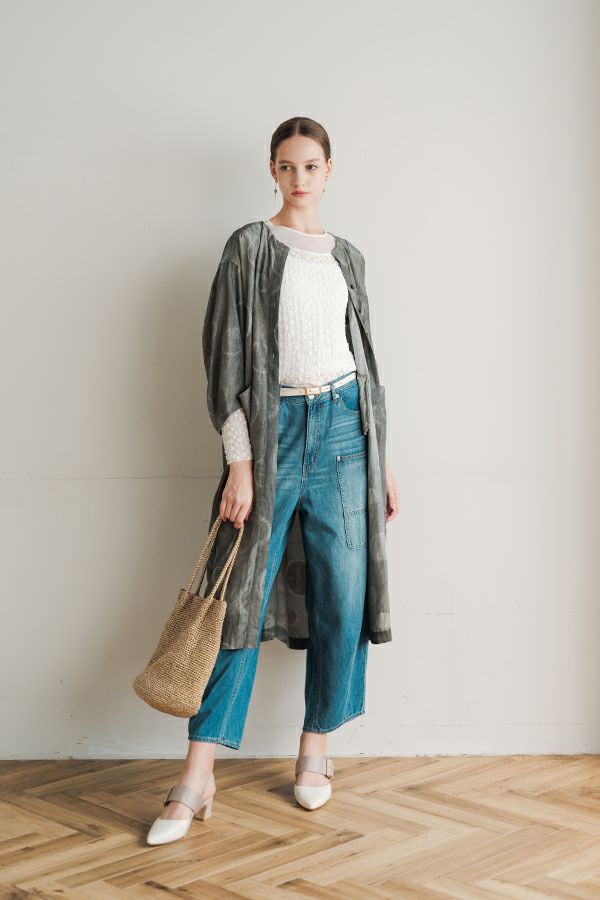 横長の襟ぐりは、シャツやニットのインナーとしても合わせやすく、前を開けて重ねるだけでさりげなく華やぎを演出。春のスタイリングに大人の特別感を添える、こだわりの一枚です。