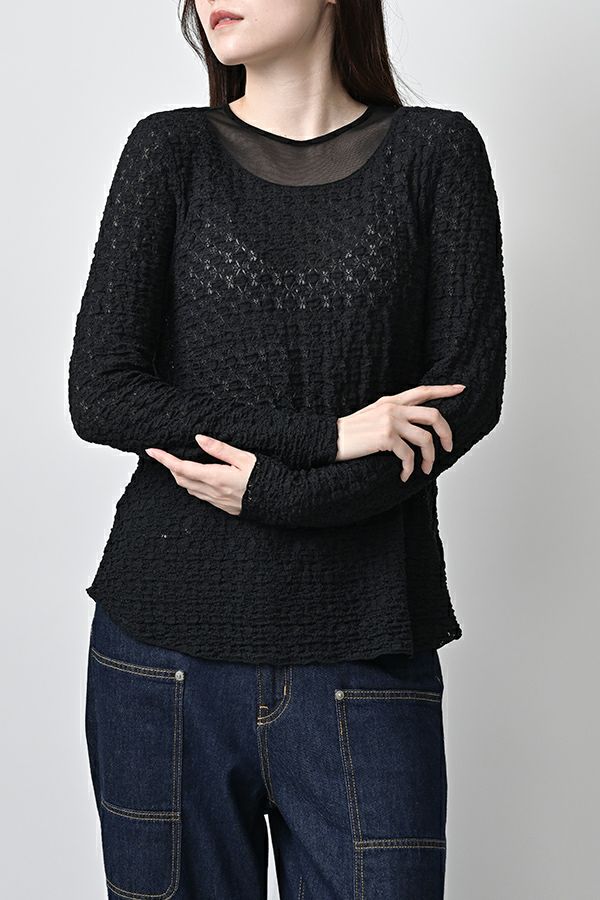 オーガニックレースを使用したシュリンクレースは、ポリウレタンを加えることで立体的な凹凸感を表現。首周りの透け感あるチュールが、華やかで女らしい印象をプラスするゴージャスなインナーに仕上がりました。