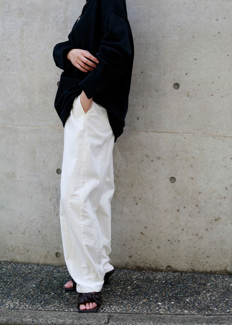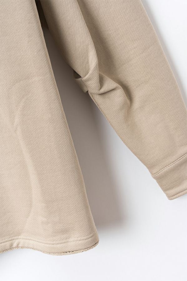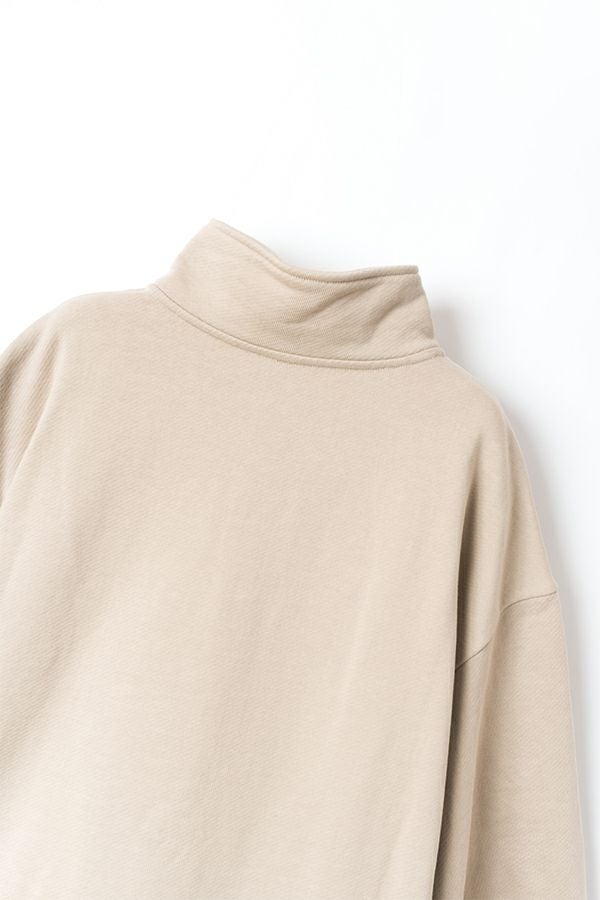 しっかりとしたウェイトの裏毛素材で、カジュアルすぎない印象に仕上げたプルオーバー。 身幅はゆったりしていながら、すとんと落ちるすっきりしたシルエットに。お袖はあまり太くしすぎず、袖口はシャツの様なケンボロ仕様で少しきちんと感もプラス。 ハーフジップの裏にテープをかませて肌に金具が触れないようにしております。スウェットではカジュアルすぎるという方に、オススメのアイテムです。