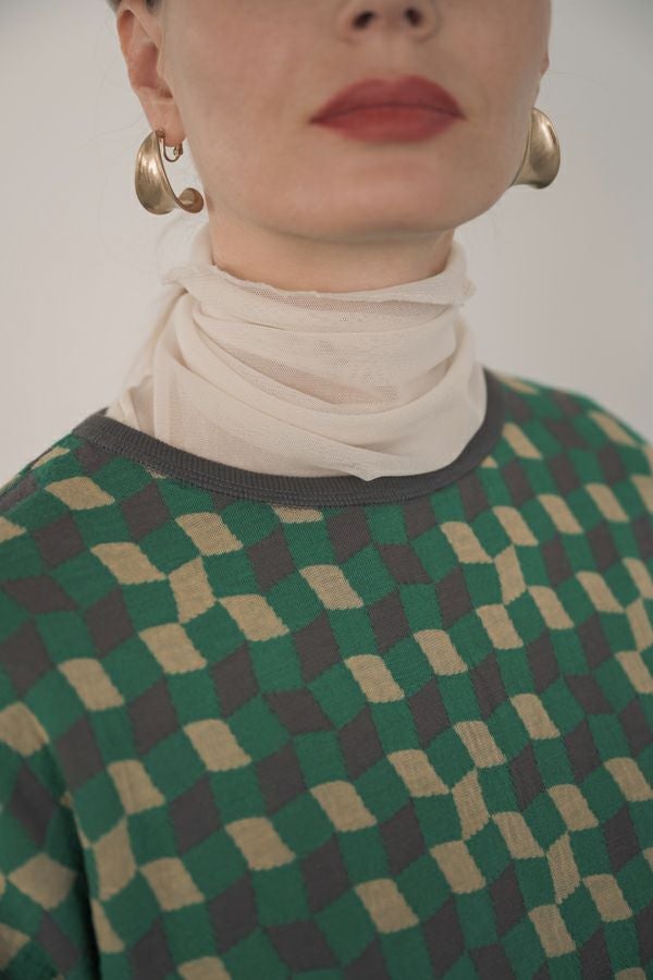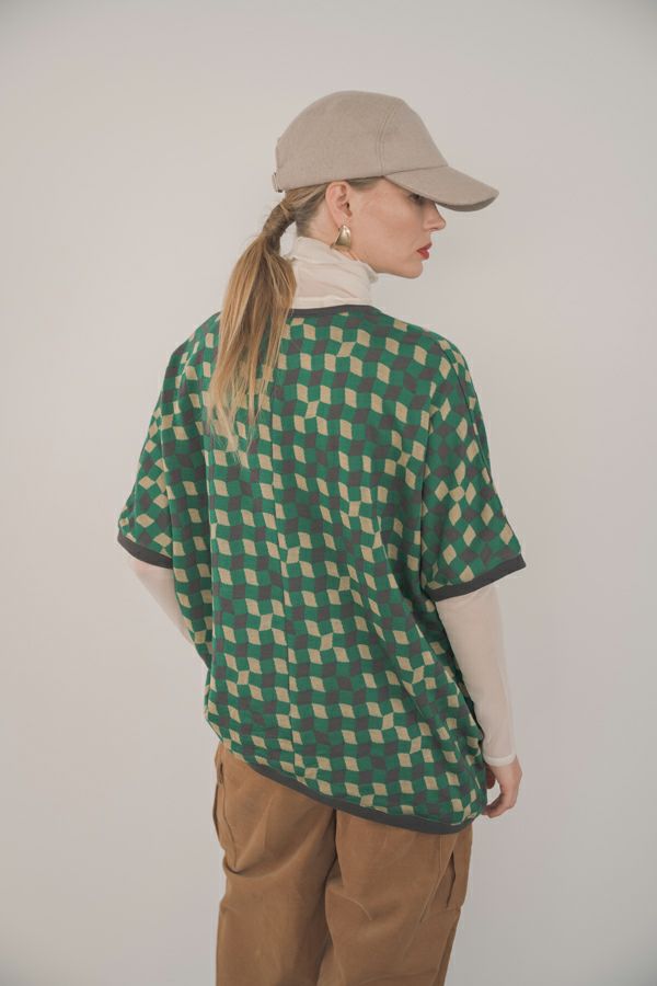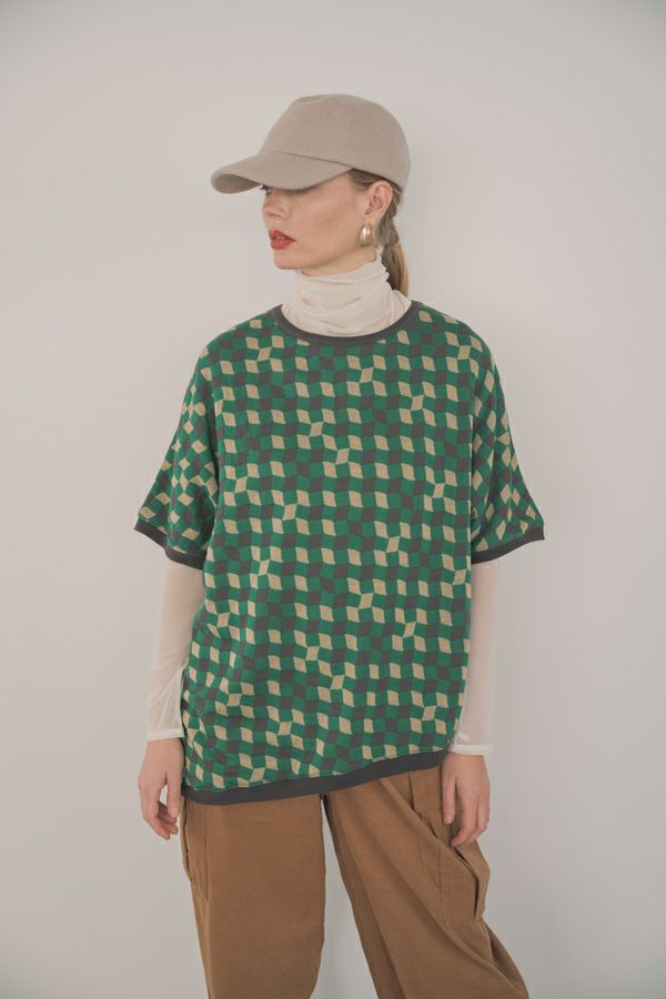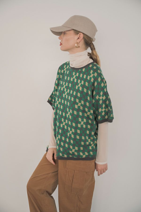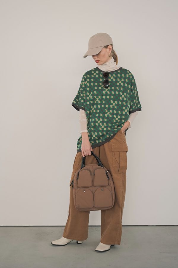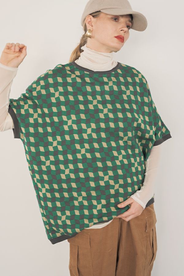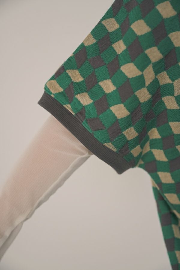 毎シーズン提案の日本製オリジナルテキスタイル。 ゆったりサイズの変形プルオーバーはシーズンの立ち上がりから使えるアイテム。最初は5分袖プルオーバーとして着用し、肌寒くなると、インナーにハイネックP/Oを合わせてベストとしても使える1枚です。