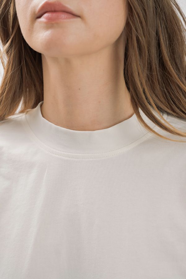 毎年大好評のakane定番リラックスカットソー! ソフトな綿ポリウレタンのカットソー素材は伸び伸びラクチンで透けにくく着やすさ抜群です。 着こなし易い低いハイネックの衿とインナーにぴったりのショート丈ですが裾が大きくラウンドして前後差をつけて気になるお腹周りを隠します。今年は春らしい#22クリームイエロー、#32オレンジがアクセントカラーでお顔映りをきれいに見せます。