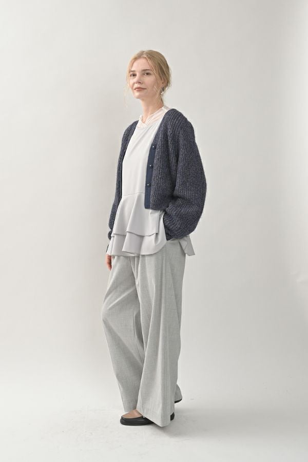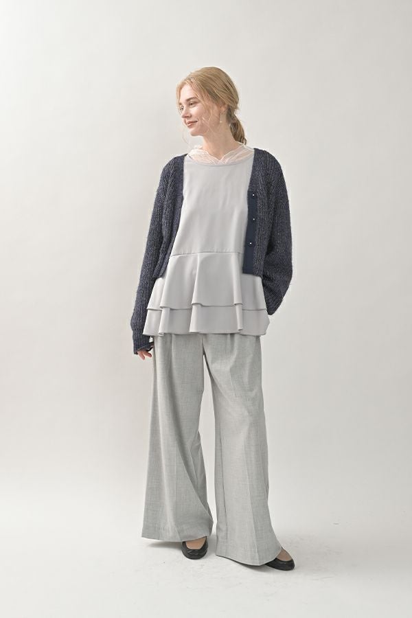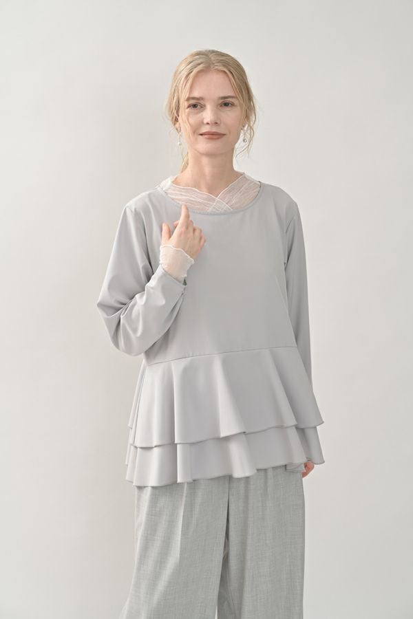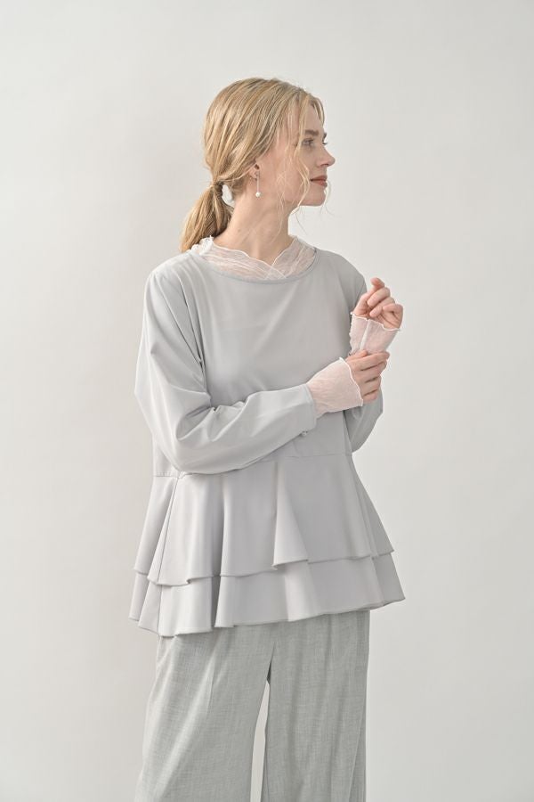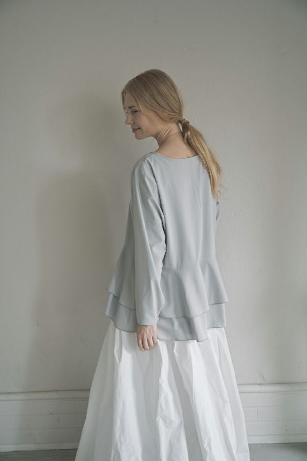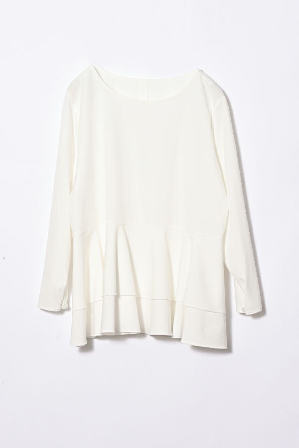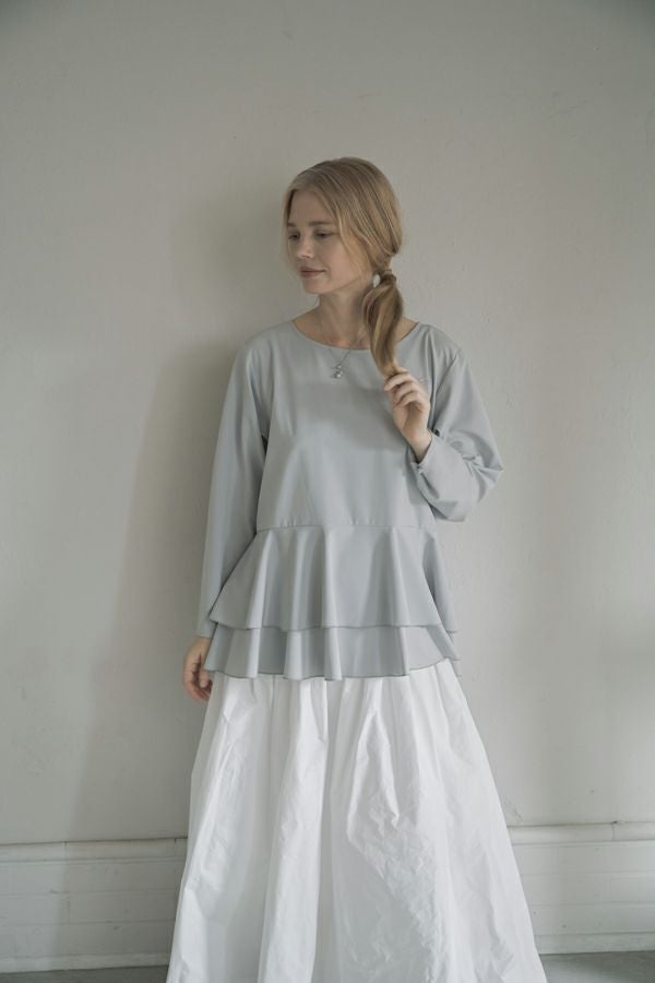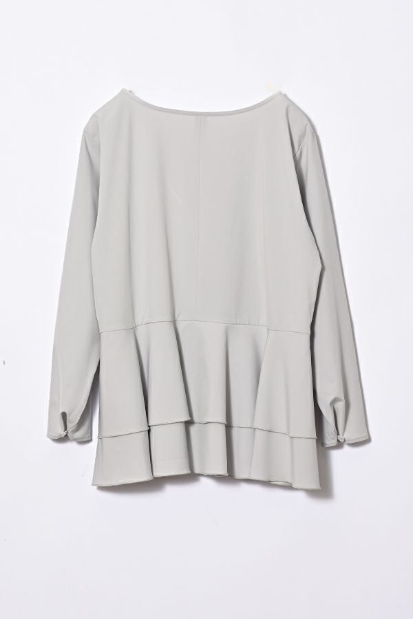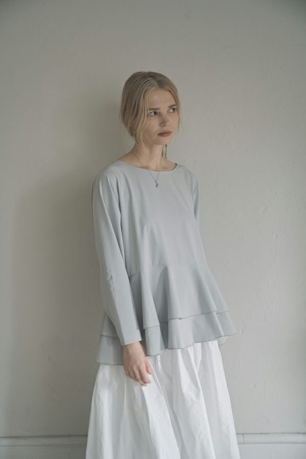 裾部分に2枚重ねたフリルが素敵なブラウス。 腰のラインに2重に重ねてボリューム感があるので、タックパンツなどにあわせてもお腹周りが目立ちにくいのも嬉しいポイント。落ち感のある素材で、サラリと肌馴染みも良くノンストレスに着て頂けます。衿元は緩めに開いているので、女性らしい印象に。 キレイめのパンツを合わせて、オケージョンやオフィスカジュアルにも使えます。衿元が気になる場合は、インナーにメッシュプルオーバーを合わせてレイヤードでも楽しめます。 ジャケットやニットカーデを羽織った時に、前あきの裾から見えるフリルで より上品なスタイリングが叶います。