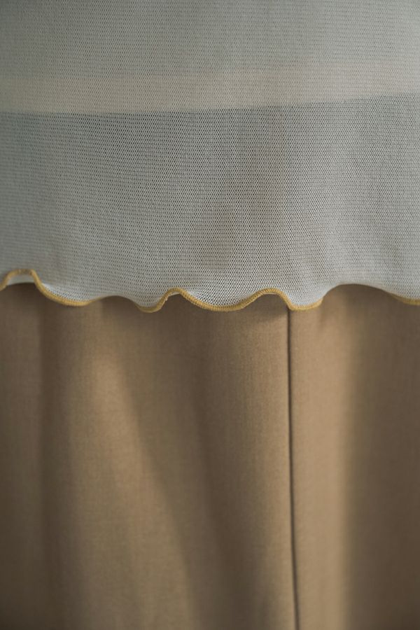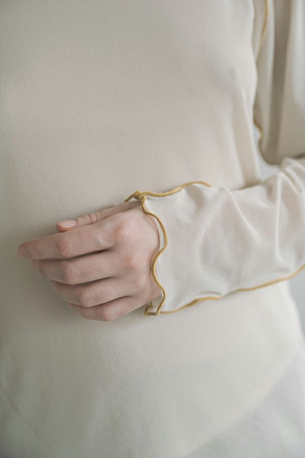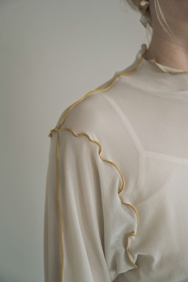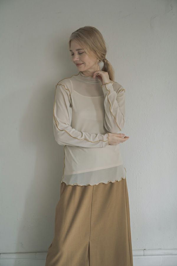シンプルなデザインが魅力のシアーハイネックプルオーバー。 コンパクトなシルエットと後ろに入ったスリットで大人の抜け感を演出。ソフトで優しい風合いのメッシュ素材を使用し、配色のメロウステッチがシンプルな中にモード感漂うデザインアクセントになっています。 通常のインナーメッシュタイプより 身頃を少しゆったりめのシルエットにすることで、よりカットソーブラウスとして着用しやすい一枚です。 キレイめなジャケット合わせはもちろん、カジュアルなスウェットやロンTEEのインナーに使ったり、メンズライクなシャツのインナーに合わせて華やかさを出すスタイリングもおススメです。