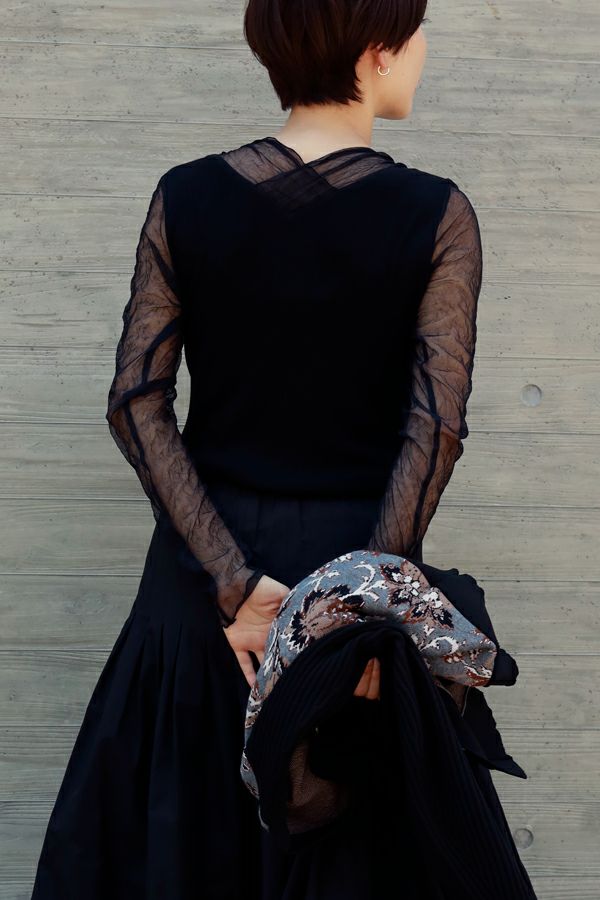 イリブ生地とクラッシュメッシュ切替でのシアー感が今年らしい着こなしに欠かせない日本製 ロンTEE。 素材は特殊なアルビニスタシフォンテレコ素材で、肌触りも良いコットン100%で優しい着心地になっています。今年らしくやや長めのメッシュ袖は、くしゅっと軽くたくし上げて手元のニュアンスを楽しんだり、ブレスレットを合わせるのも素敵です。 着心地の良さとさり気ないシアー感で一枚はもちろん、ニットやジャケットのレイヤードアイテムとしても最適です。 【アルビニスタシフォンテレコ】(イタリア糸) → 細番手の綿をテレコ組織で甘く編み下ろし、肌離れの優れたエアリーなタッチと程良い透け感が新鮮な素材の生地。