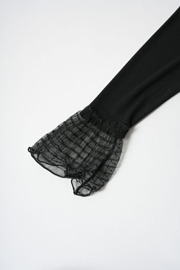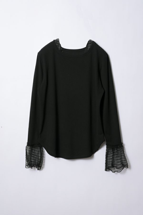 袖口からのぞくチュールのフリルカフスがアクセントになったリブカットプルオーバー。 伸縮性のある着心地の良いリブカットソーで、裾はラウンドし程よいフィット感が特徴。デコルテ周りが綺麗に見える、絶妙なクルーネックも洗練された印象に。 シンプルながらもこなれた雰囲気に仕上がります。 1枚での着用はもちろん、ジャンパ―スカートやサロペットのインナーにもおすすめです。またシャツやワンピースの下にレイヤードで合わせても大活躍間違い無しです。