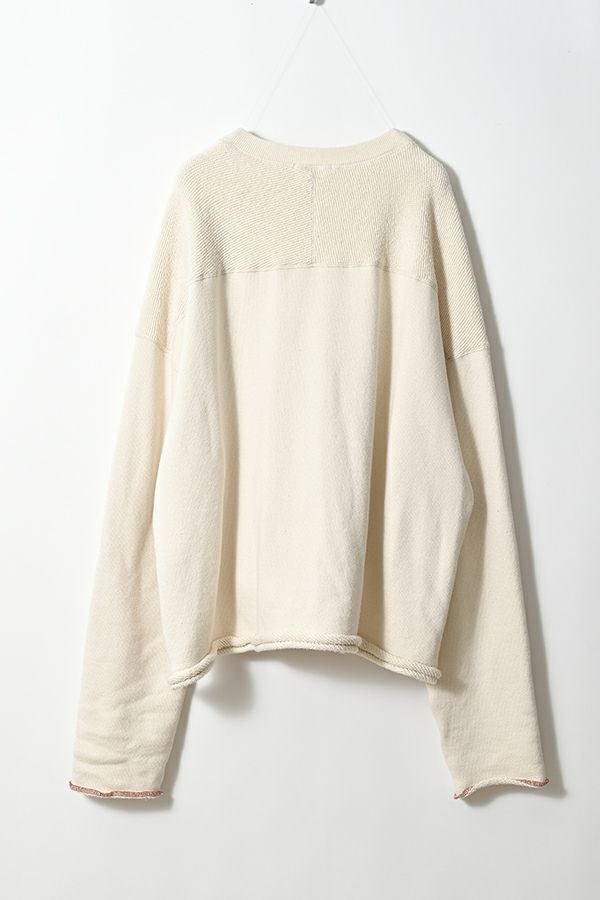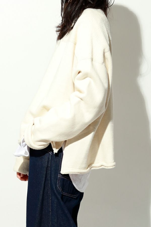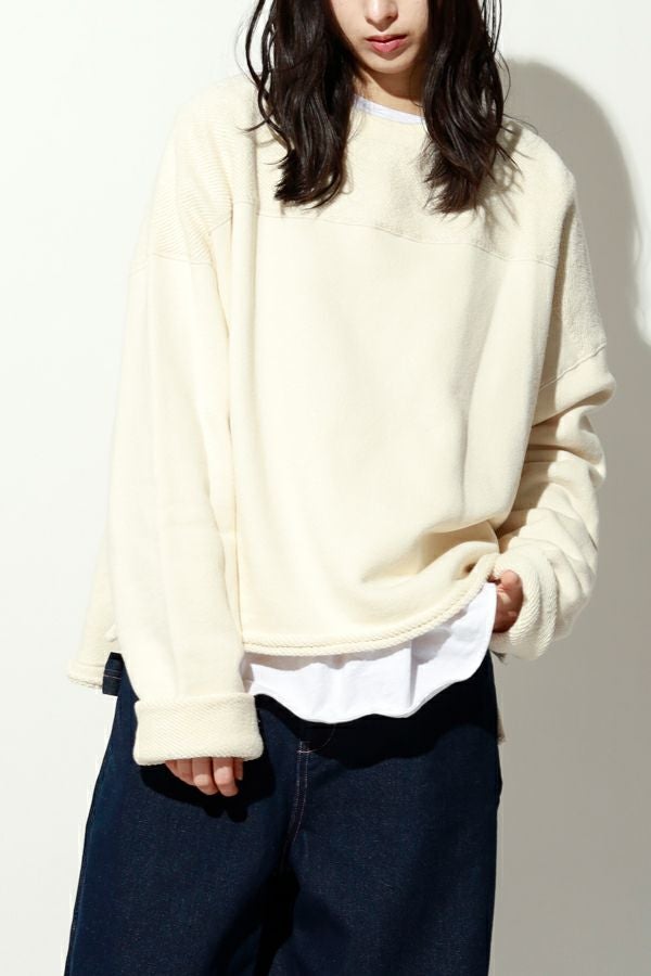 お待たせしました!追加入荷いたしました。 『ダボっと』したシルエットが可愛いトリニティ裏毛のプルオーバ―。 トリニティ裏毛は表面は太番手の糸でざっくりとしたラフな表情が特徴的で、触ると柔らかくふわっとソフトな触り心地。ユニークで可愛く、裏面と表面とで表情の違うこの生地を活かすために、両面使いのデザインにしています。 古着のスウェットなどに見られる、肩線のないディテール。 袖はあえて長くし、折り返して着ることによって、この生地をより楽しめます。 男性でも着用可能なユニセックスサイズです。 ●日本製