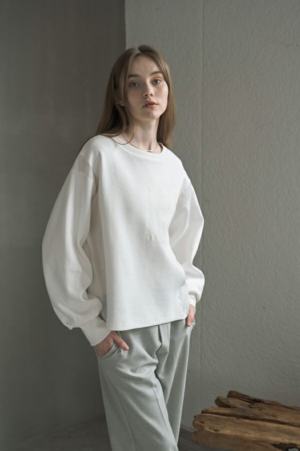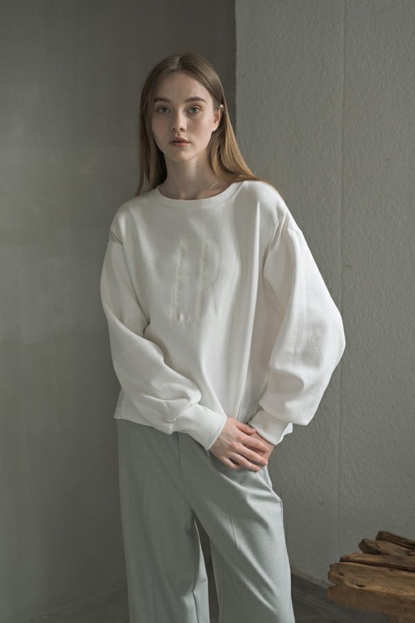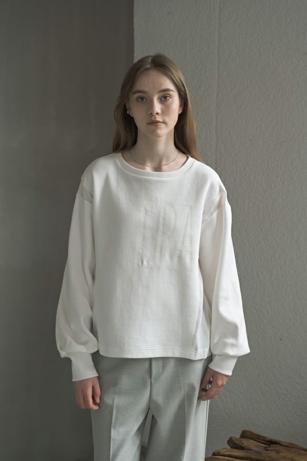 大きなロゴプリントが目を惹くワイドサイズのカットソープルオーバー。 着心地はスウェット級にラクなのに、キリッとしたエレガンスをほのかにまとえるダブルジャージ生地。 わずかにワッシャーのある生地表面と、透け感のある布帛生地の切替テクニックを取り入れたデザインでメリハリのある印象に。 裾に向かって丸みのあるコクーンパターンで、ストンと落ちるシルエットと袖口のリブで実用的にまとめています。 スラックスやデニムパンツ、マキシ丈のタイトスカートなど上品な大人コーデがおすすめです。 カジュアルなアイテムなので、あえてキレイめのボトム合わせも新鮮です。