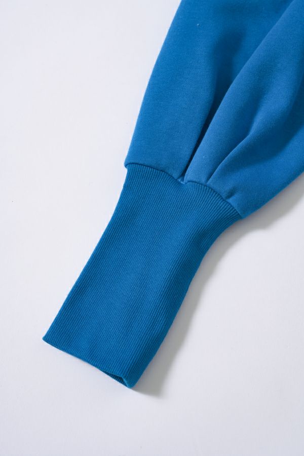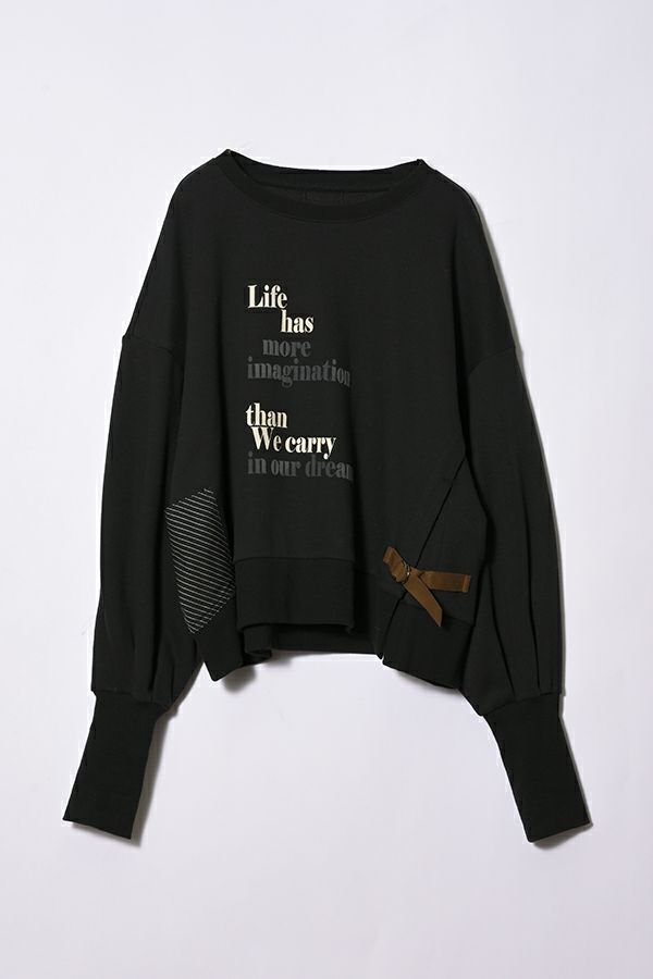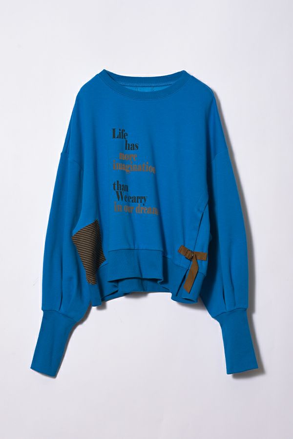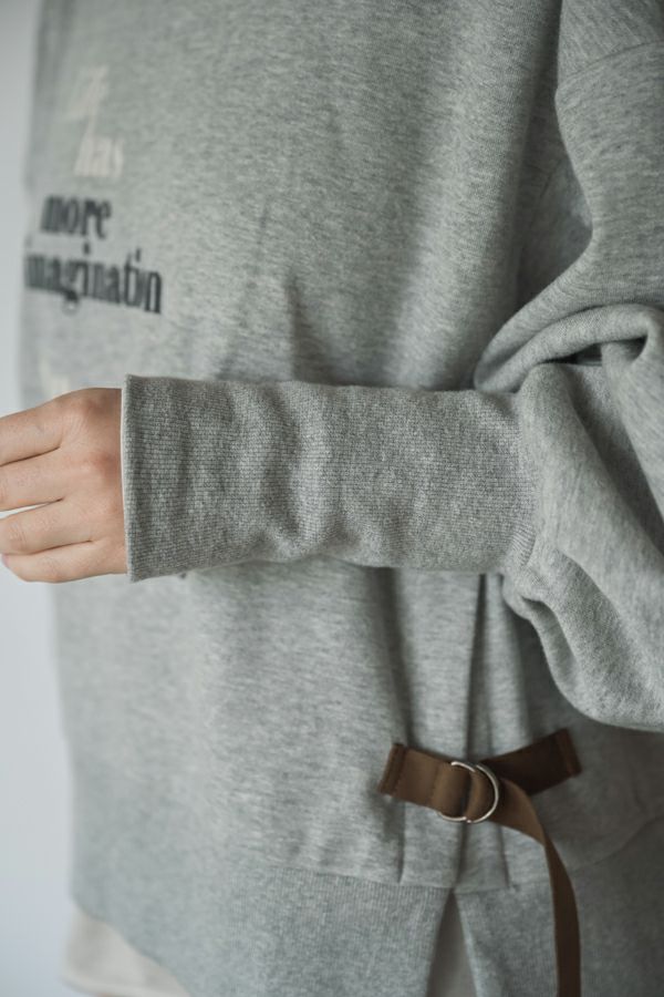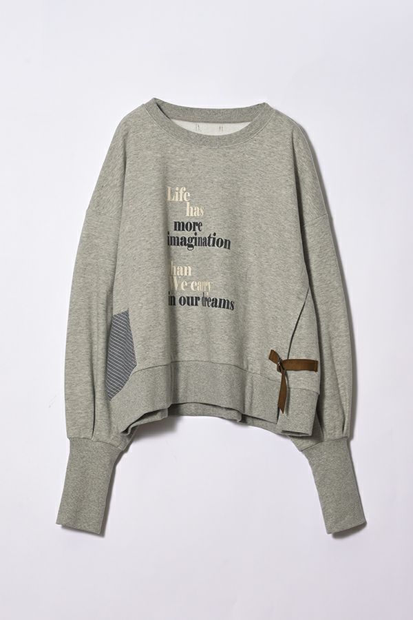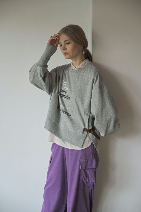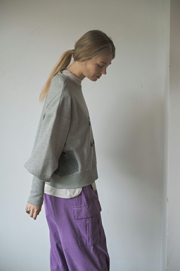 袖のシルエットが際立つショート丈裏起毛トレーナー。 カジュアルになりがちな素材感を"大人が着れる"トレーナーに仕上げた拘りのアイテムです。 右脇に布帛ポケット、左脇に合皮テープ+Dカンがつくデザインでメリハリをつけ、胸元にはアンバランスに入るフロッキーロゴプリントで視線を上に散らすことでスタイルアップ効果も。 袖口にタックを入れて、印象的なパフ袖にすることで他と差別化できる要素をプラス。 裏起毛素材なので、暖かくて柔らかい風合いです。