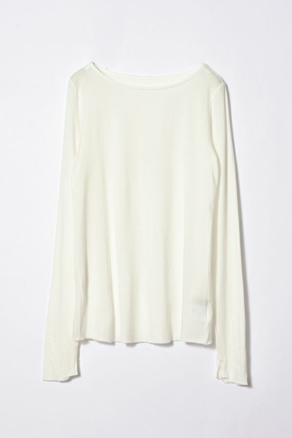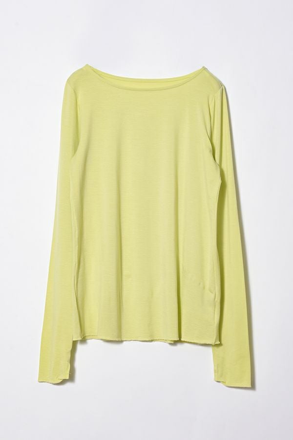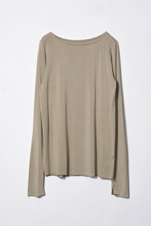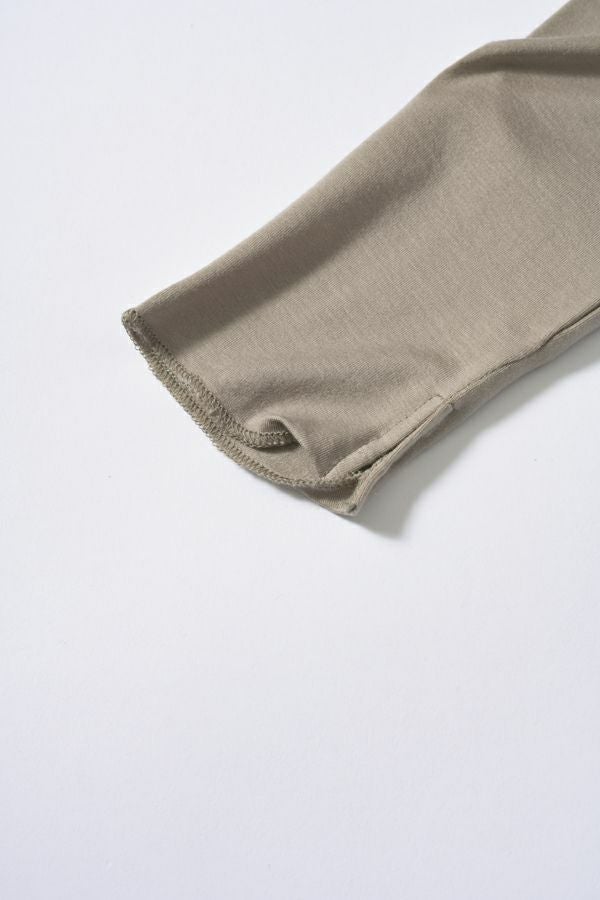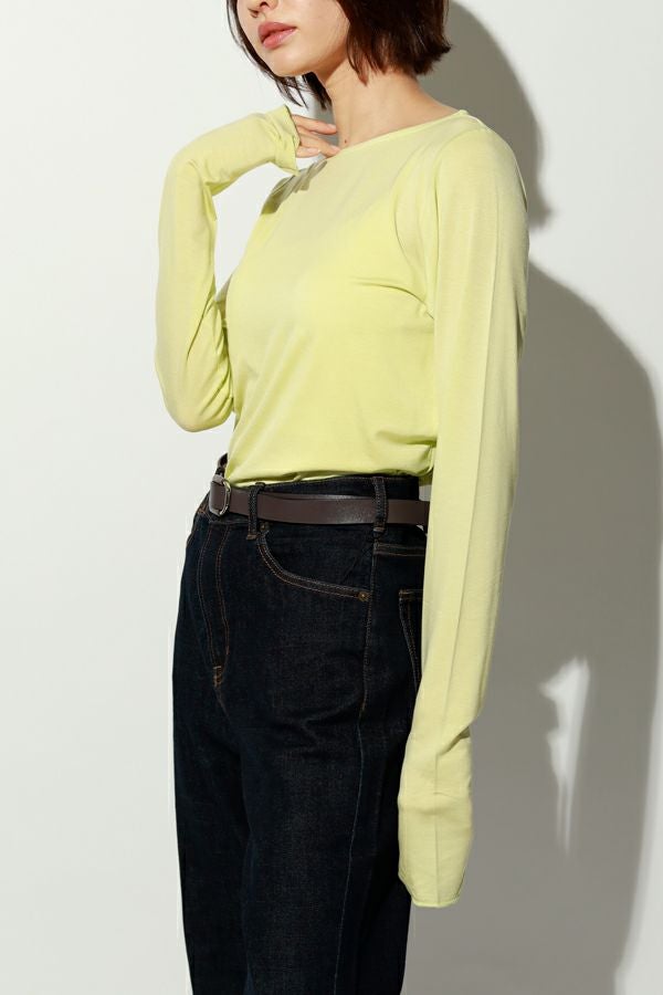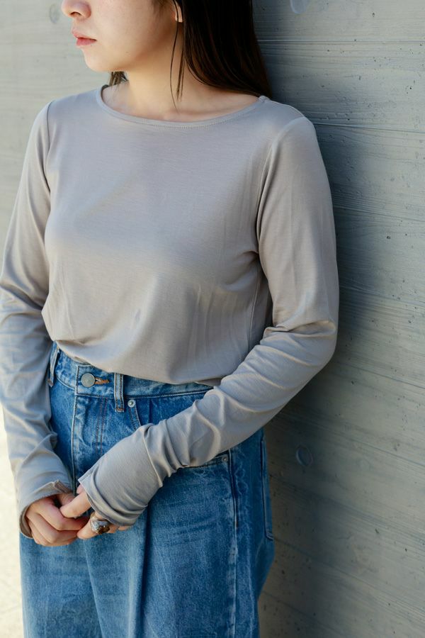 ANGELINA定番 クルーネックロンTEEの登場です!ぬめり感のある上質なテンセルで編まれたベア天竺です。 しっとりした肌触りでとでも柔らかく、保湿性、吸湿性を持ち速乾性が高い素材なので一日中快適なまま過ごせます。 絶妙な透け感が洗練された大人な印象を与えてくれます。シアー素材は色ものでも強くなり過ぎず着回しも利くので差し色として取り入れても上品さを保ち、ベーシックカラーは統一感を持たせるアイテムとしても◎ ジャケットに合わせた時の見え方に拘った首元のあきがポイント。 長めに設定した袖丈は自在に設定出来て万能です。袖口のスリットのさりげなさが使えます! ジャケットなどトラッドなスタイリングにシアーのインナーを持ってくることでソフトなイメージを持たせてくれます。 カジュアルなトレーナーなどとレイヤードする場合は袖口からフリルっぽく見せるディテールコーデで女性らしいワンポイントに。 ●日本製